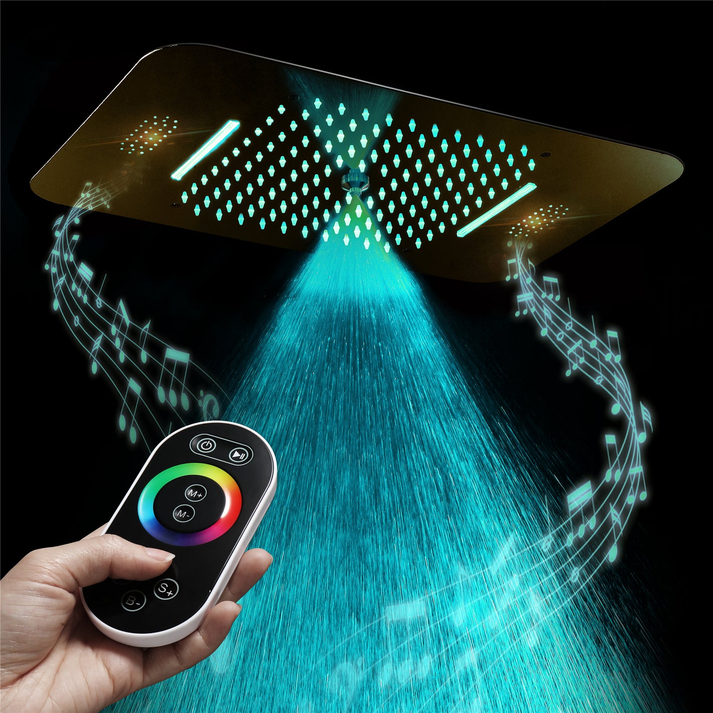 Brushed Gold or matte black or chrome 36-Inch Rainfall Waterfall Water Column Shower Head with Bluetooth Music and 64 LED Lights