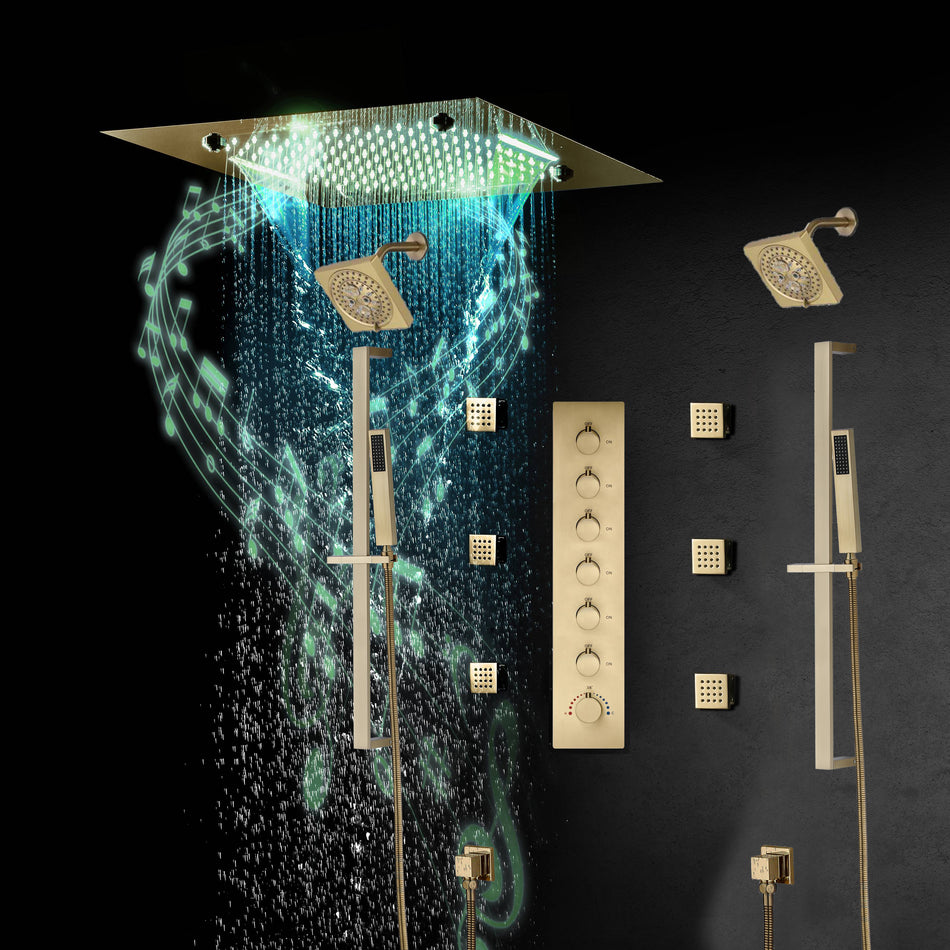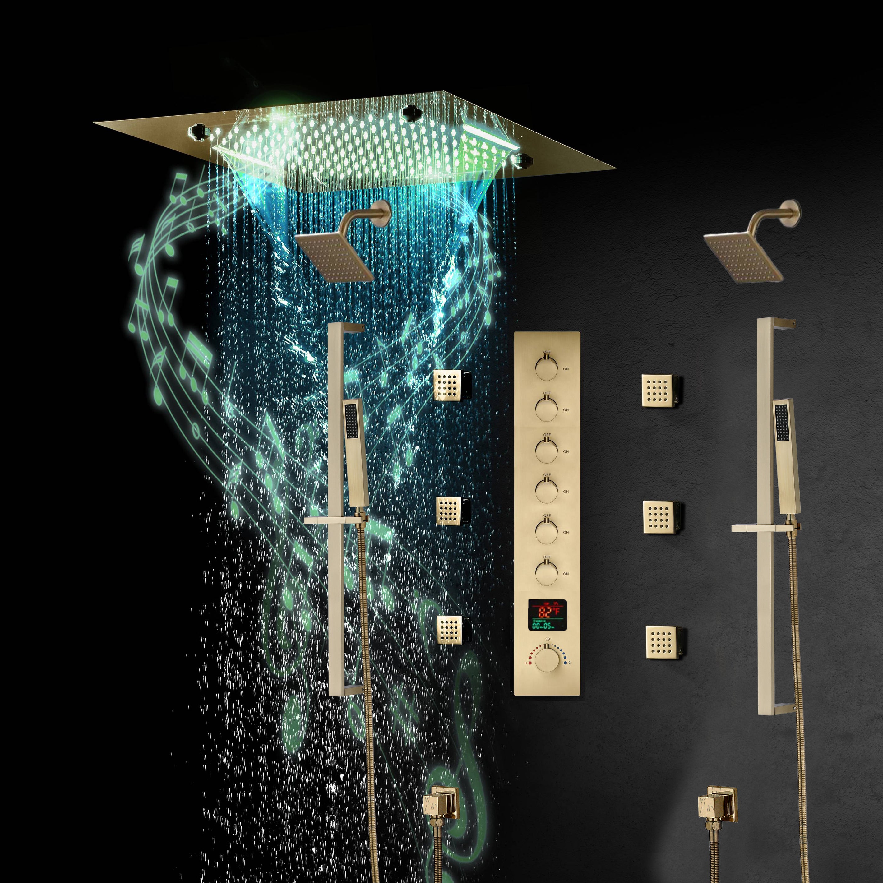 Brushed Gold or Matte Black Or Brushed Nickel 20-Inch Rainfall Shower Head: Bluetooth Music and 64 LED Lights for an Immersive Shower Experience, Flush Mounted for a Sleek Look