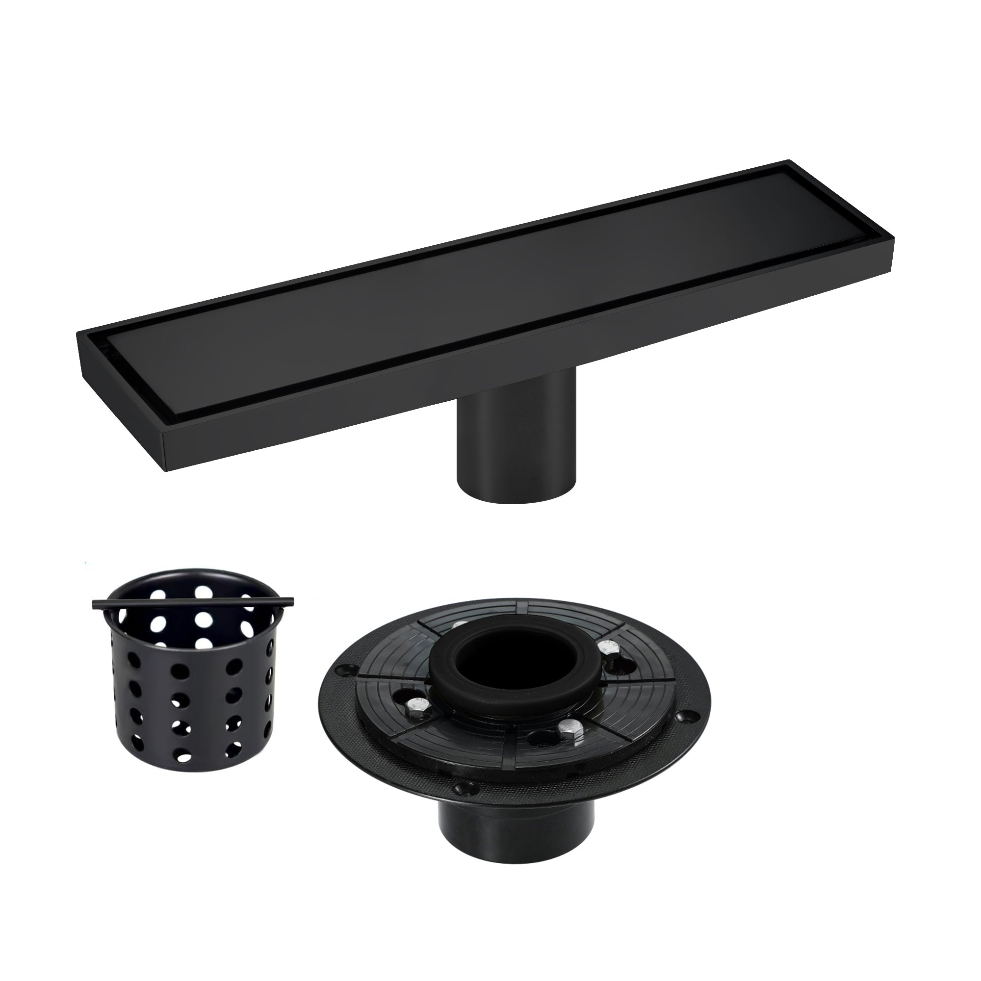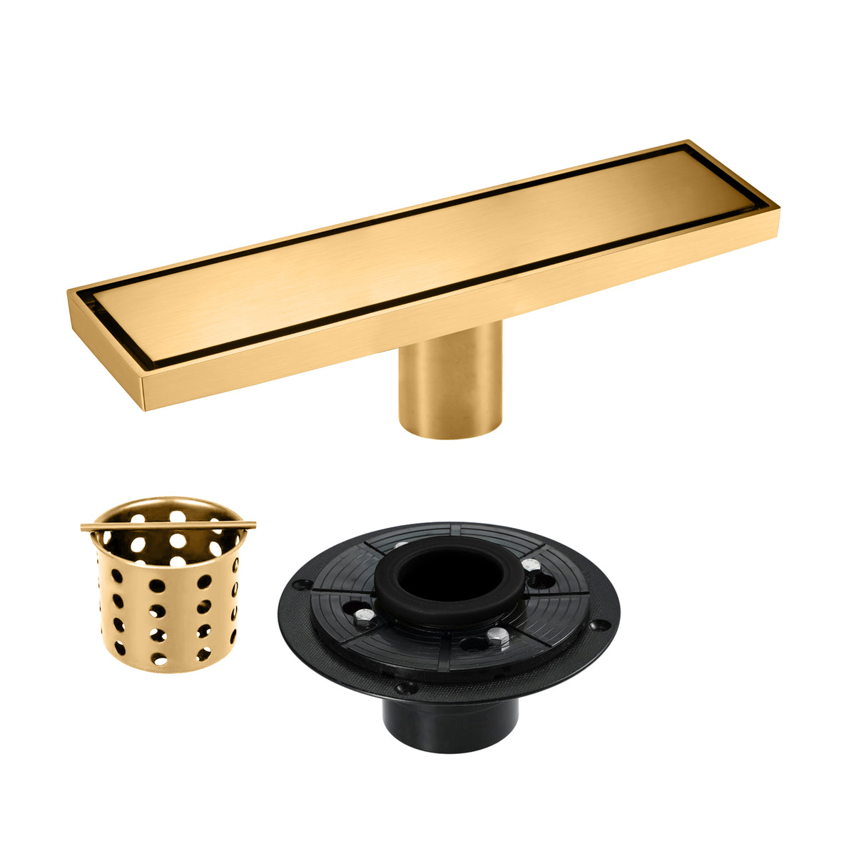 12-Inch Brushed Nickel or Brushed Gold or Matte Black Rectangular Floor Drain - Solid Pattern Cover Grate - Removable - Includes Accessories