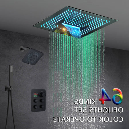 LED and Music Rainfall Waterfall Shower Head: The 16" x 16" shower head is equipped with Bluetooth Music and 64 LED color lights. This feature adds a vibrant display and your favorite tunes to your shower time.