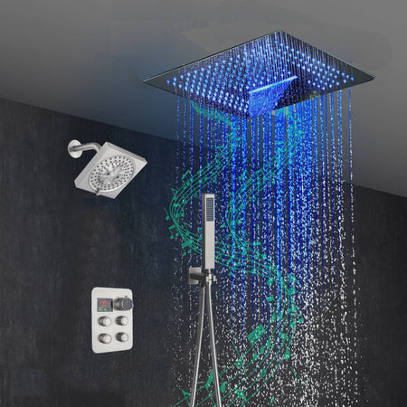 16-Inch Brushed Gold or brushed nickel or matte black Flush Mount rainfall waterfall Shower Faucet Set: 4-Way Thermostatic Control, 64-Color LED Lights, Bluetooth Music, and Regular Head