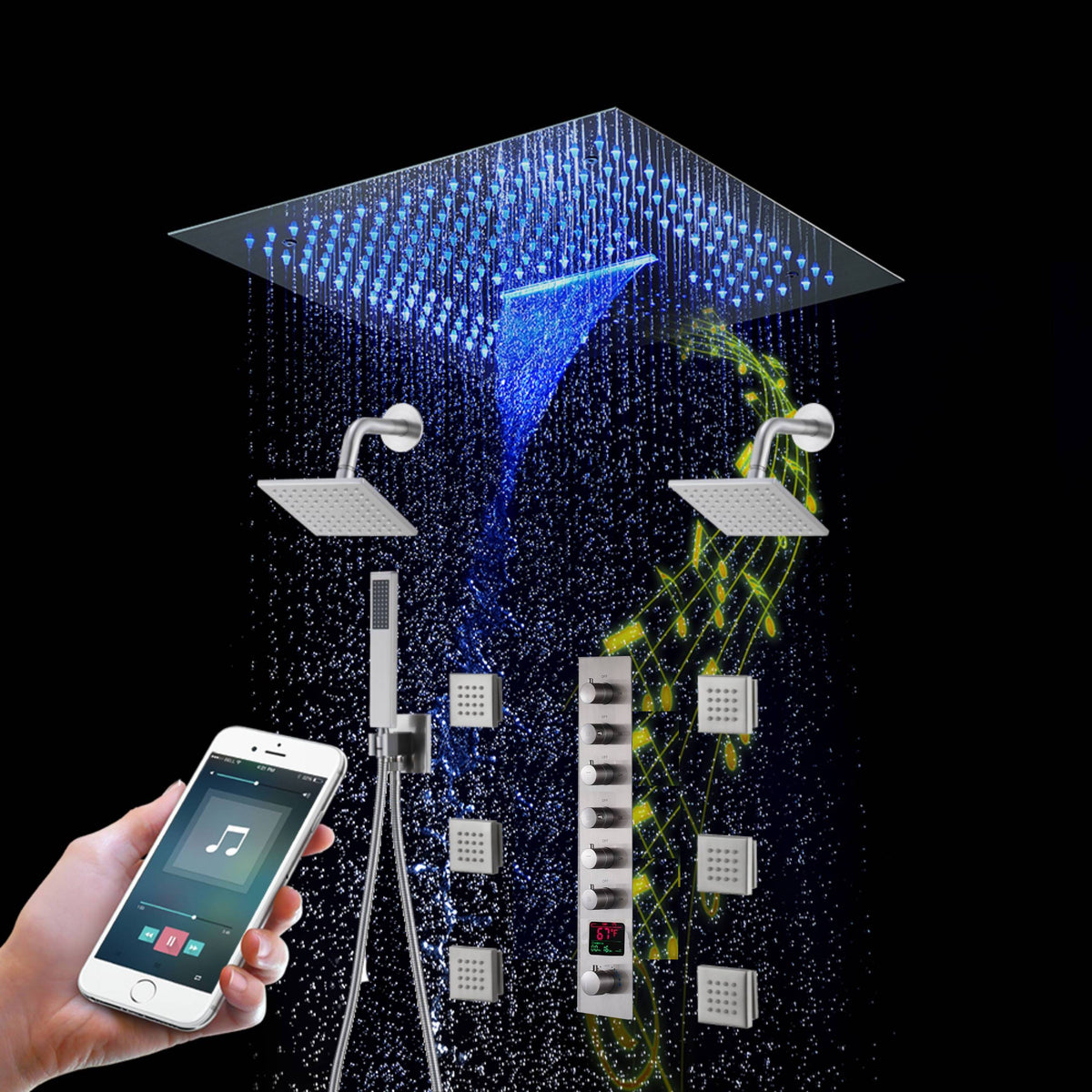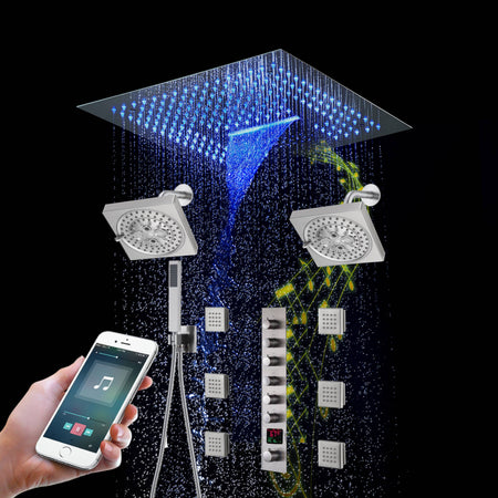 16" Brushed Nickel Flush Mount Shower System: 6-Way Thermostatic Valve, Dual Heads, 6 Body Jets
