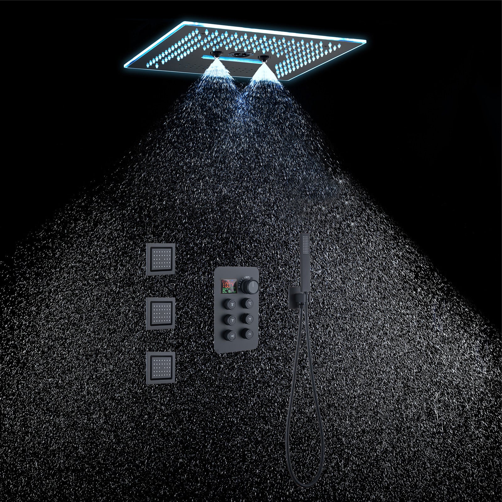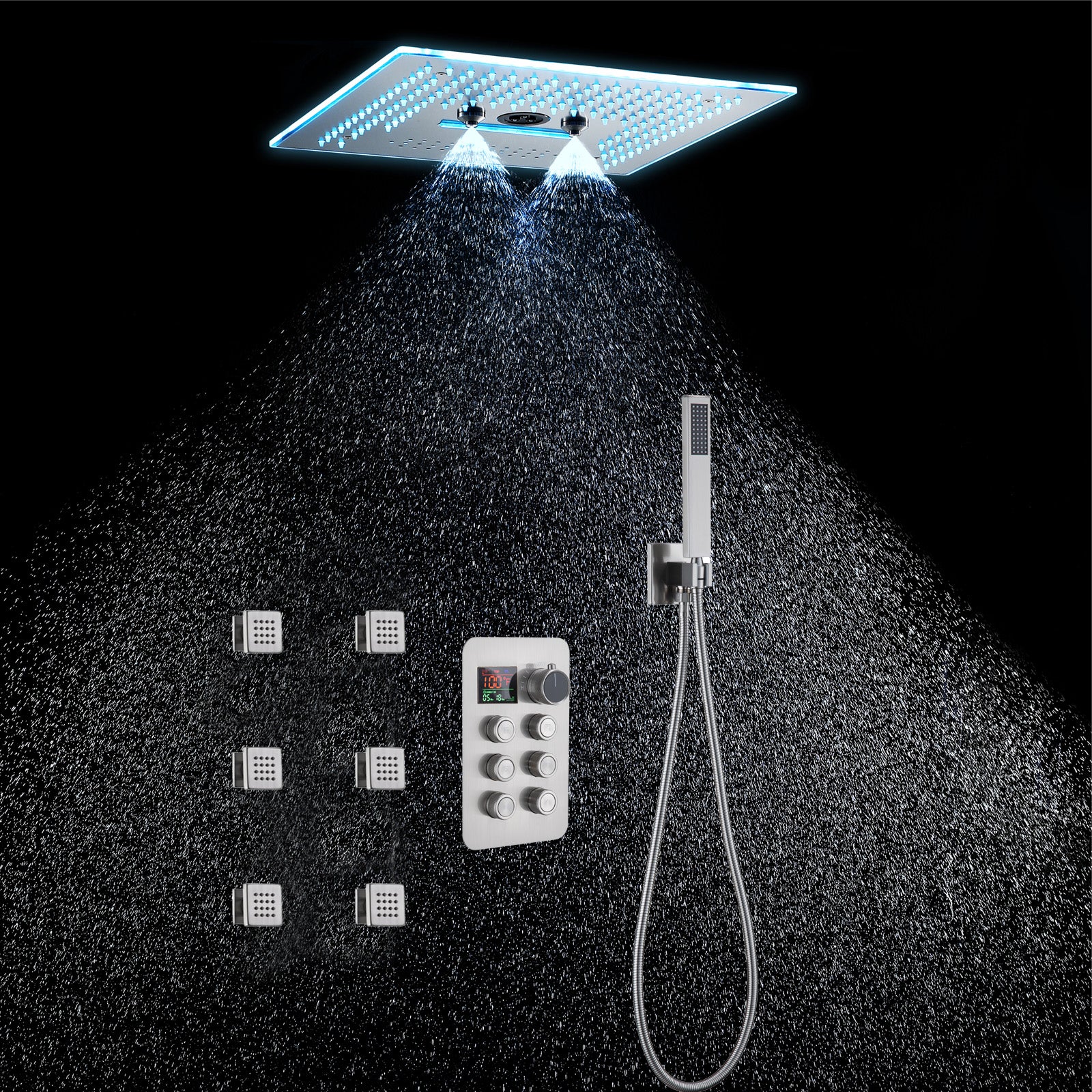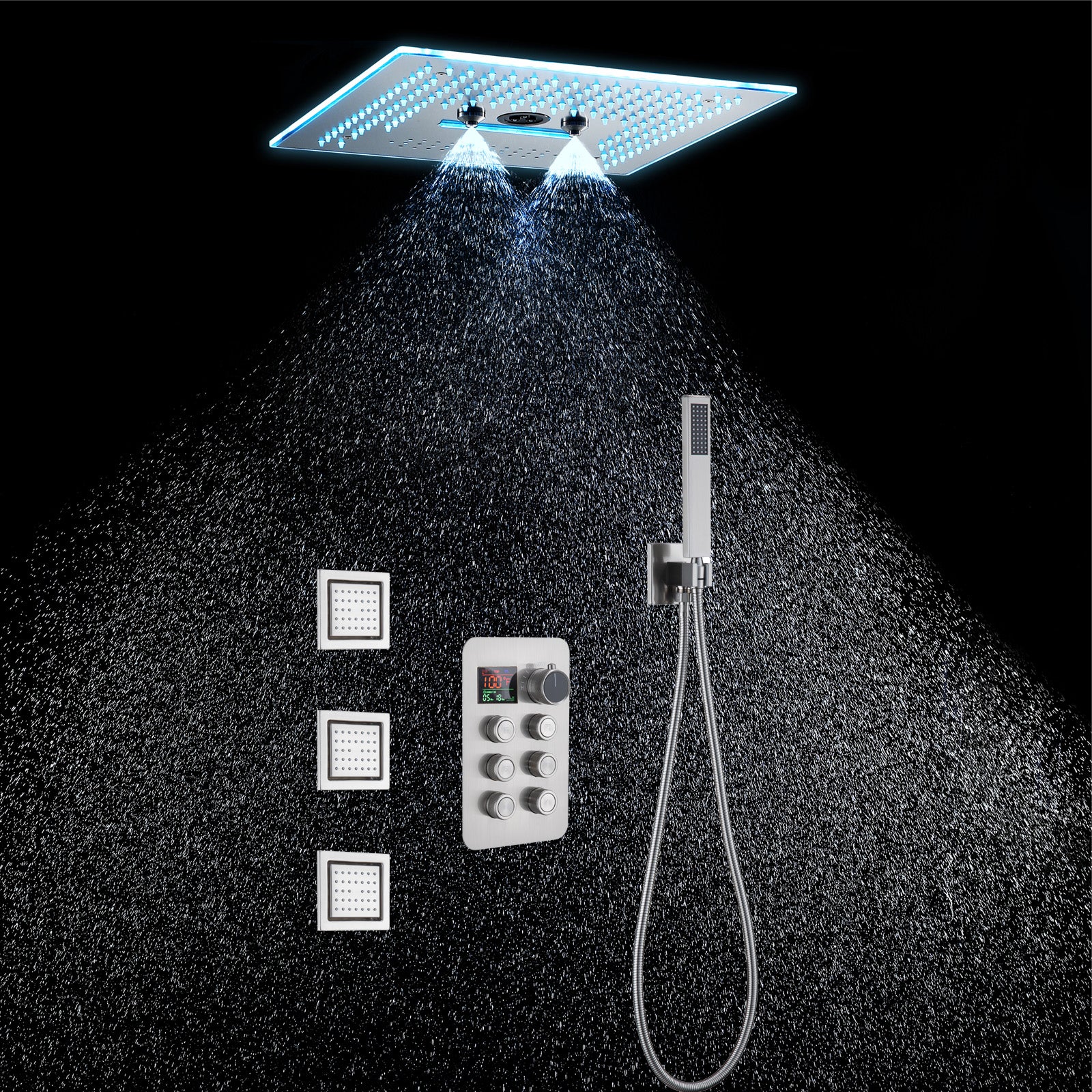 2. LED Bluetooth Music Shower Head: The 16-inch rainfall waterfall shower head features a Bluetooth music capability and 64 LED lights, enhancing your showering experience with a full spectrum of color and sound. The LED lights can be controlled via a remote panel or touch panel.