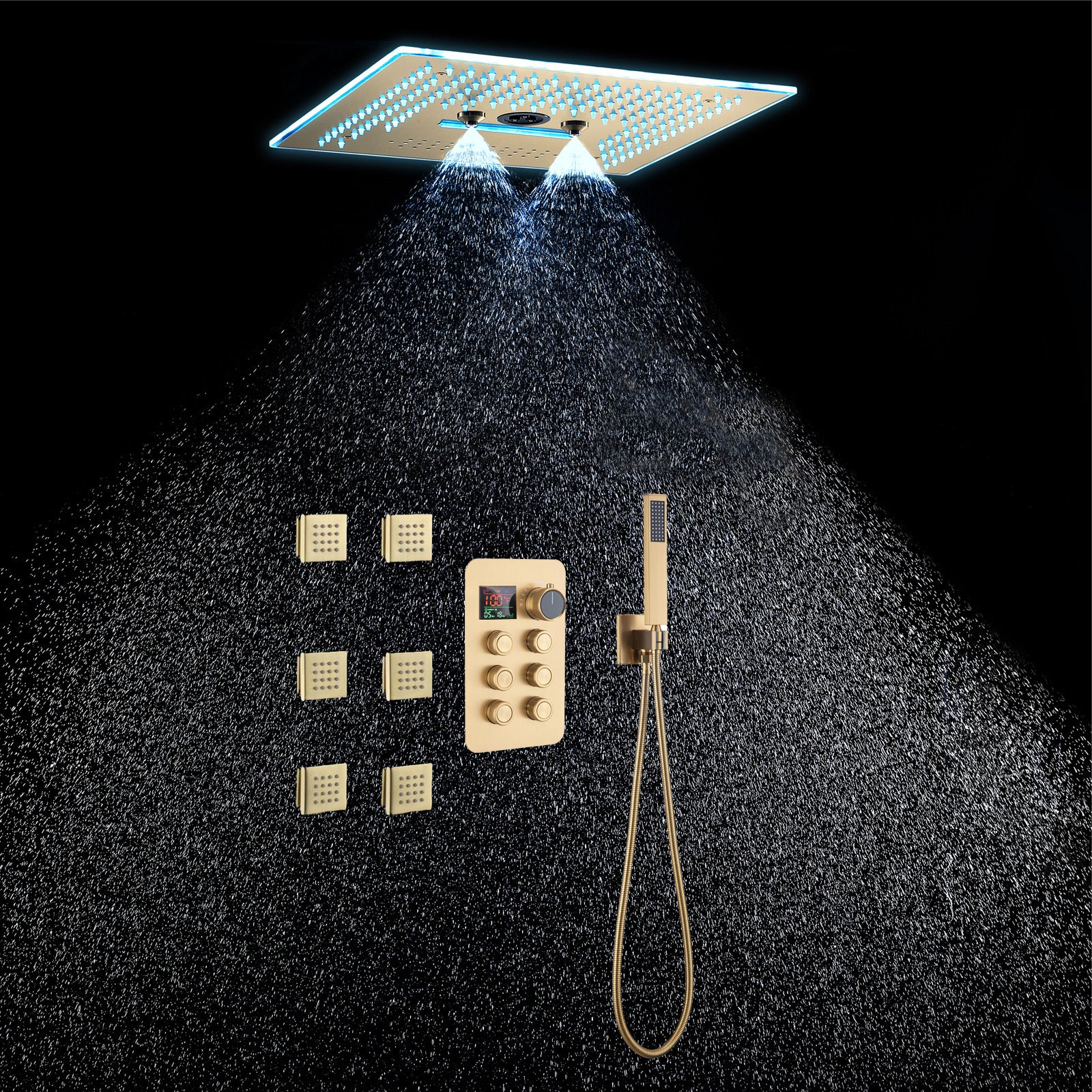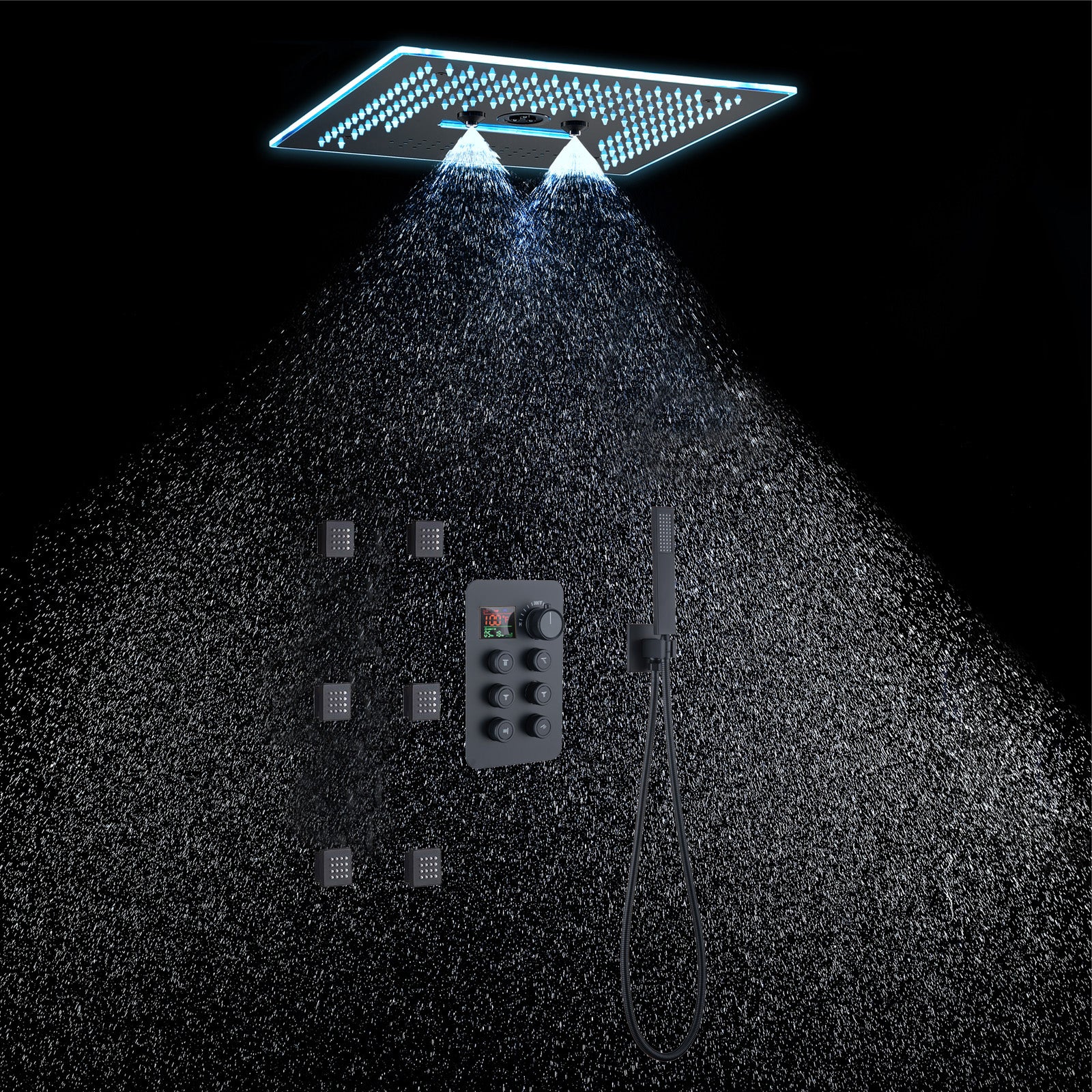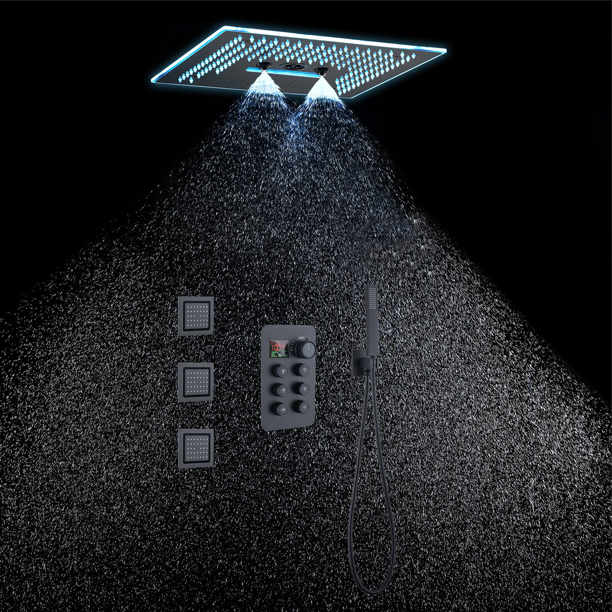 2. LED Bluetooth Music Shower Head: The 16-inch rainfall waterfall shower head features a Bluetooth music capability and 64 LED lights, enhancing your showering experience with a full spectrum of color and sound. The LED lights can be controlled via a remote panel or touch panel.