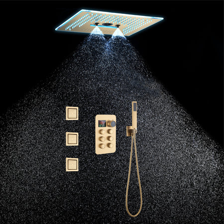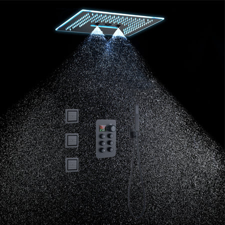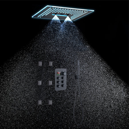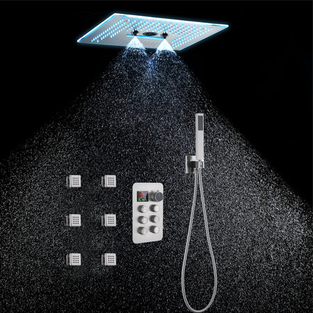 16-Inch Rainfall Waterfall Mist Water Column Flush Mount Shower Faucet Set with 6-Way Thermostatic Control, 64-Color LED, Bluetooth Music, Rainfall-Waterfall-Mist Features, Rotating Hydro Jet, and Body Jets