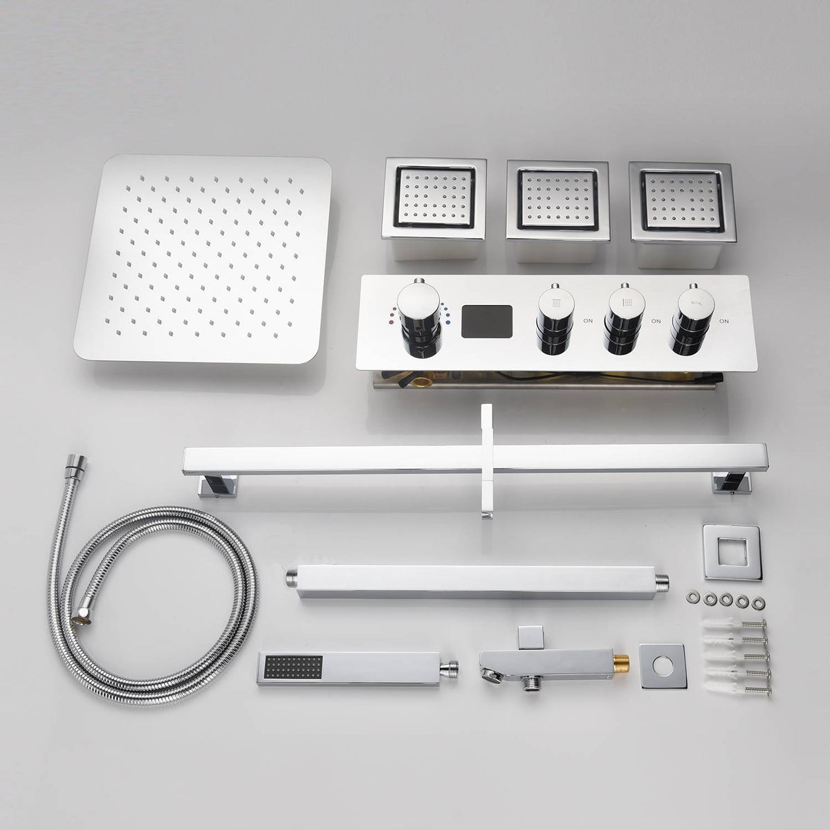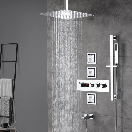 Chrome Ceiling Mount 12-Inch or 16-Inch Rain Shower System: LED or Non-LED, 3-Way Digital Thermostatic Control, Sliding Bar, and 4-Inch Body Jets