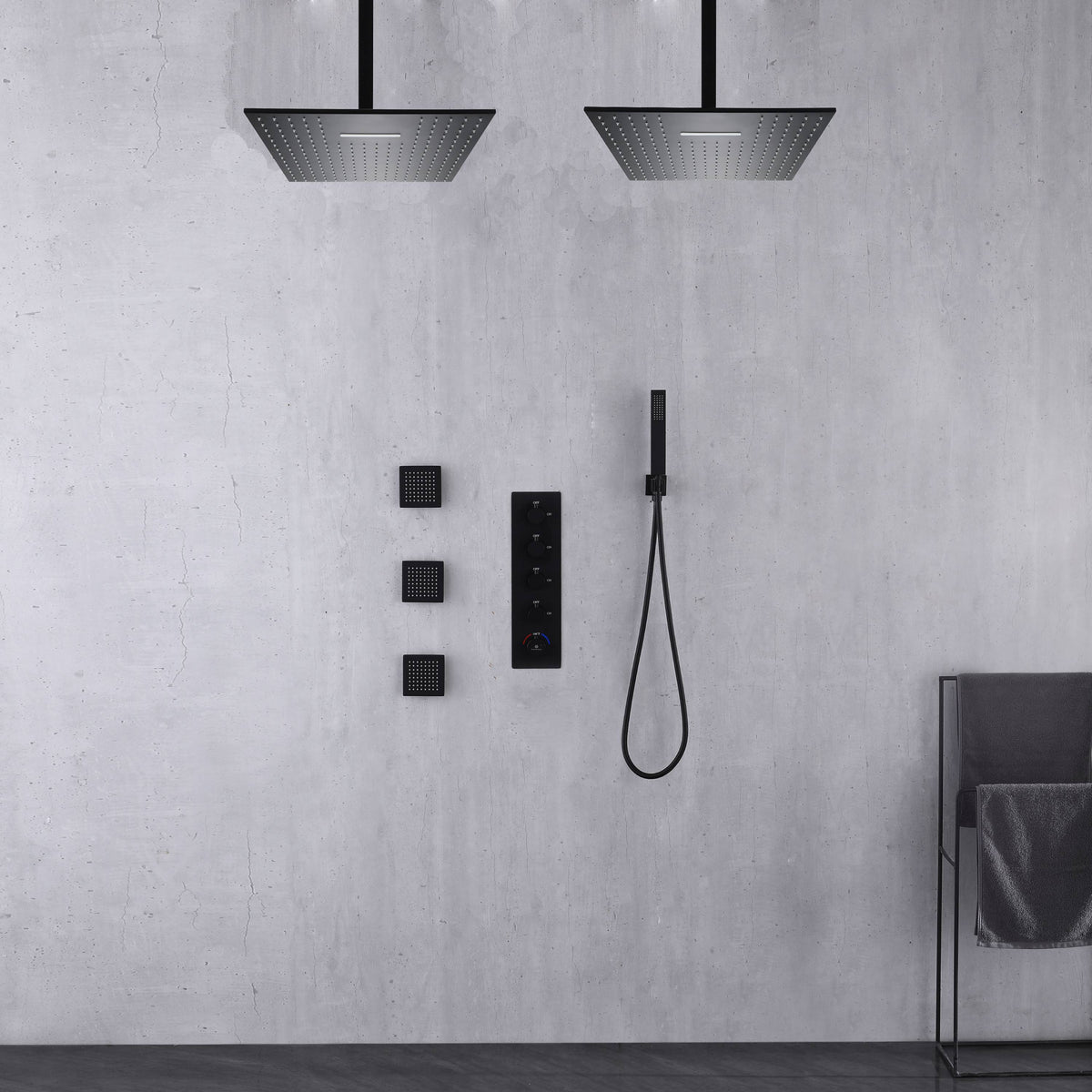 12 inch or 16 inch Matte Black Rainfall or Rainfall Waterfall Shower System - 4-Way Thermostatic Rough-in Valve with Invigorating Body Jets