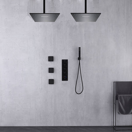 Experience the Ultimate Shower Luxury with our Matte Black Rainfall or Rainfall waterfall Shower System - 4-Way Thermostatic Rough-in Valve with Body Jets. Immerse yourself in a shower experience like no other, enhanced by the sleek and sophisticated matte black finish.