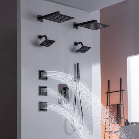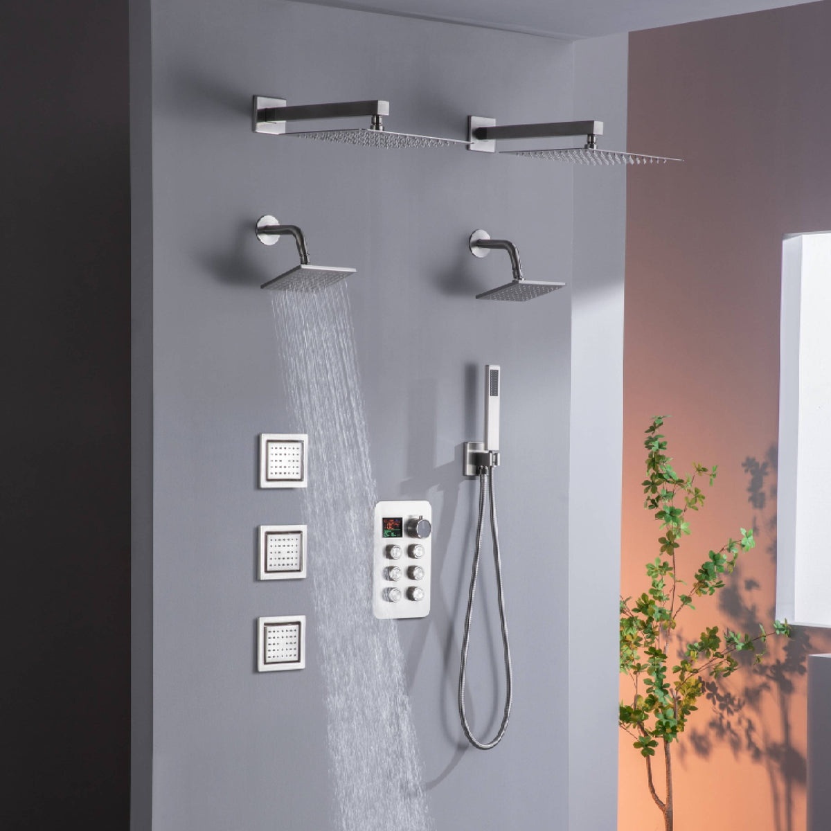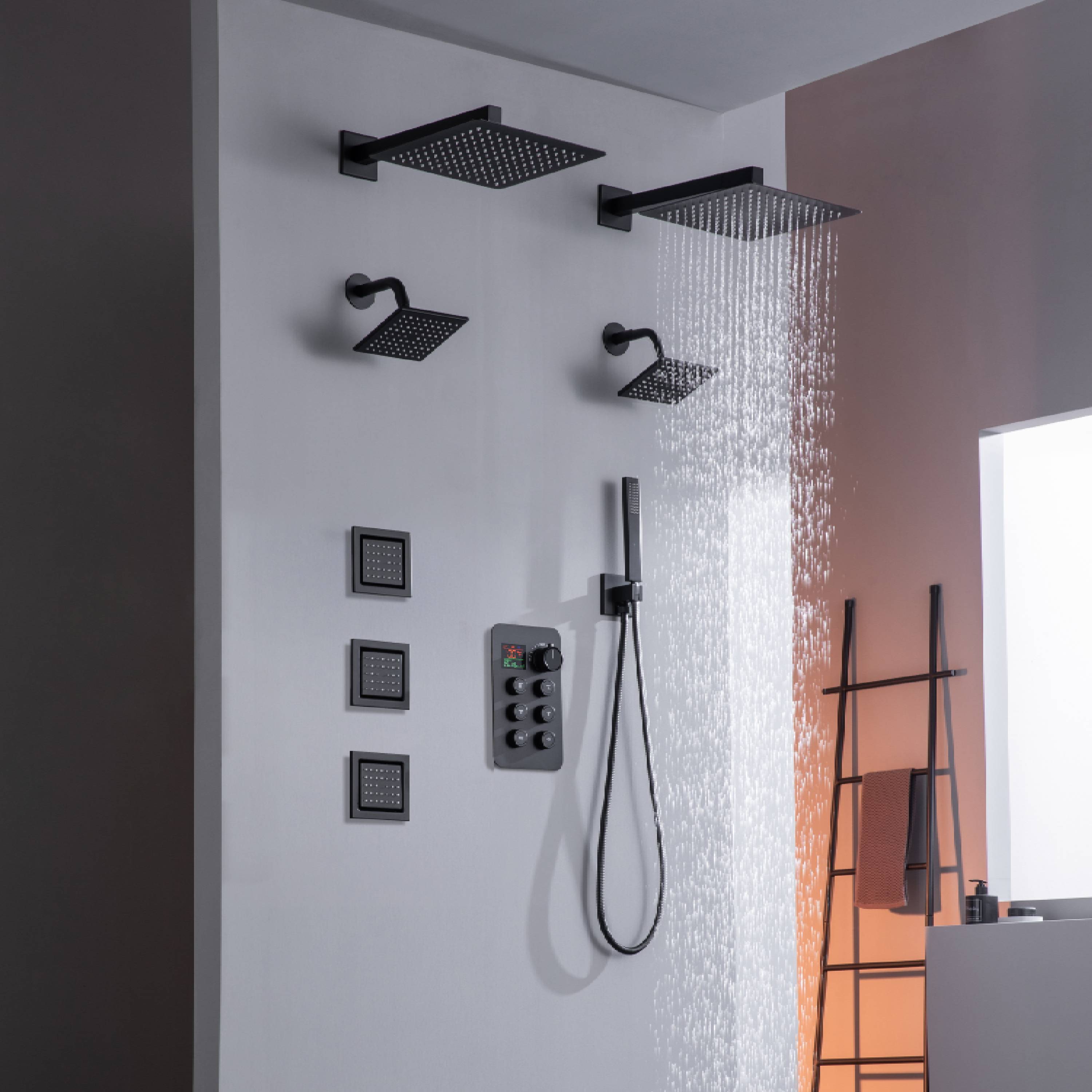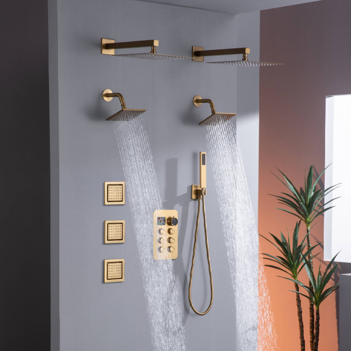 matte black or brushed gold or brushed nickel dual rainfall head 6 way digital display shower faucet with dual 6'' regular heads and 4'' body jets