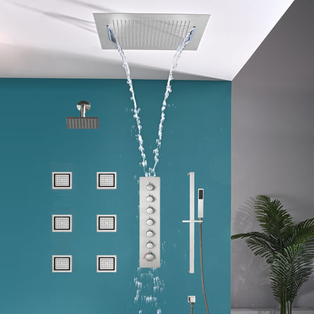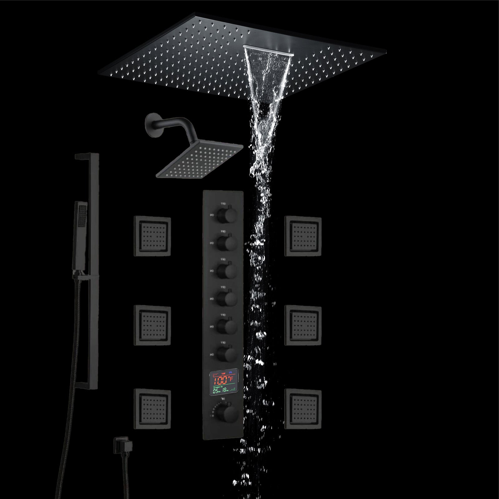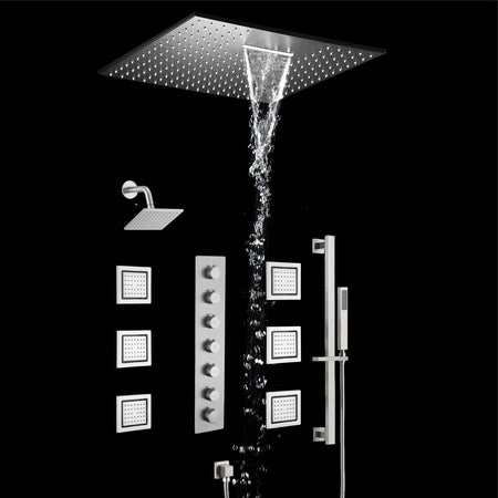20 inch  flush-mount or ceiling mount rainfall waterfall shower systems 6 way thermostatic valve with 6 body jets and sliding bar and  regular head
