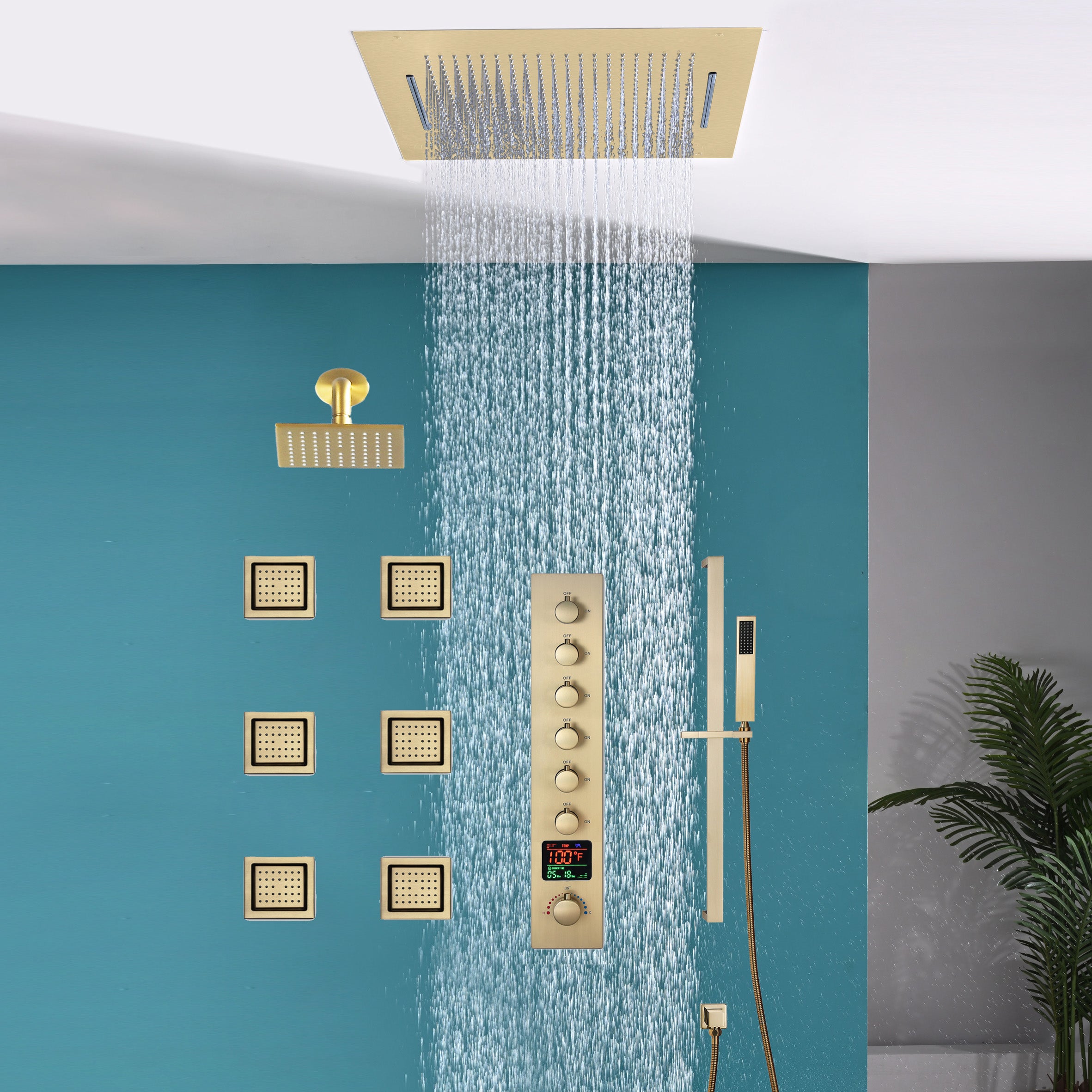 20 inch flush-mount or ceiling mount rainfall waterfall shower systems 6 way thermostatic valve with 6 body jets and sliding bar and regular head
