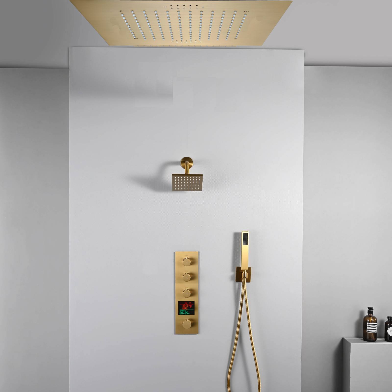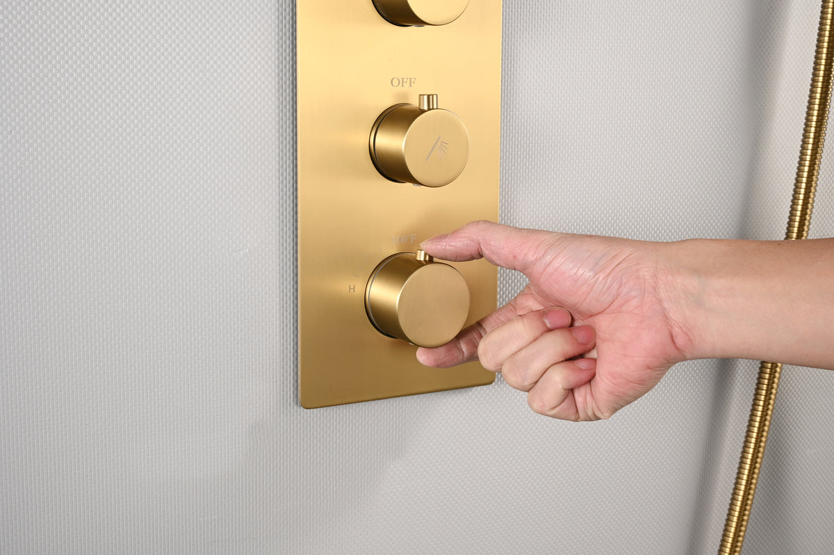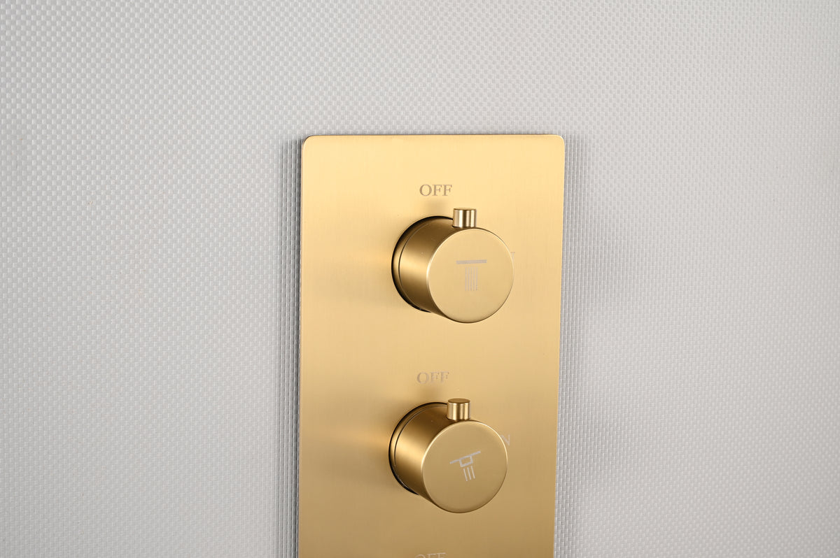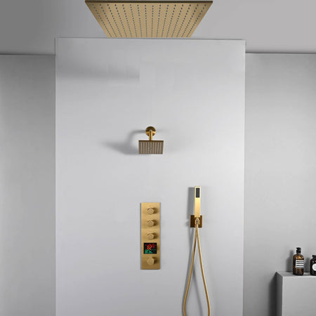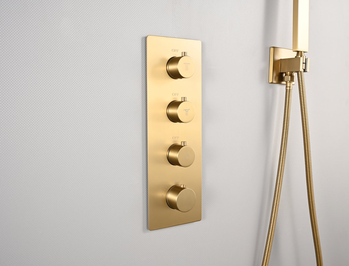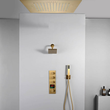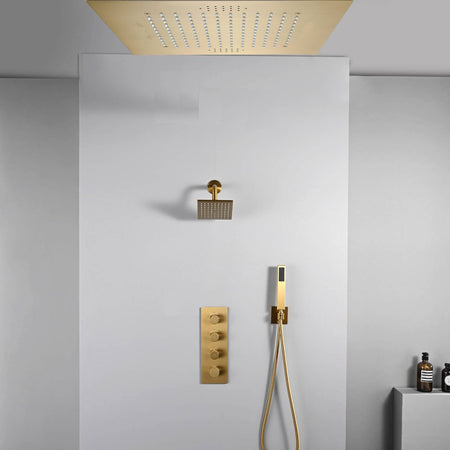 20 inch ceiling or flush mount Brushed gold 3 way thermostatic shower faucet with high pressure 6 '' head and handle sprayer