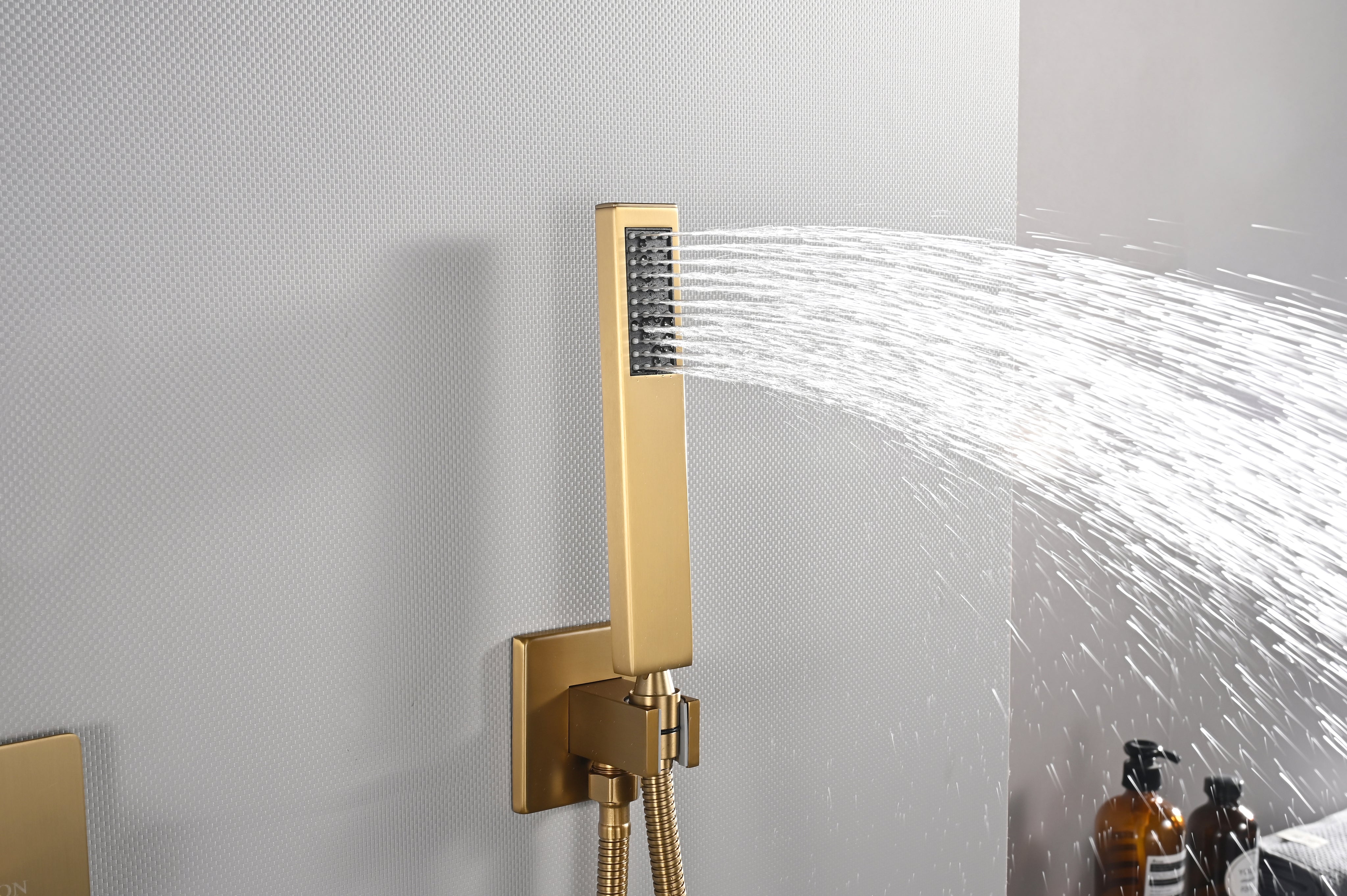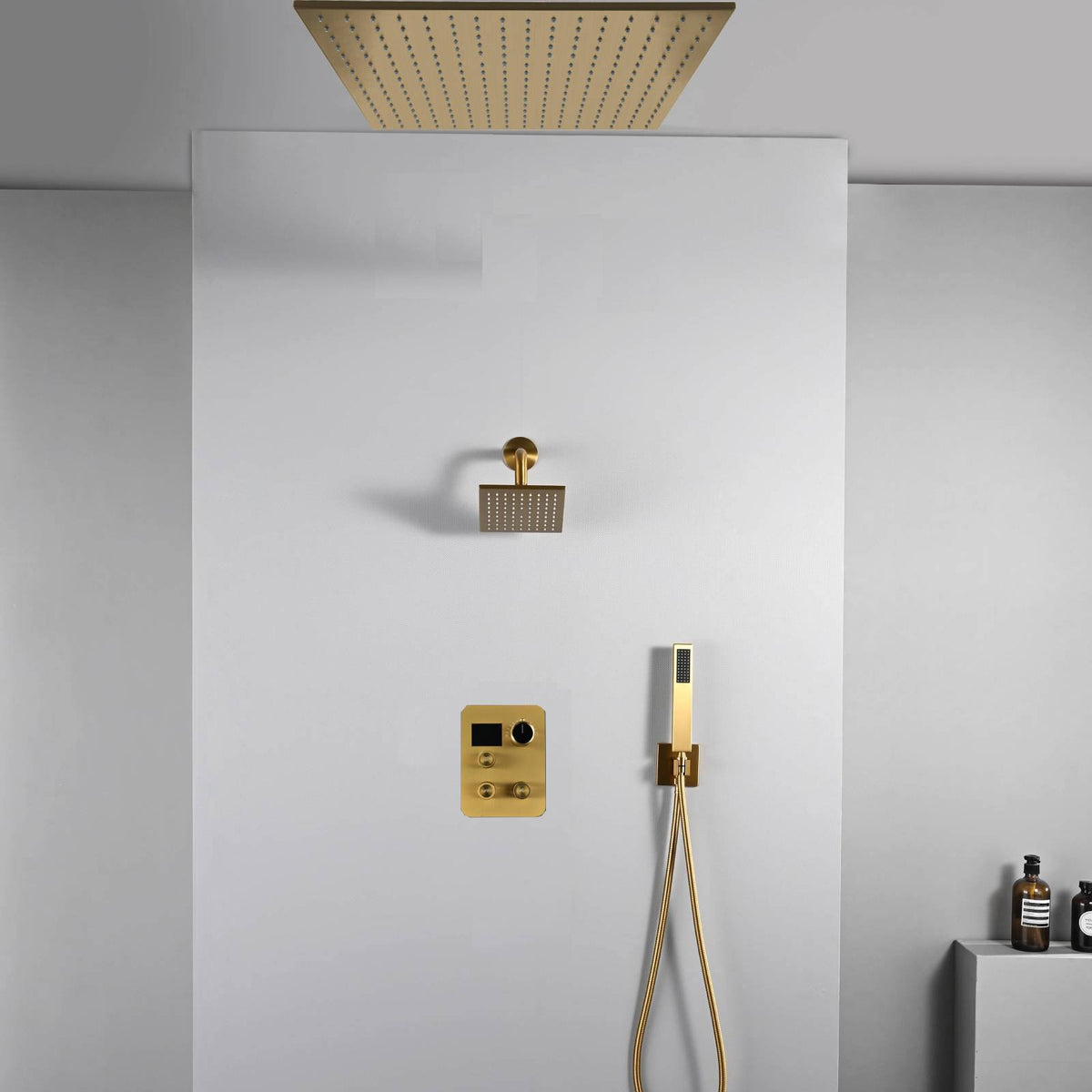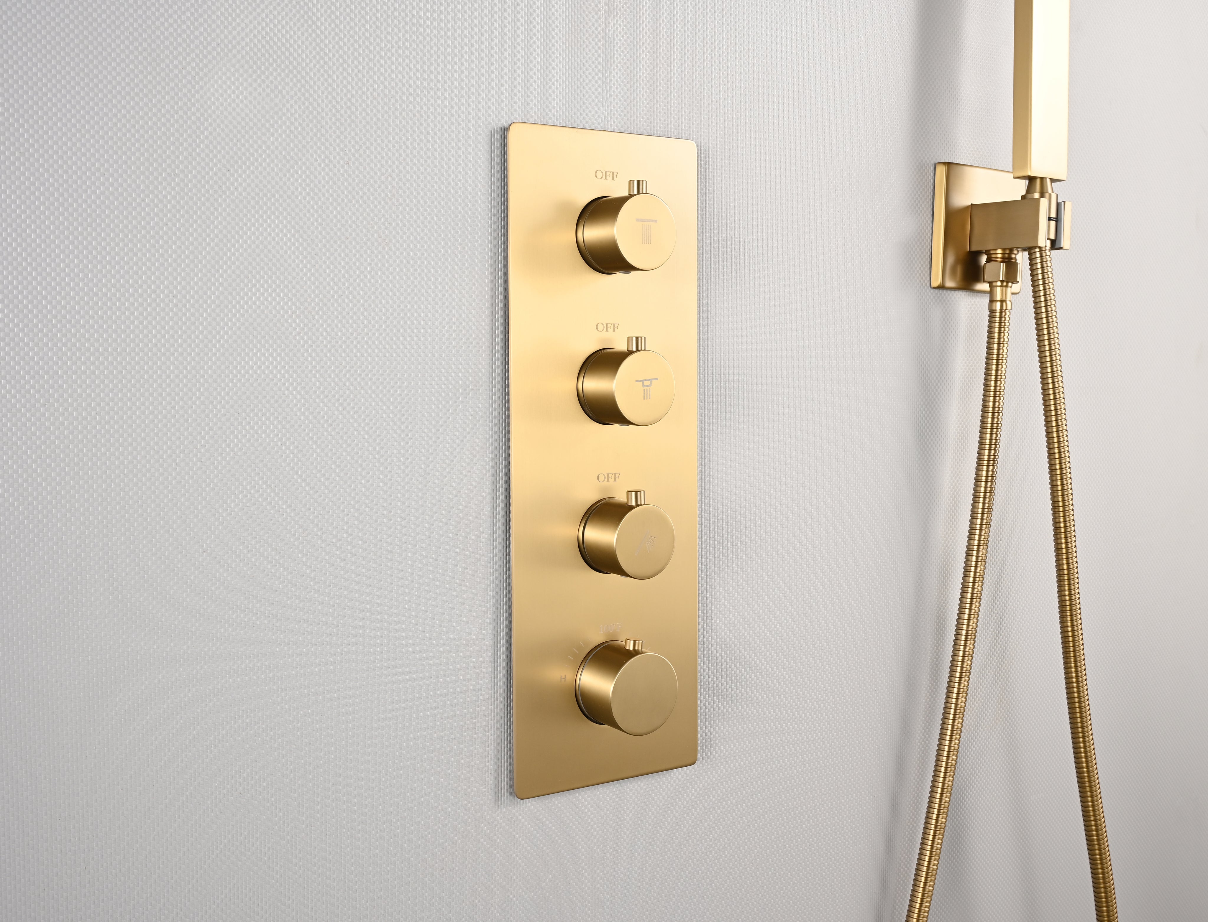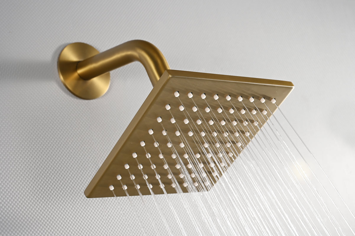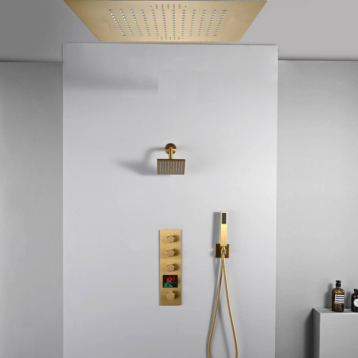 20 inch ceiling or flush mount Brushed gold 3 way thermostatic shower faucet with high pressure 6 '' head and handle sprayer