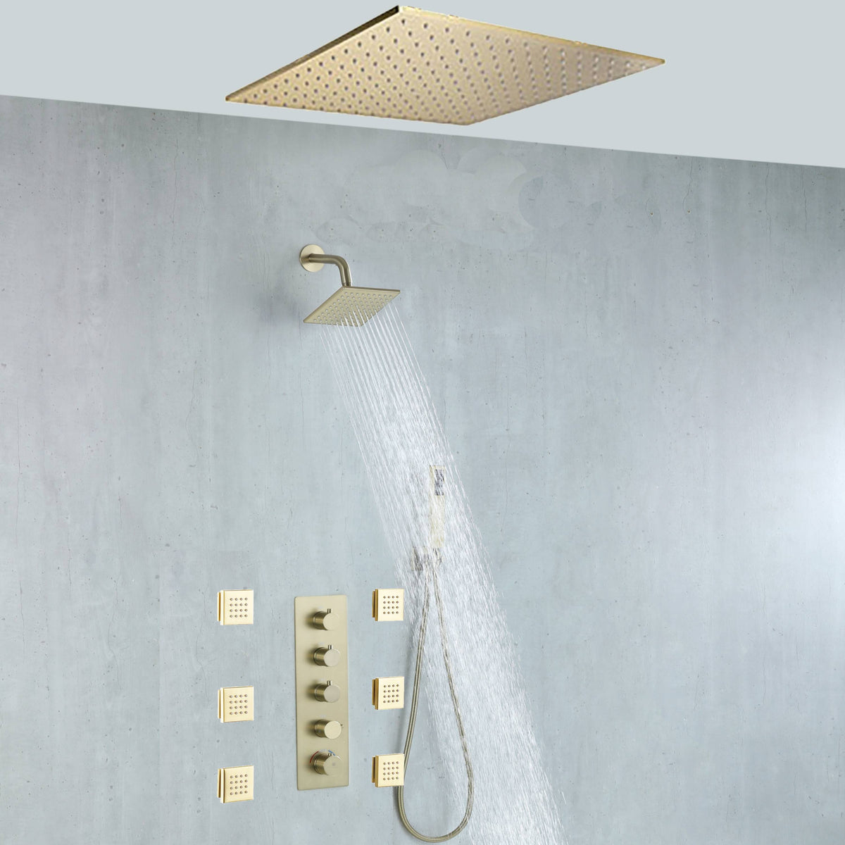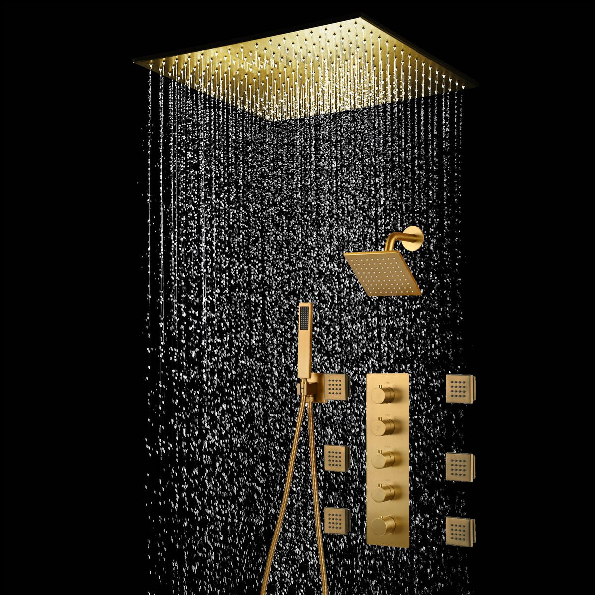 20 inch ceiling mount Brushed gold 4 way thermostatic shower faucet with high pressure 6 '' head and 4 inch body jets and handle sprayer