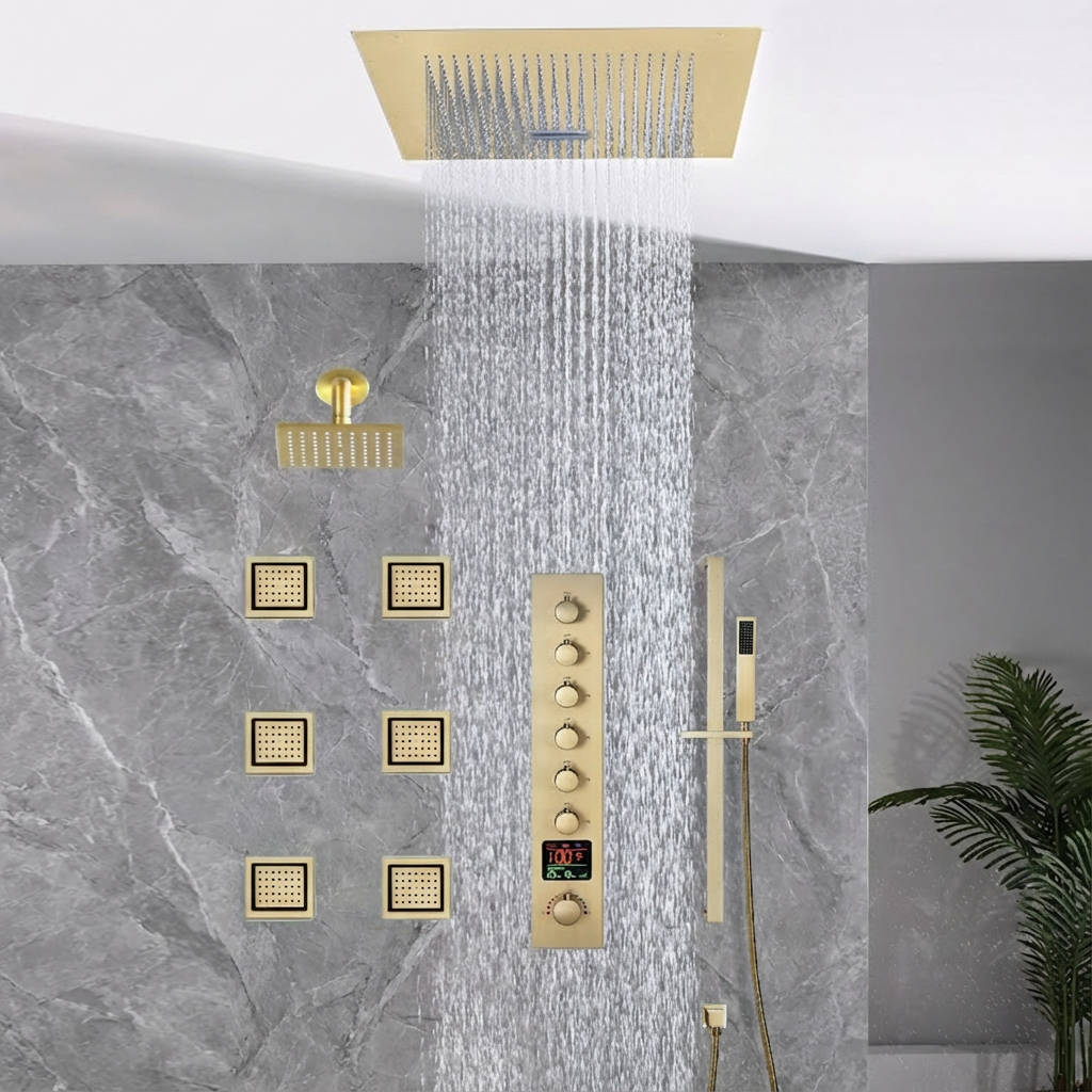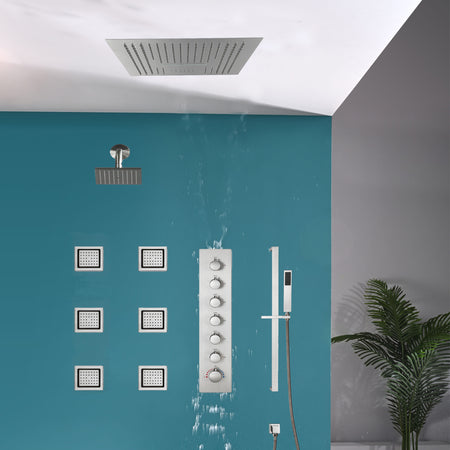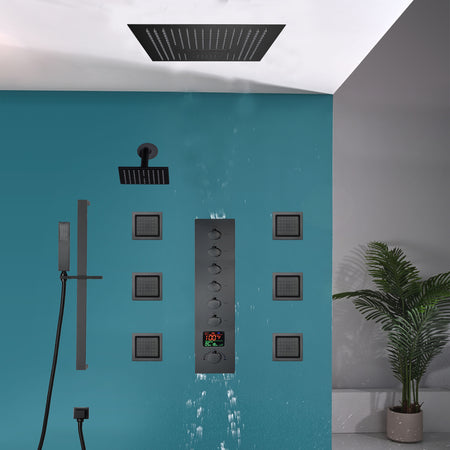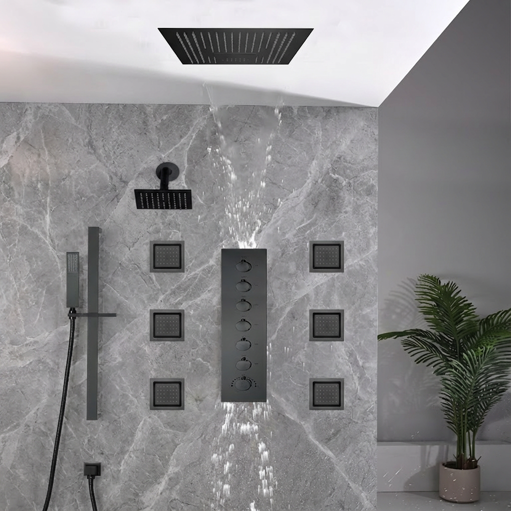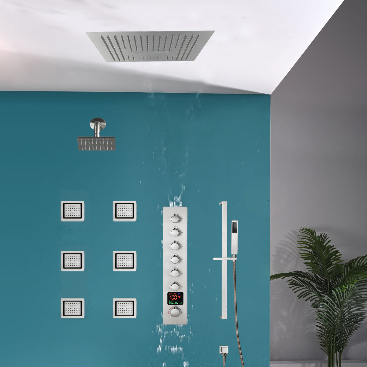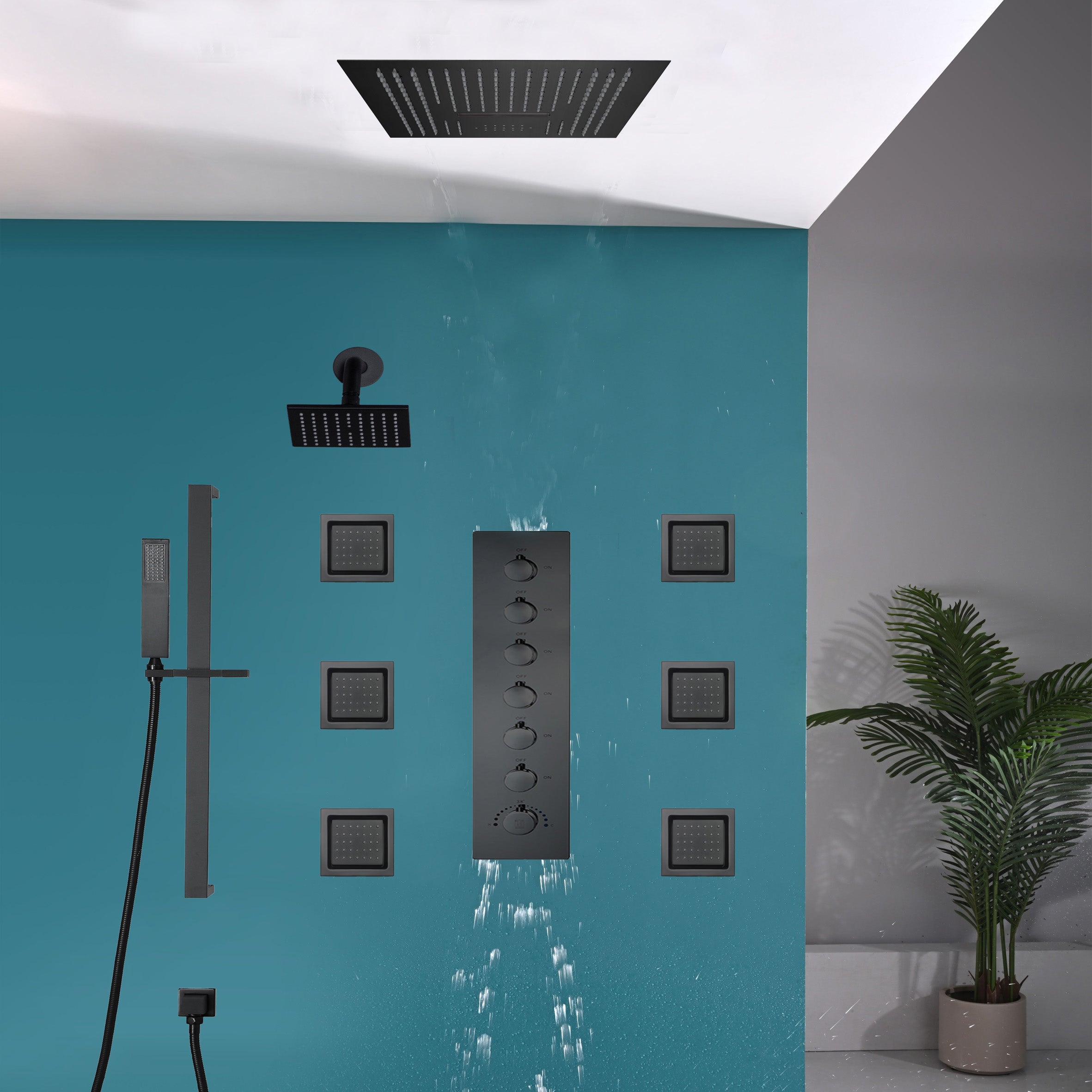 16 inch flush-mount or ceiling mount rainfall waterfall shower systems 6 way thermostatic valve with 6 body jets and sliding bar and regular head