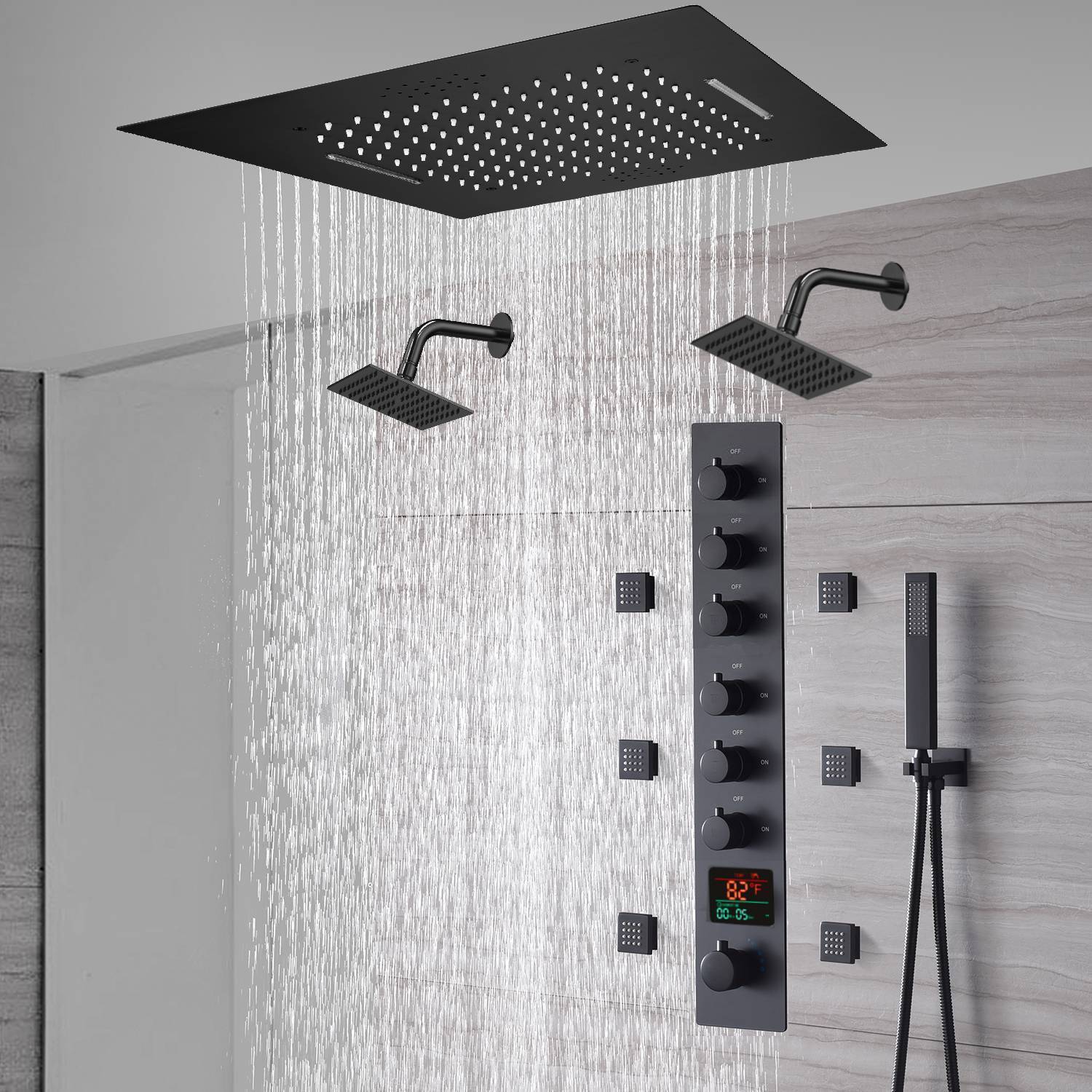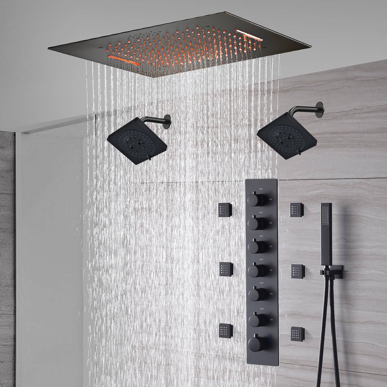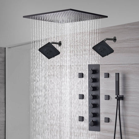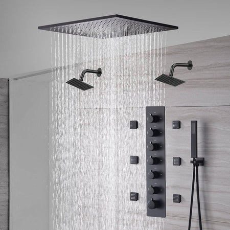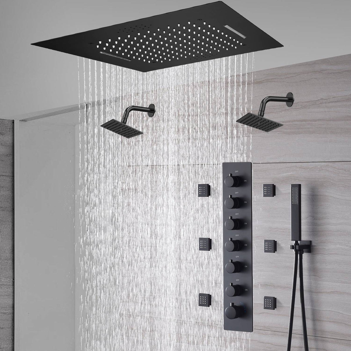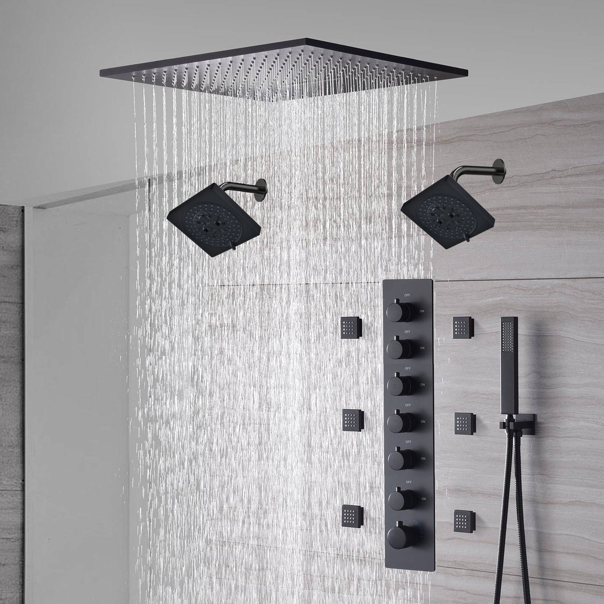 20-Inch or 24-Inch Matte Black Flush or Ceiling Mount Rainfall Waterfall Shower System: Complete with 6-Way Thermostatic Valve and 6 Body Jets and Dual Regular Head