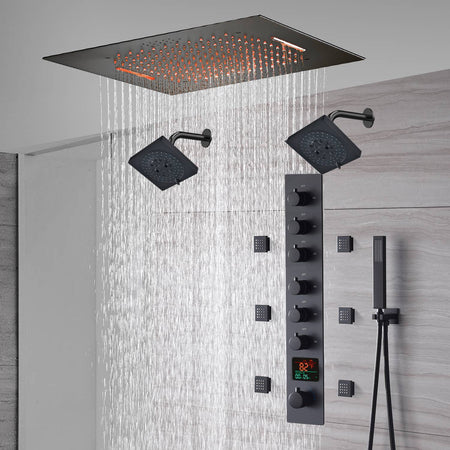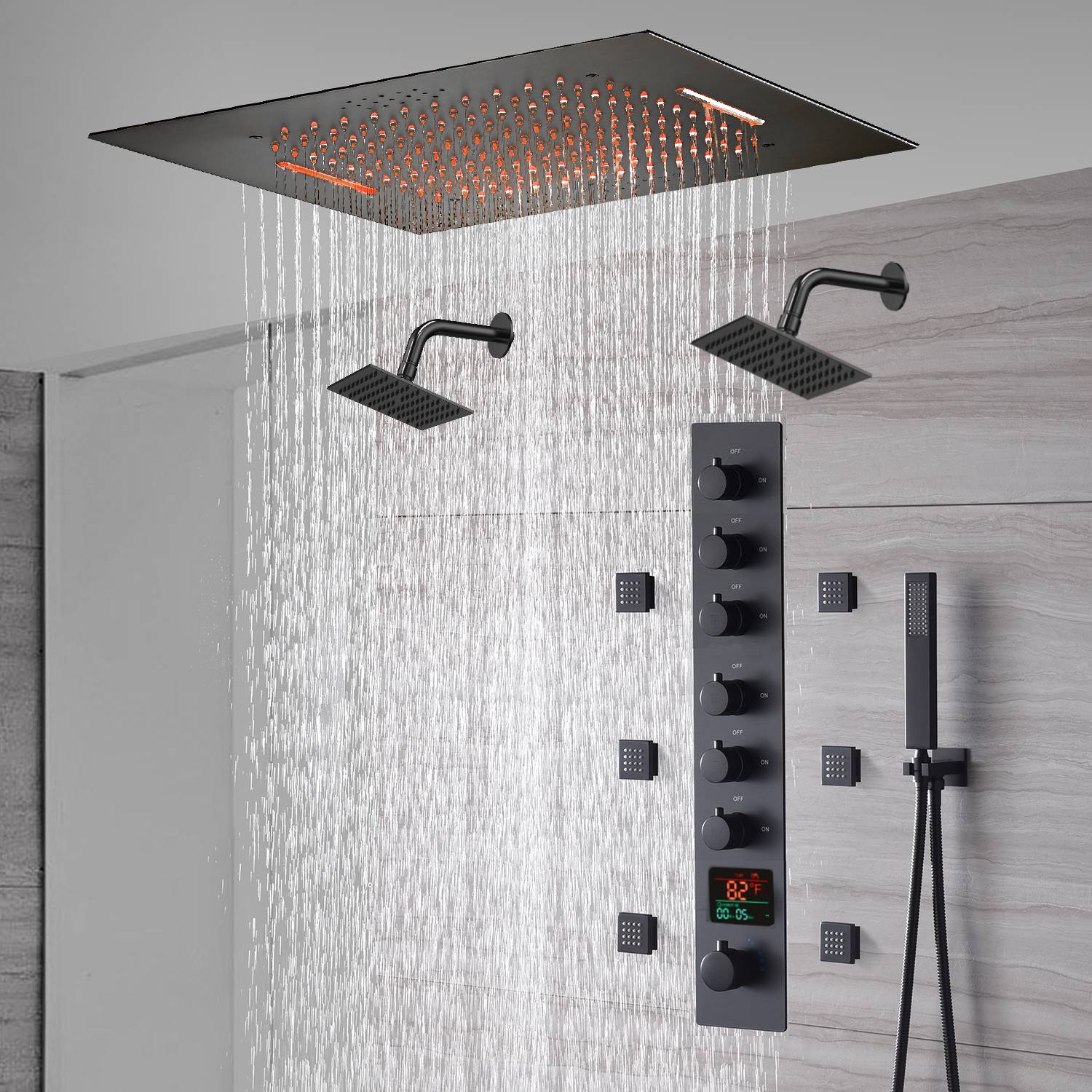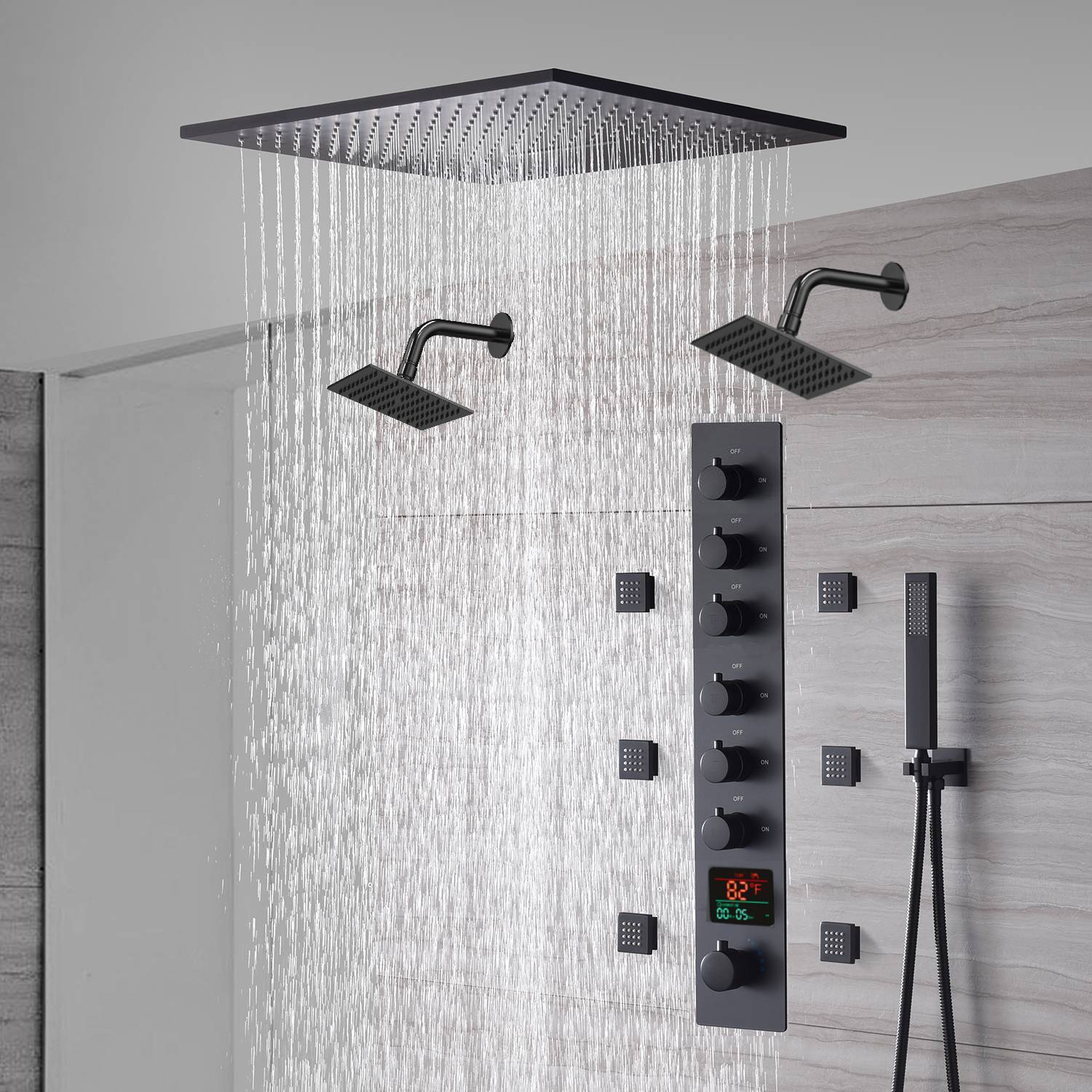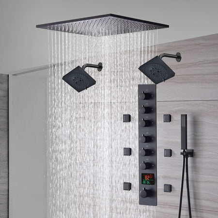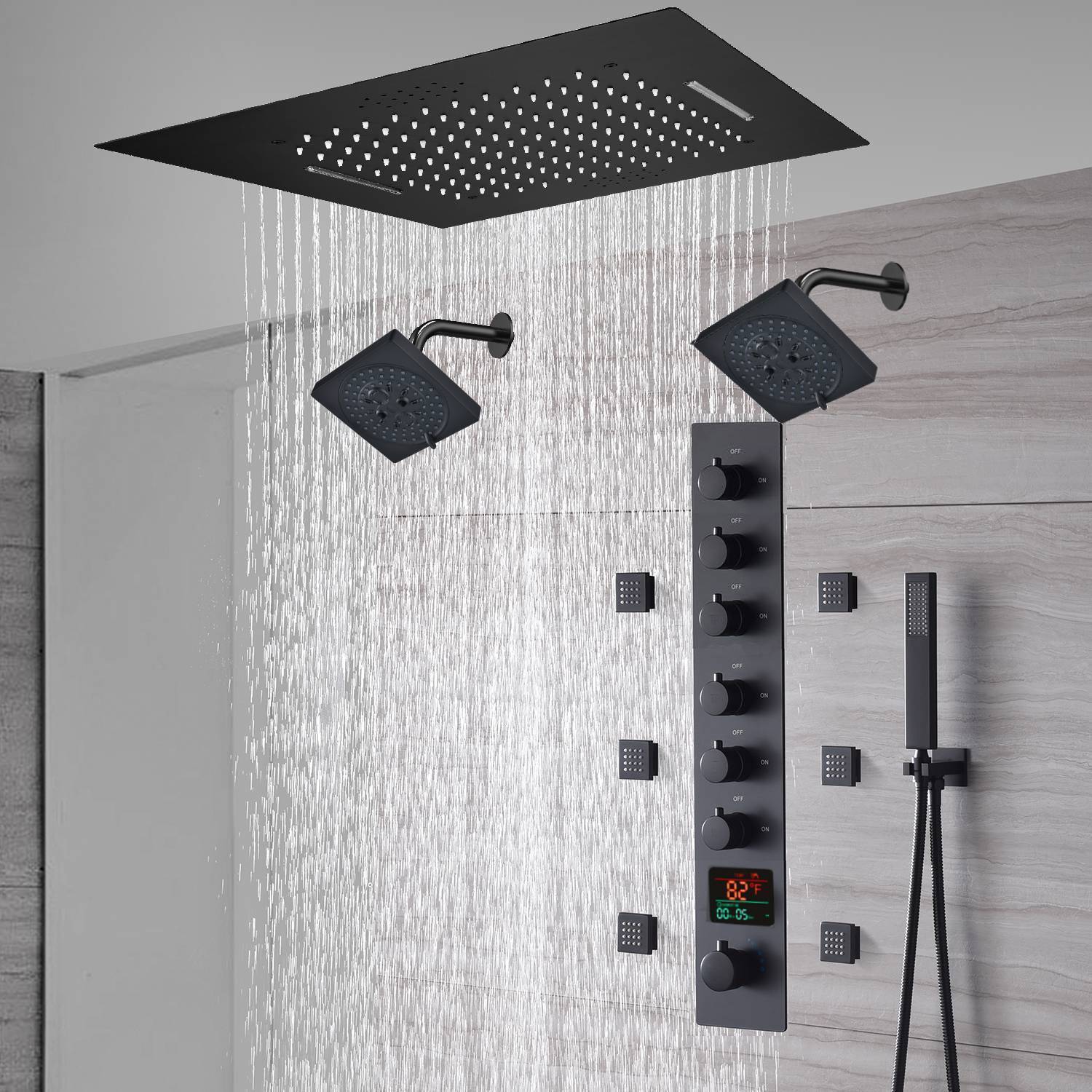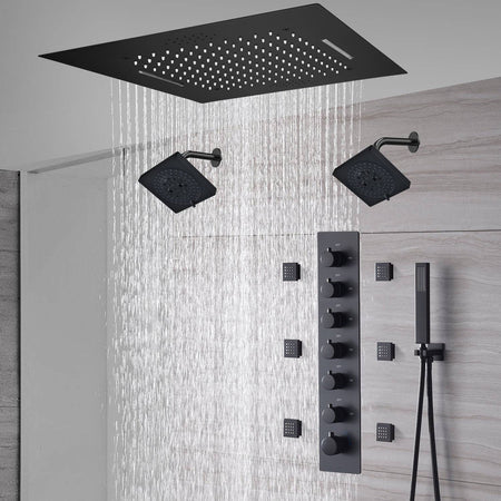 20-Inch or 24-Inch Matte Black Flush or Ceiling Mount Rainfall Waterfall Shower System: Complete with 6-Way Thermostatic Valve and 6 Body Jets and Dual Regular Head