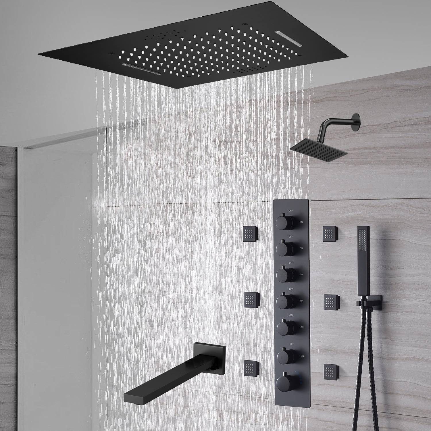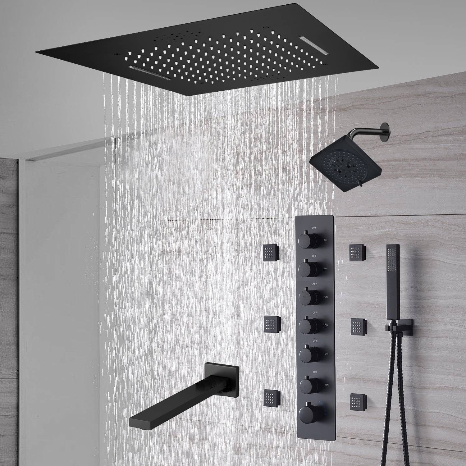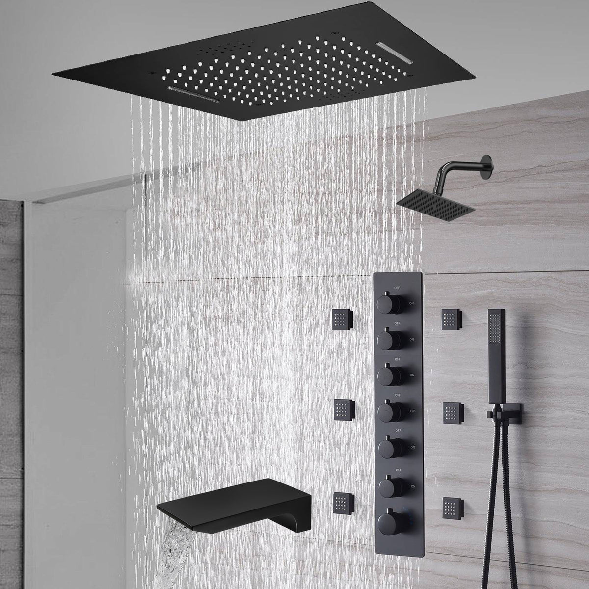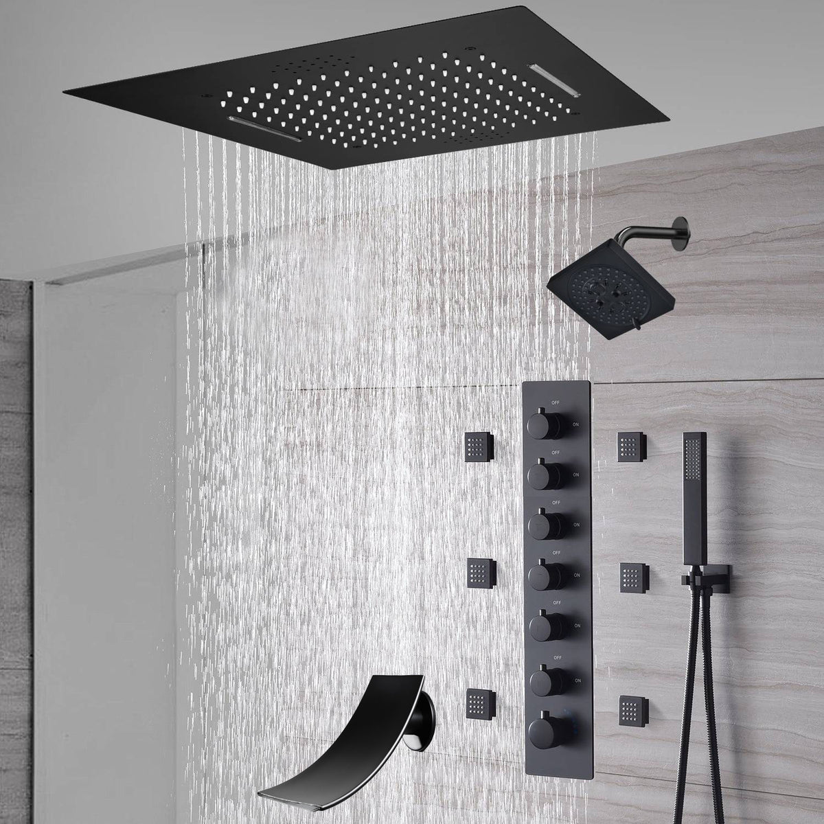 20-Inch or 24-Inch Matte Black Flush Mount Rainfall Waterfall Shower System: Complete with 6-Way Thermostatic Valve and 6 Body Jets and Regular Head and Tub Spout