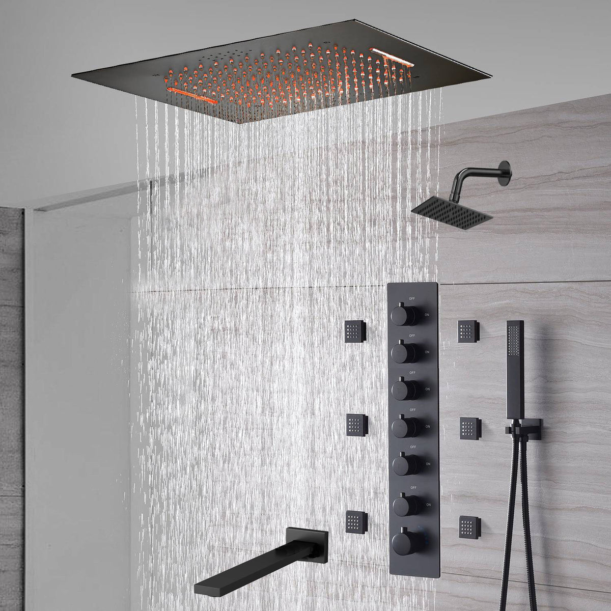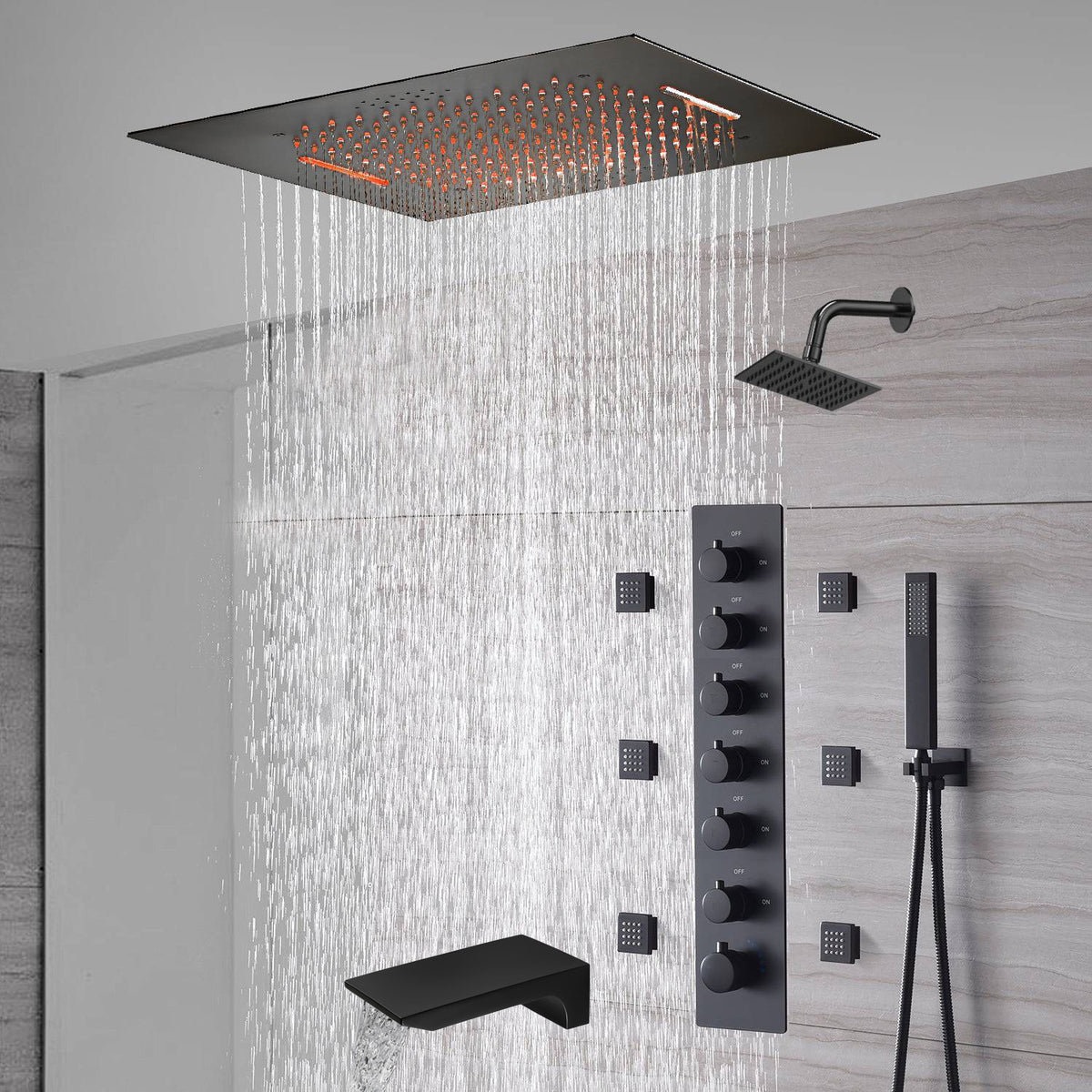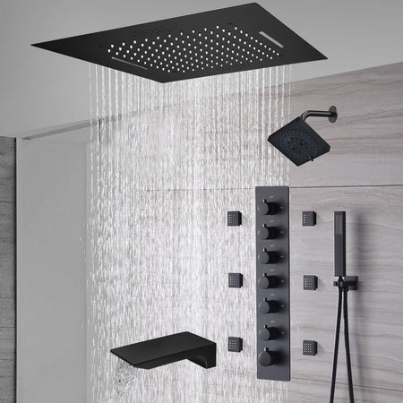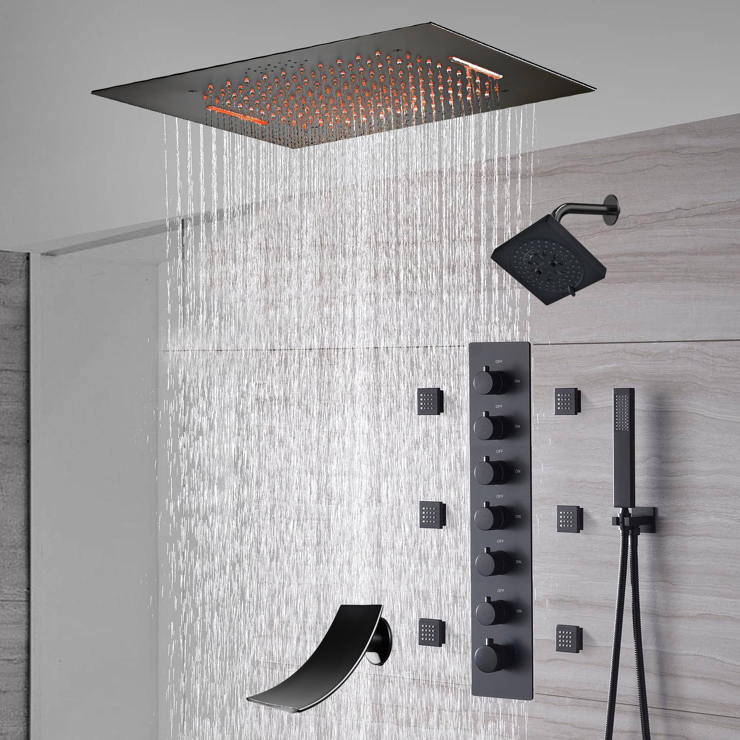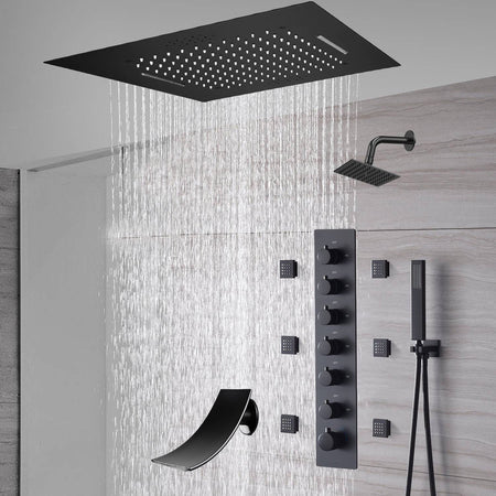 20-Inch or 24-Inch Matte Black Flush Mount Rainfall Waterfall Shower System: Complete with 6-Way Thermostatic Valve and 6 Body Jets and Regular Head and Tub Spout
