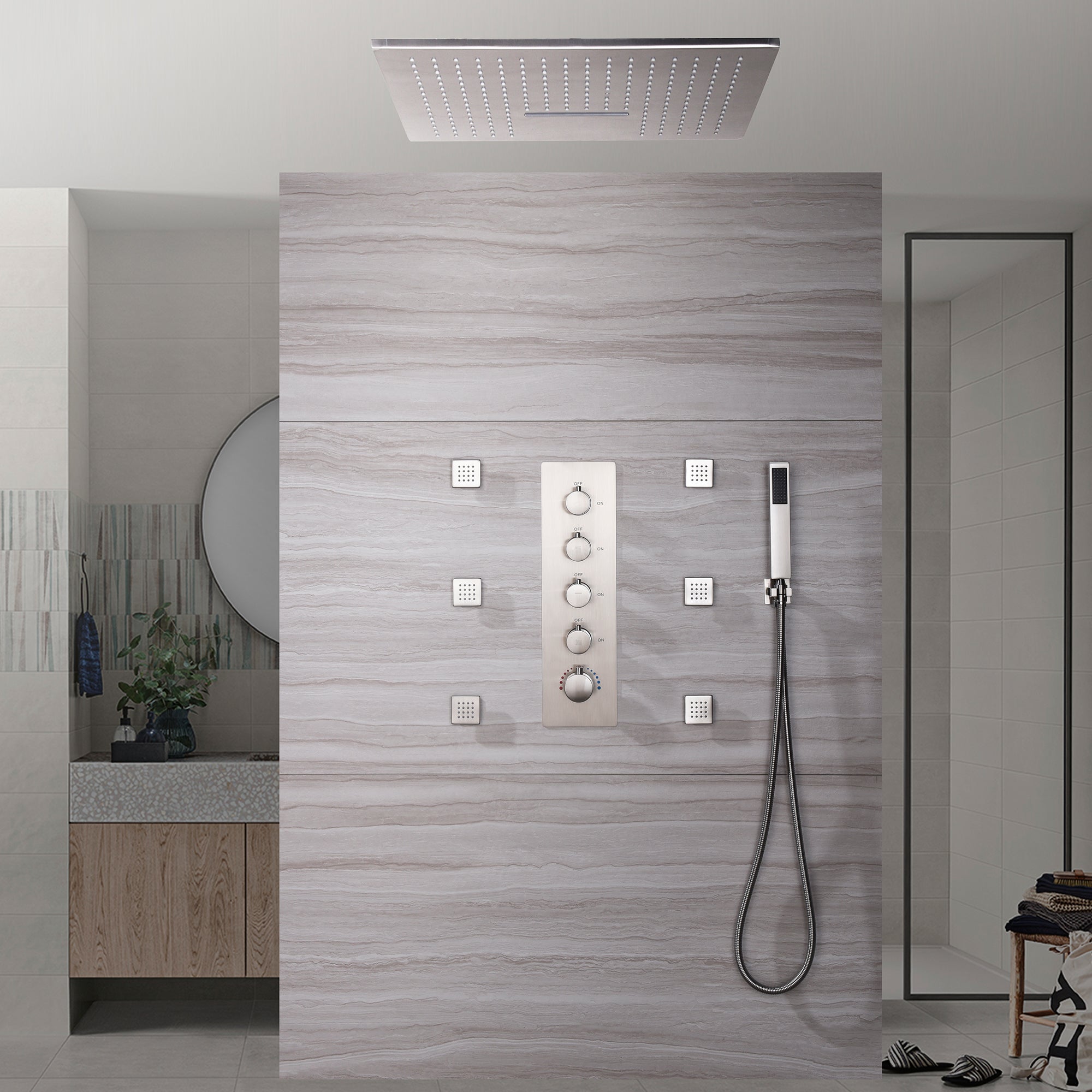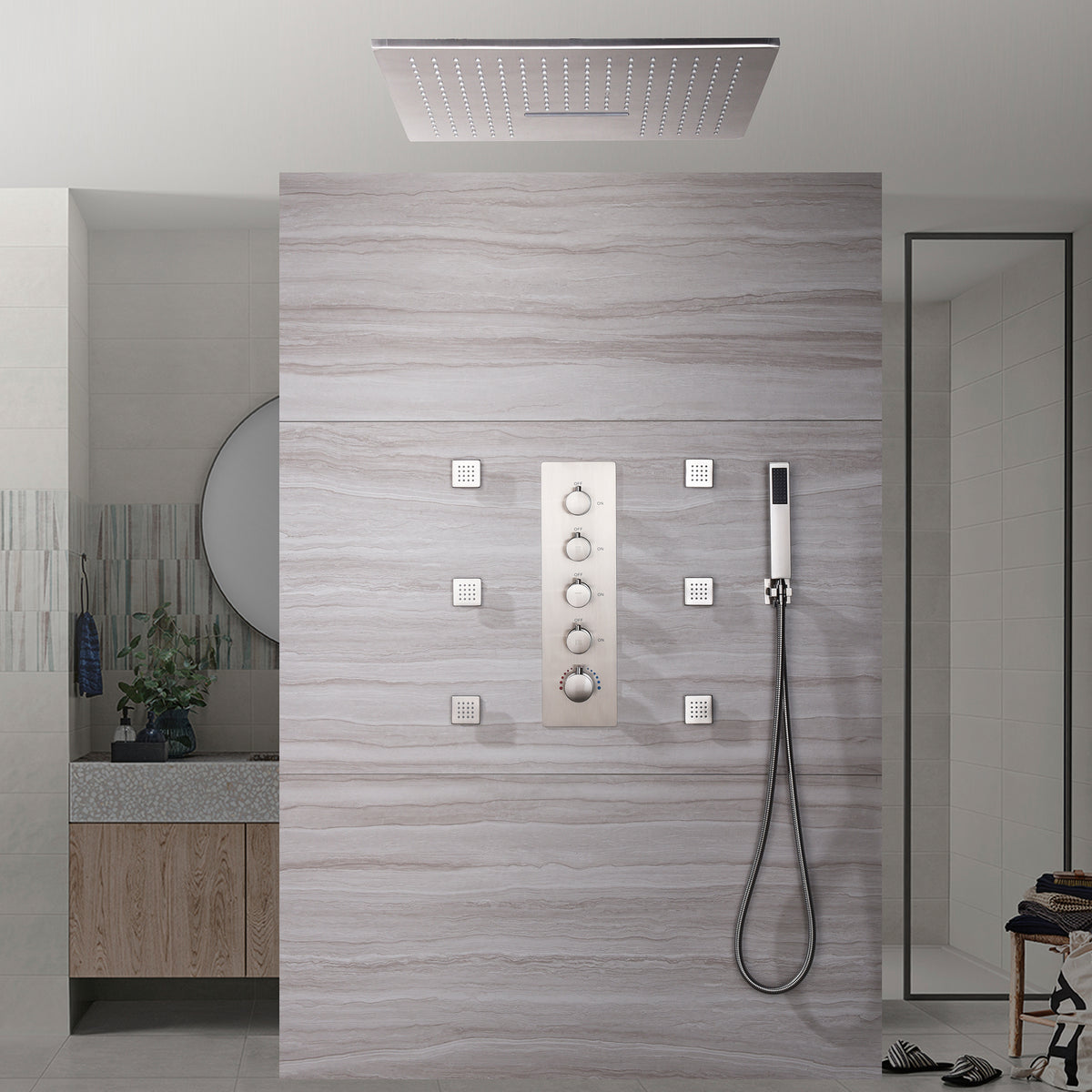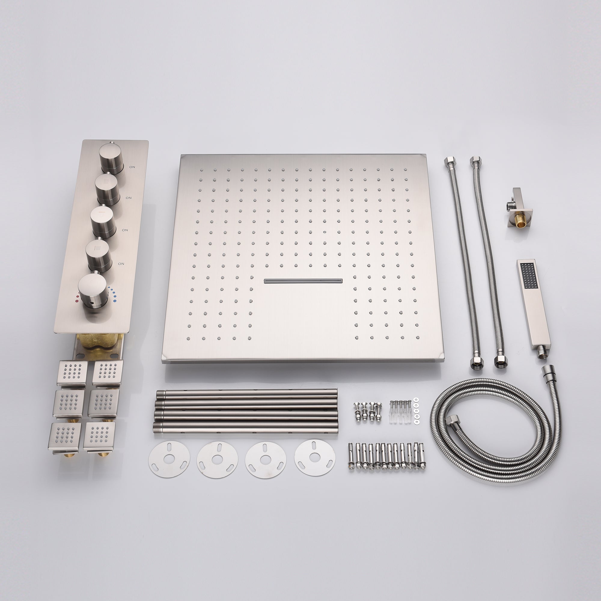 20inch Brushed nickel ceiling mount rainfall waterfall shower systems 4 way thermostatic valve with 6 body jets