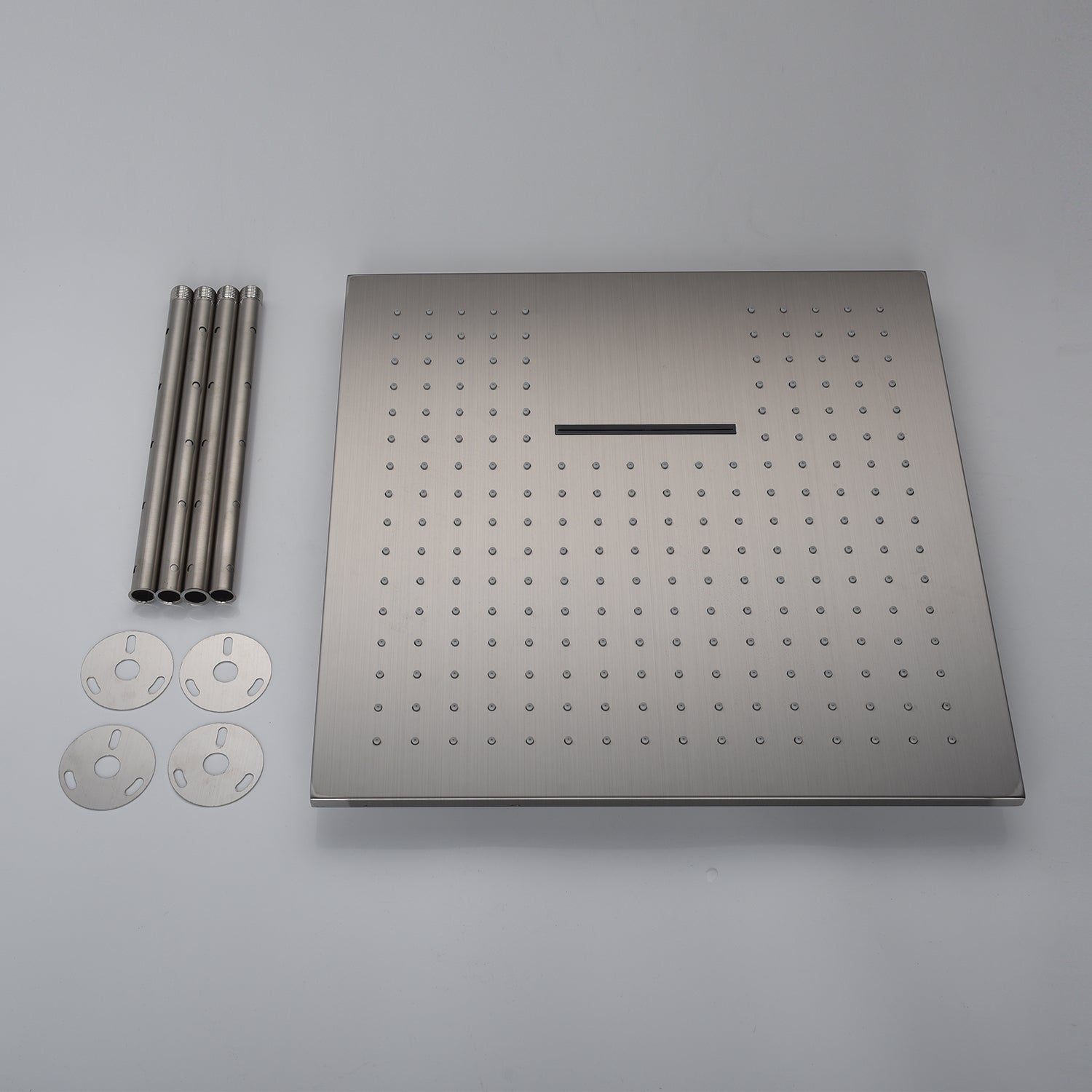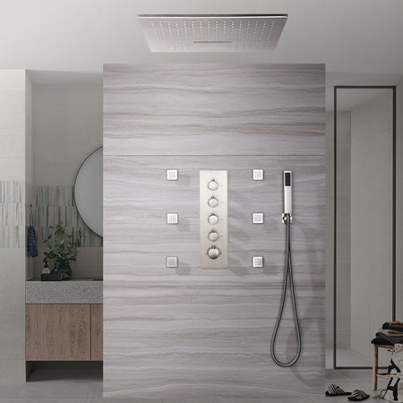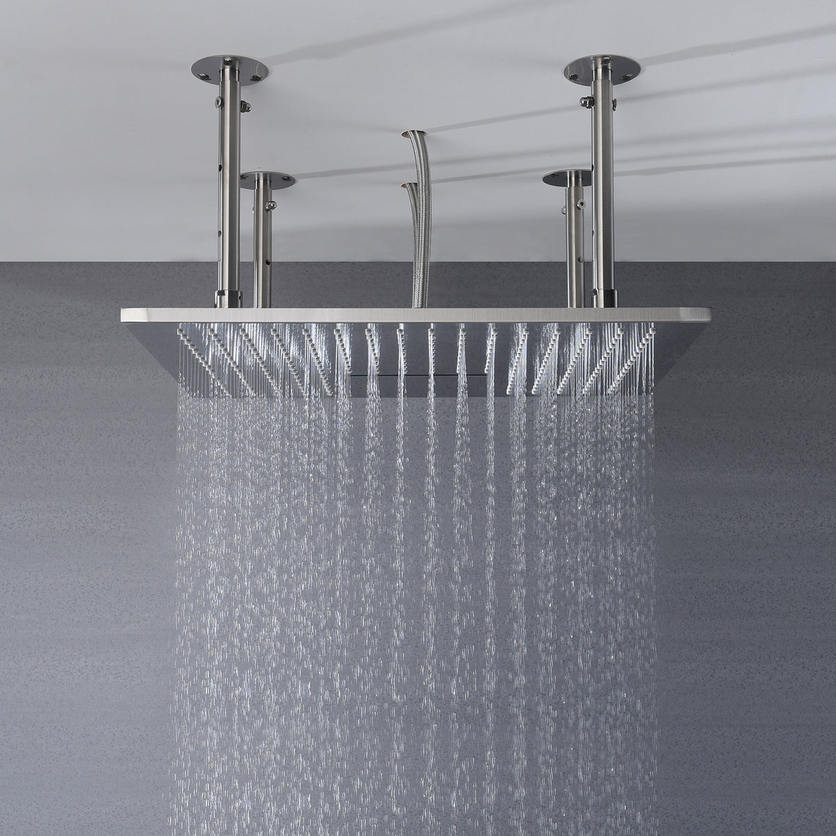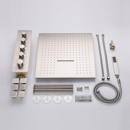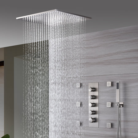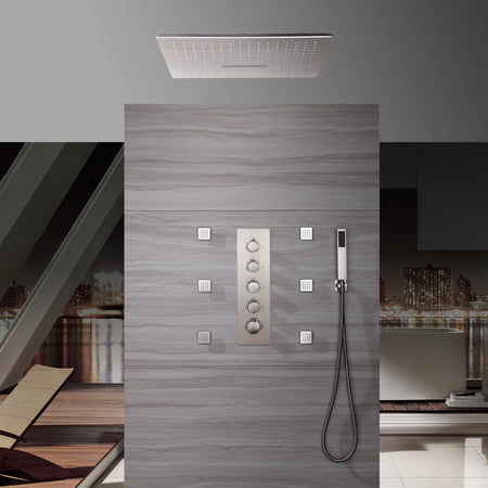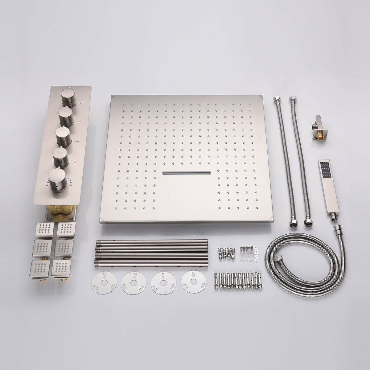 20inch Brushed nickel ceiling mount rainfall waterfall shower systems 4 way thermostatic valve with 6 body jets
