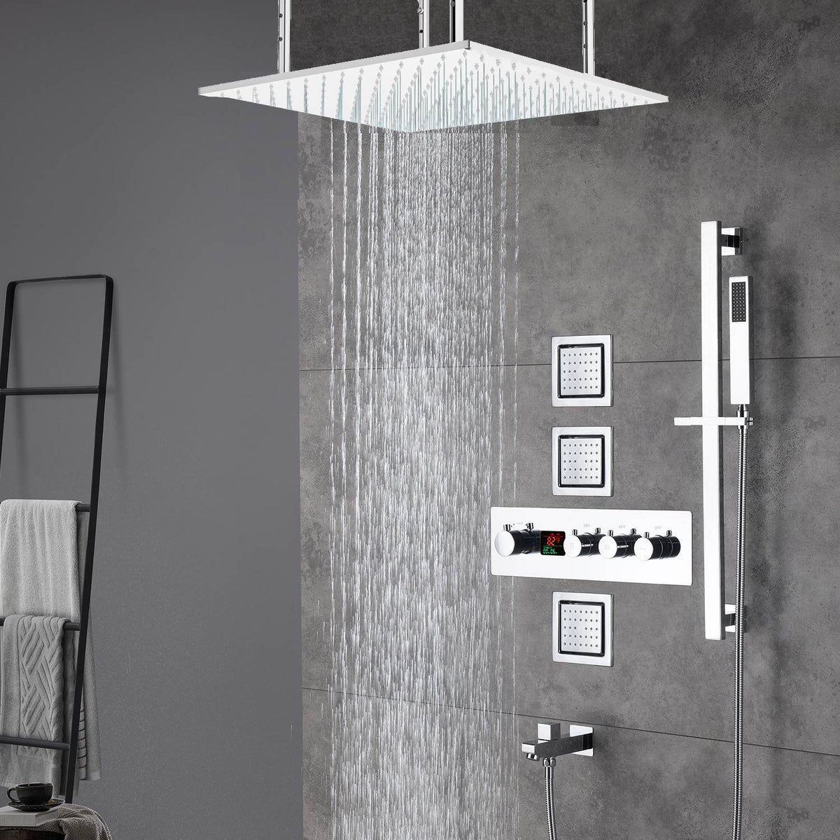Chrome 20 inch or 24 inch LED Rainfall 3-Way Digital Thermostatic Shower Faucets with Body Jets and Sliding Bar