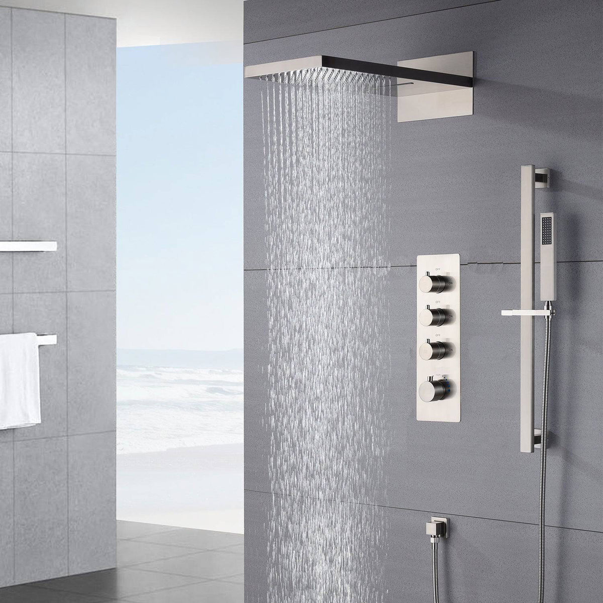 Experience a plush and secure shower with our 3-way brushed nickel thermostatic shower system. This premier shower set combines superior functionality, safety, and modern aesthetics to transform your showering experience.