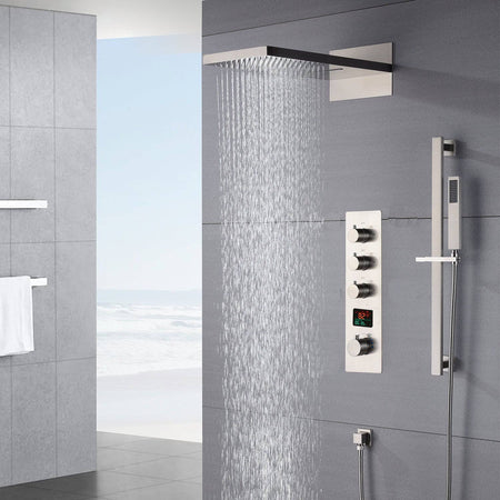 This 3-way brushed nickel thermostatic shower system offers an all-encompassing solution for a luxurious and safe shower experience. With its LED rainfall and waterfall shower head, adjustable water flow and temperature, and elegant brushed nickel finish, it brings modern elegance and high functionality to your bathroom.