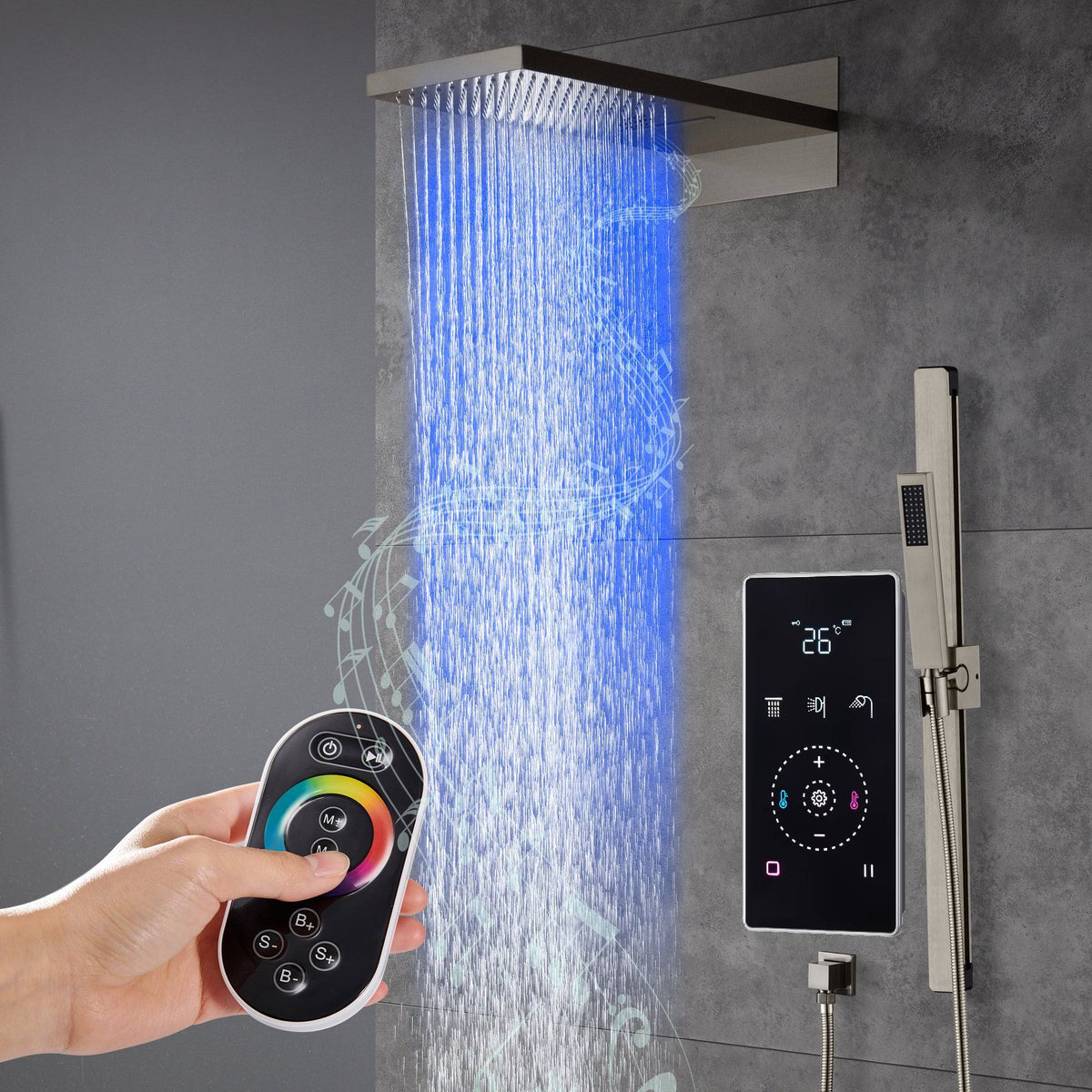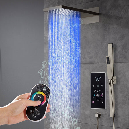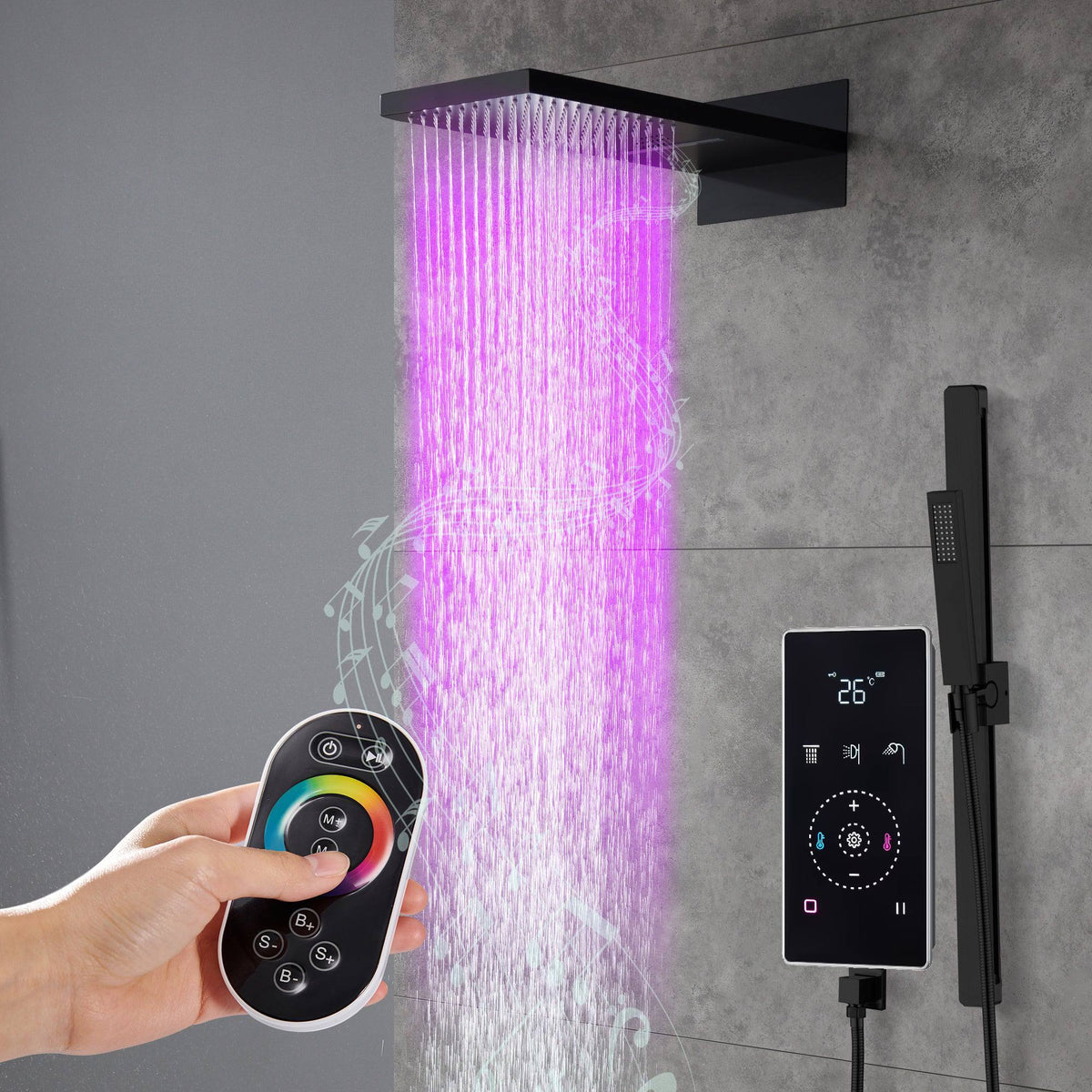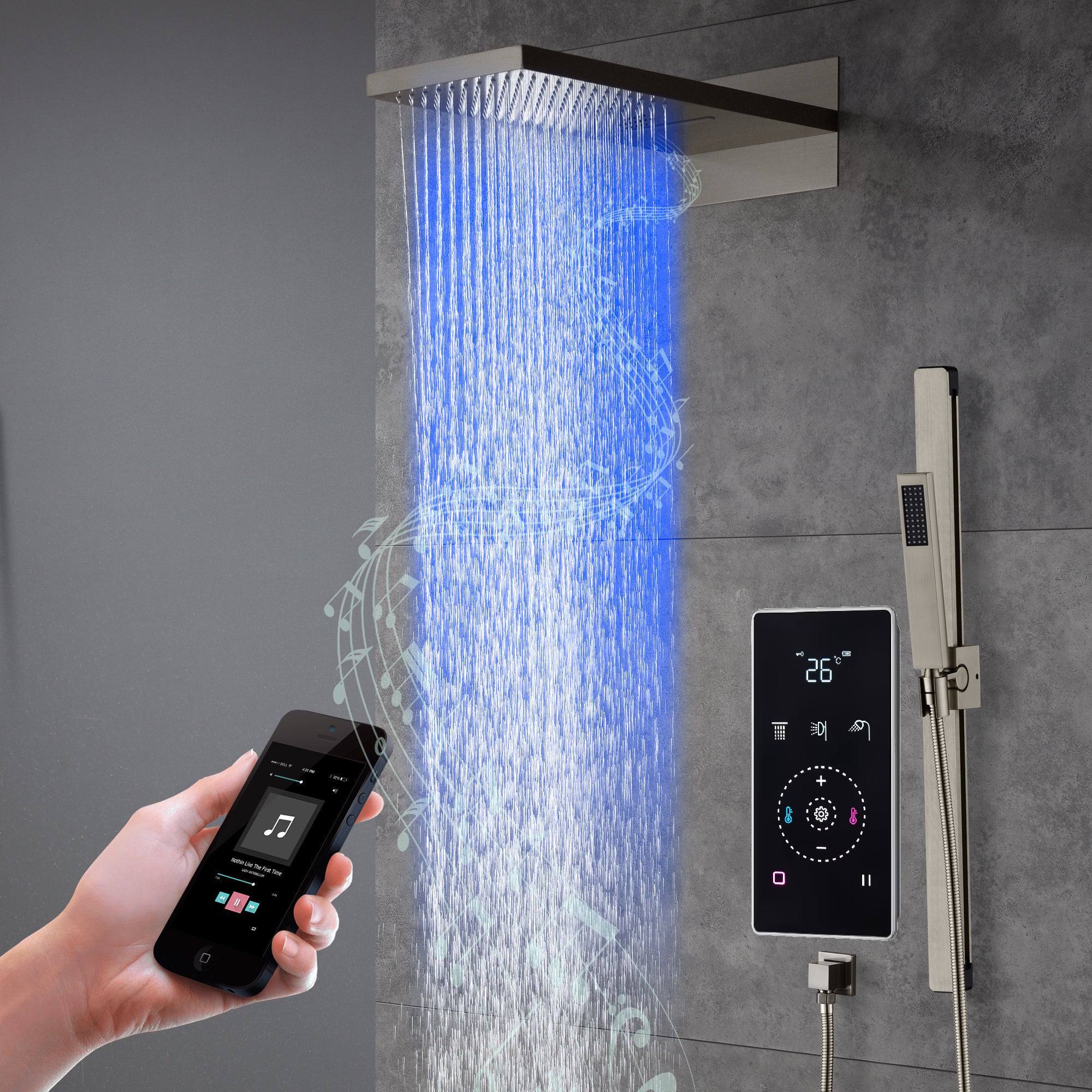 22" Bluetooth Music LED Shower System with 3-Way Thermostatic Faucet, Rainfall, Waterfall, Sliding Bar