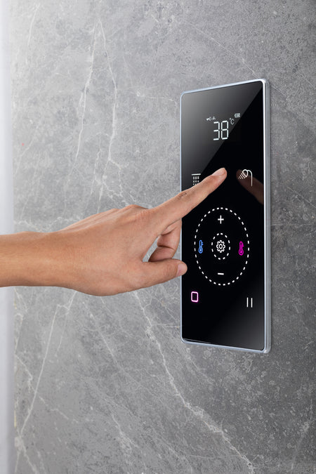 Touch panel is to control water flow and water pressure and it is waterproof and it work by electronic power.