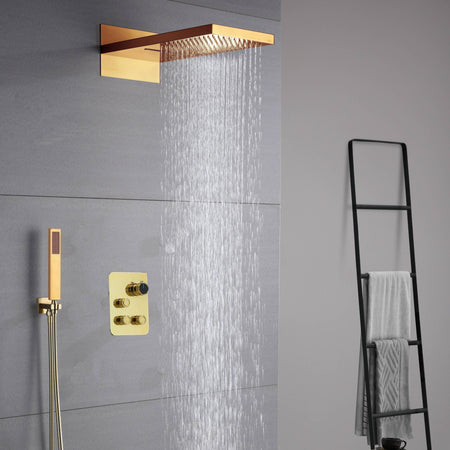 22-Inch Rainfall Waterfall Polished Gold 3-Way Thermostatic Shower System: Featuring a Regular Head with Simultaneous and Independent Functionality
