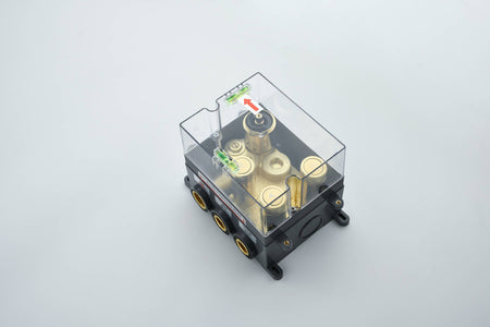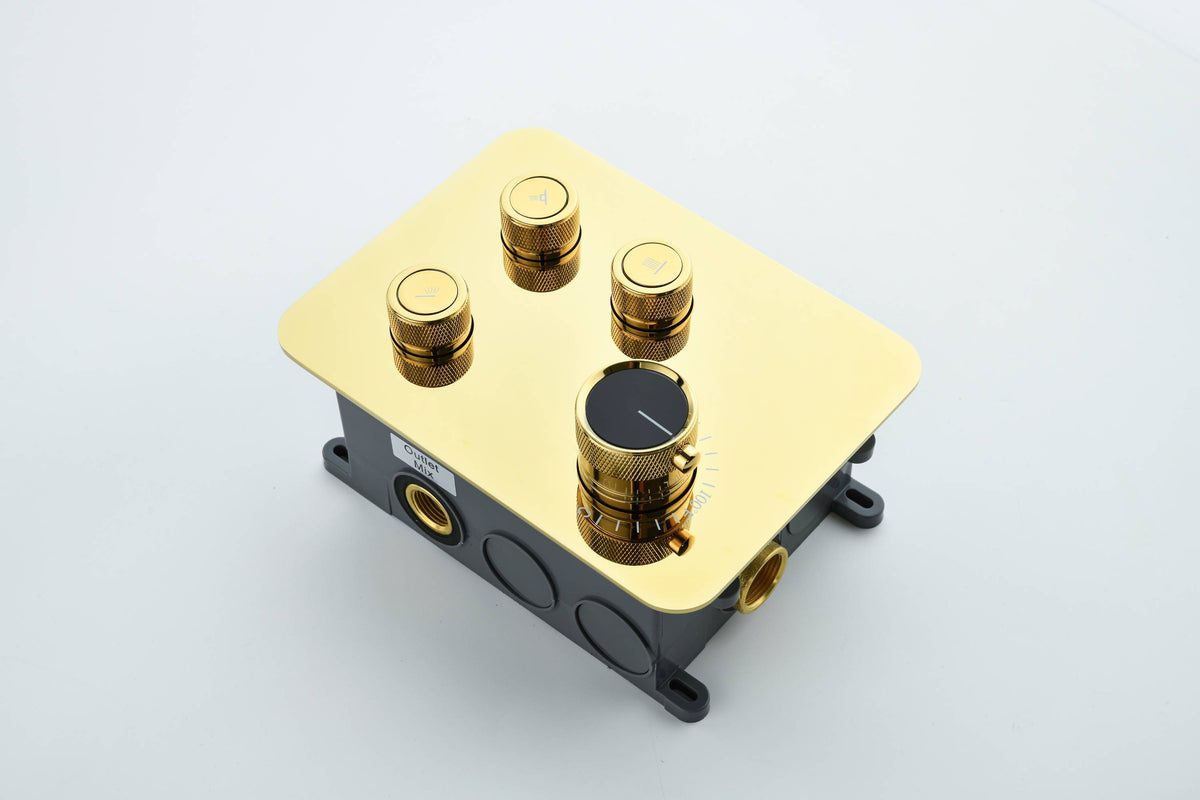 The 3-way shower mixer valve control is made from brass and ceramic valve with a gold finish. Each function can work all together or separately. It features three functions thermostatic and anti-scale setting. The inlets are 3/4 inch and outlets are 1/2 inch. It can control water flow and water pressure by switching the three buttons.It hasย High Performance for the 3 push button cartridges