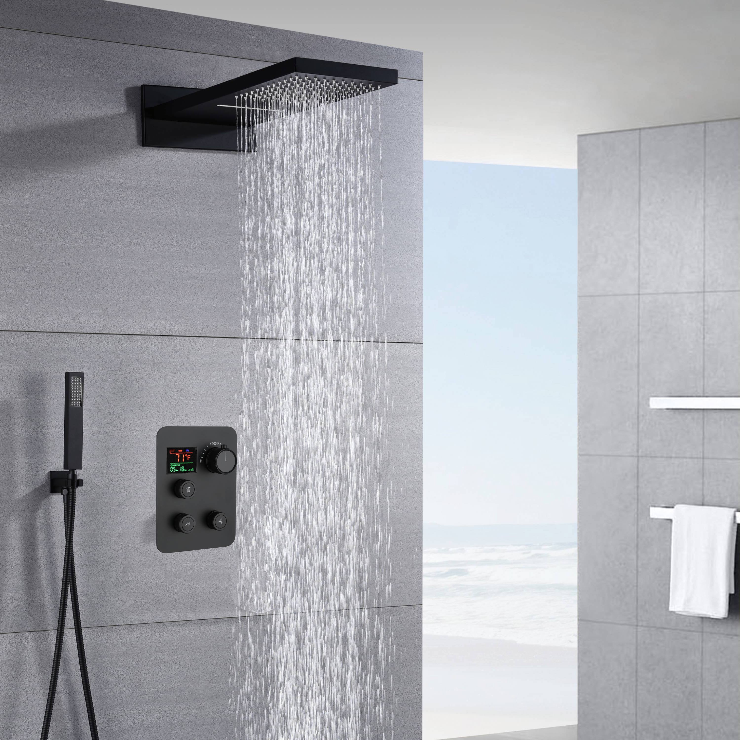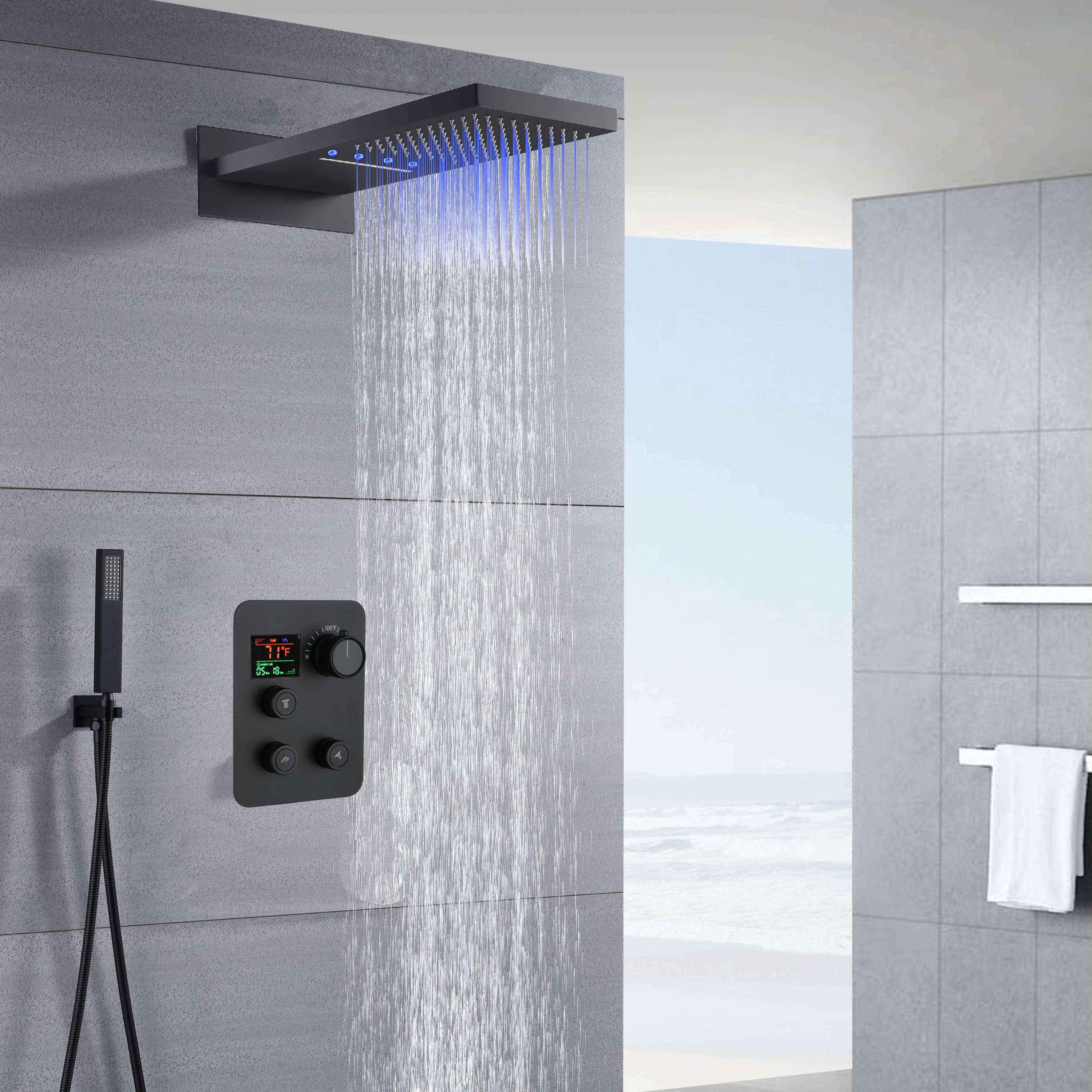 22" Matte Black Rainfall/Waterfall Shower Head with 3-Way Thermostatic Faucet, Optional LED