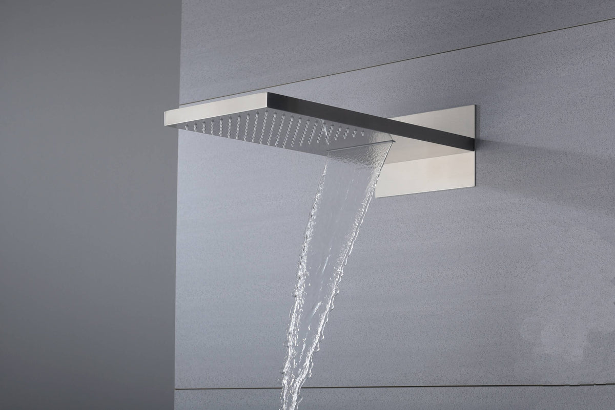 The fixed rain showerhead, a generous 22" x 9" in size, promises a luxurious shower experience. Crafted from high-quality stainless steel, it offers both rainfall and waterfall features, providing you with a soothing, spa-like experience right in your home.