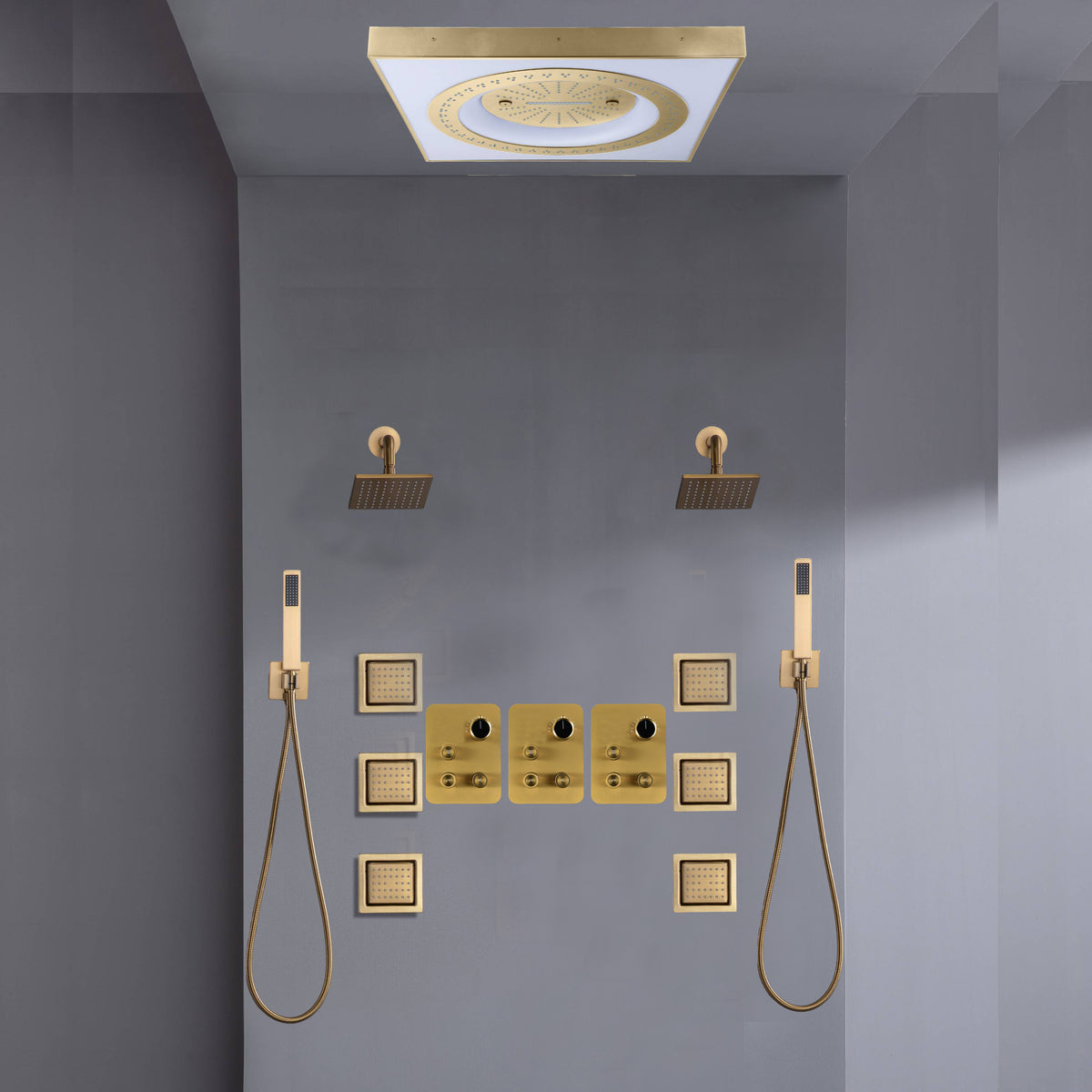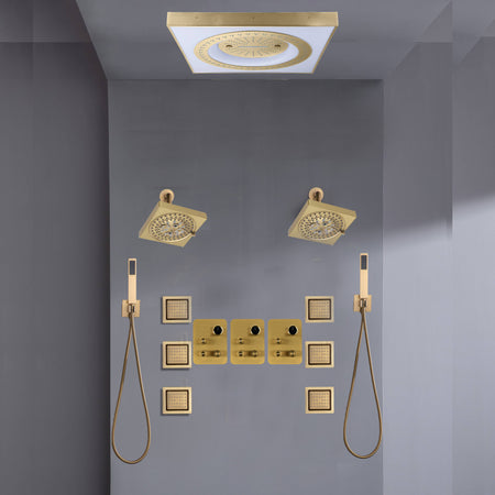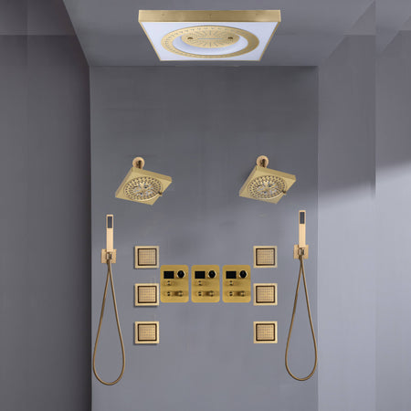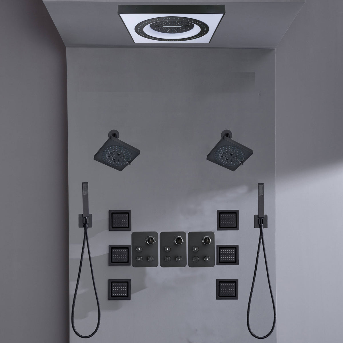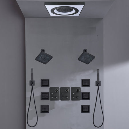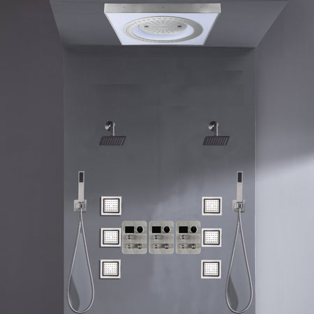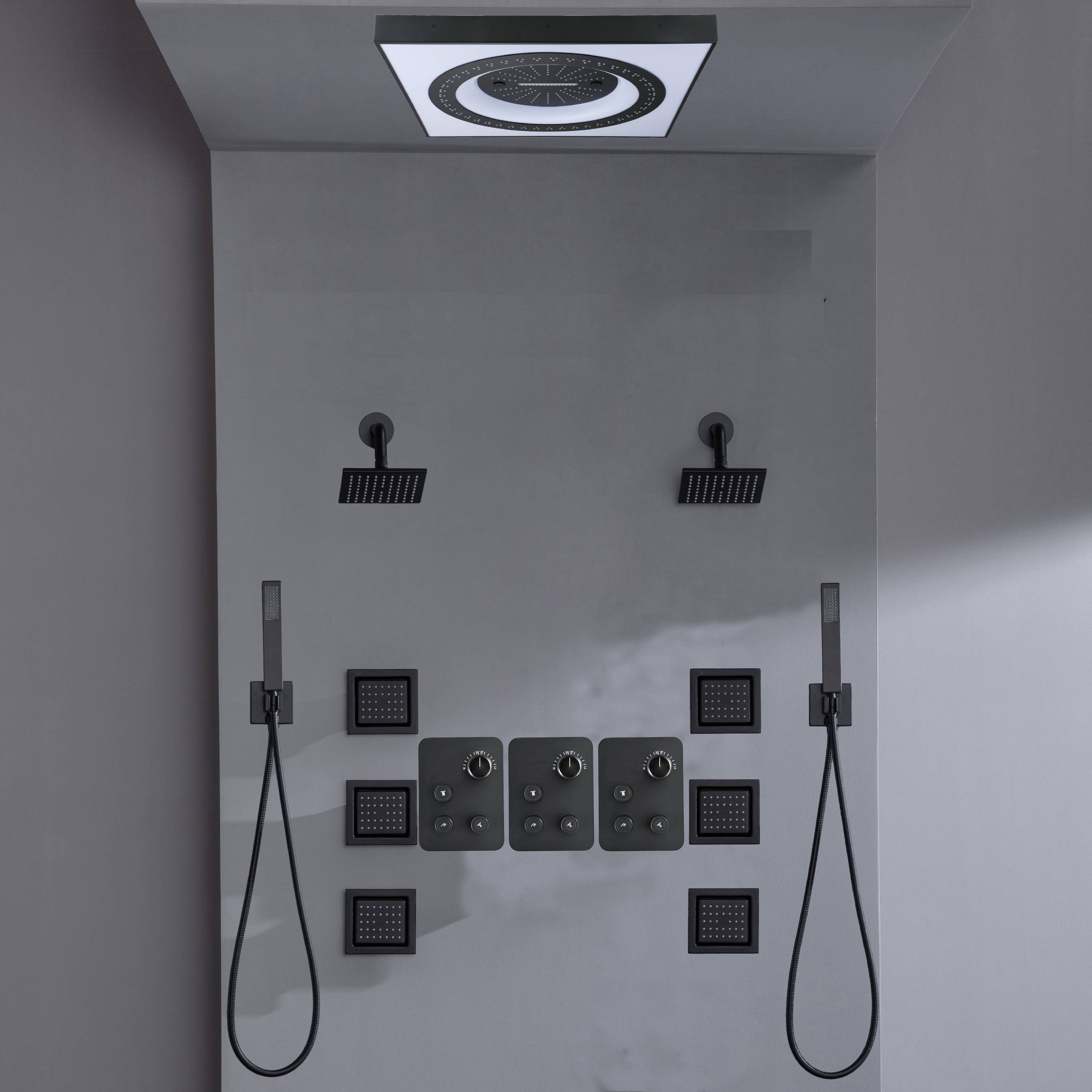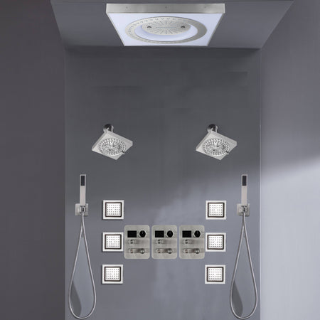 24" Flush Mount Shower Head with 9-Way Digital Faucet, Dual 6" Regular Heads, 6 Body Jets and Dual Handle Wands