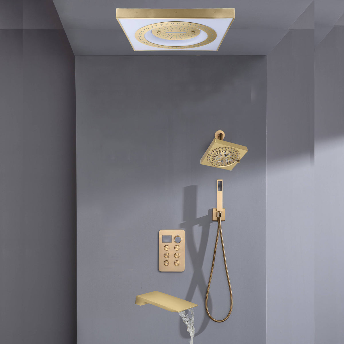 This matte black or Brushed gold or brushed nickel LED rainfall shower system offers a unique blend of functionality, versatility, and elegance, transforming your bathroom into a personal spa.