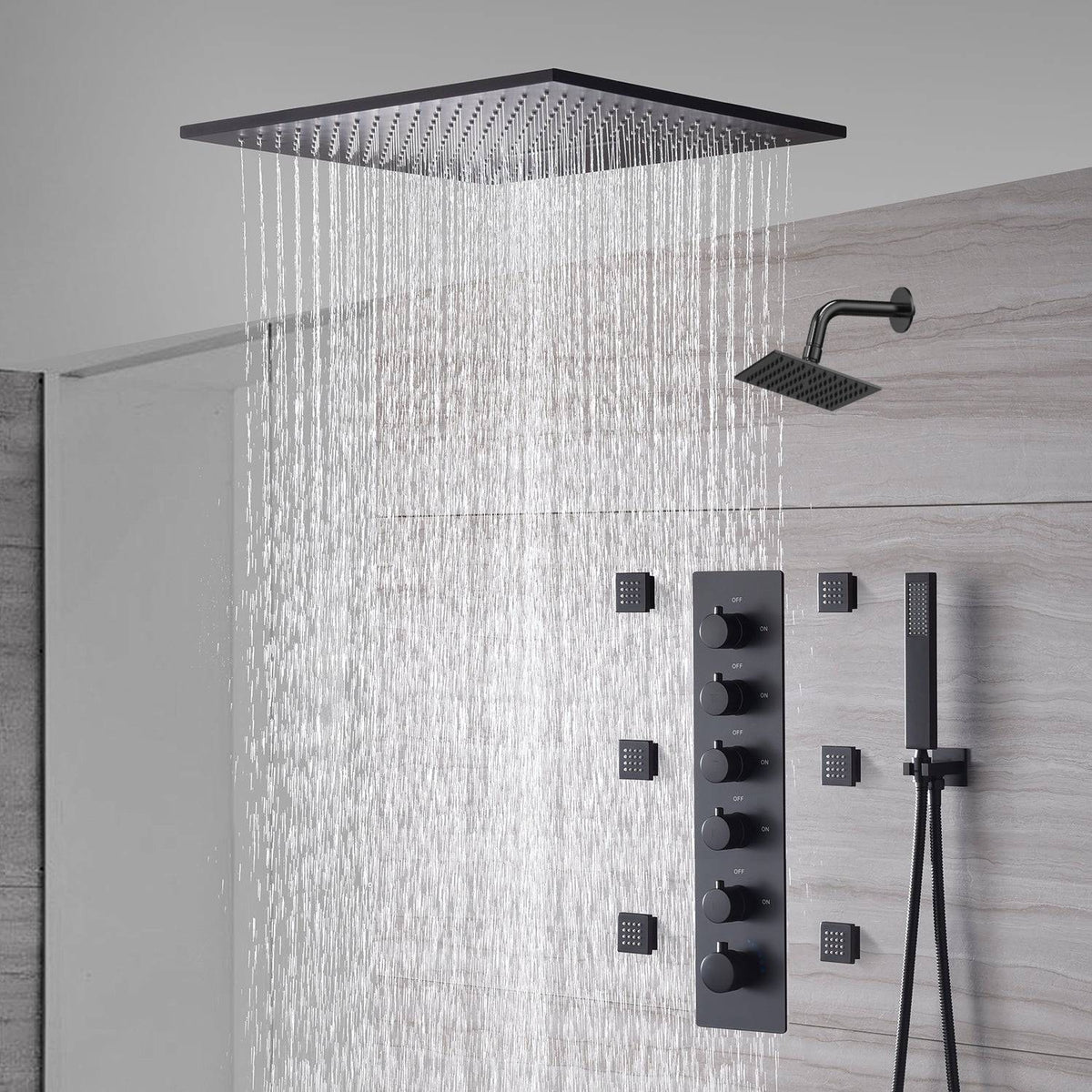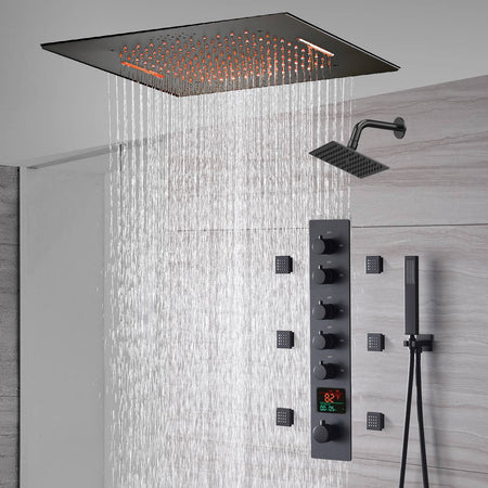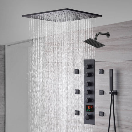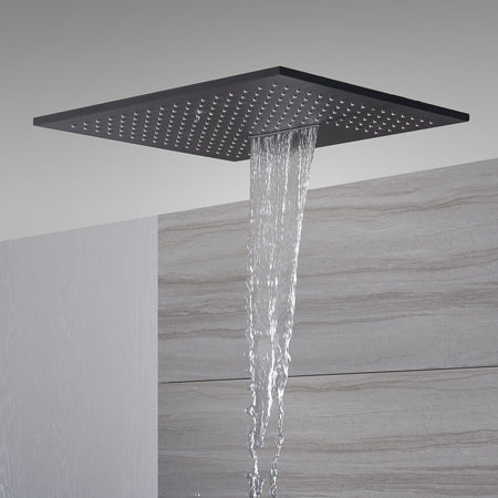20-Inch or 24-Inch Matte Black Flush or Ceiling Mount Rainfall Waterfall Shower System: Complete with 5-Way Thermostatic Valve and 6 Body Jets and Regular Head