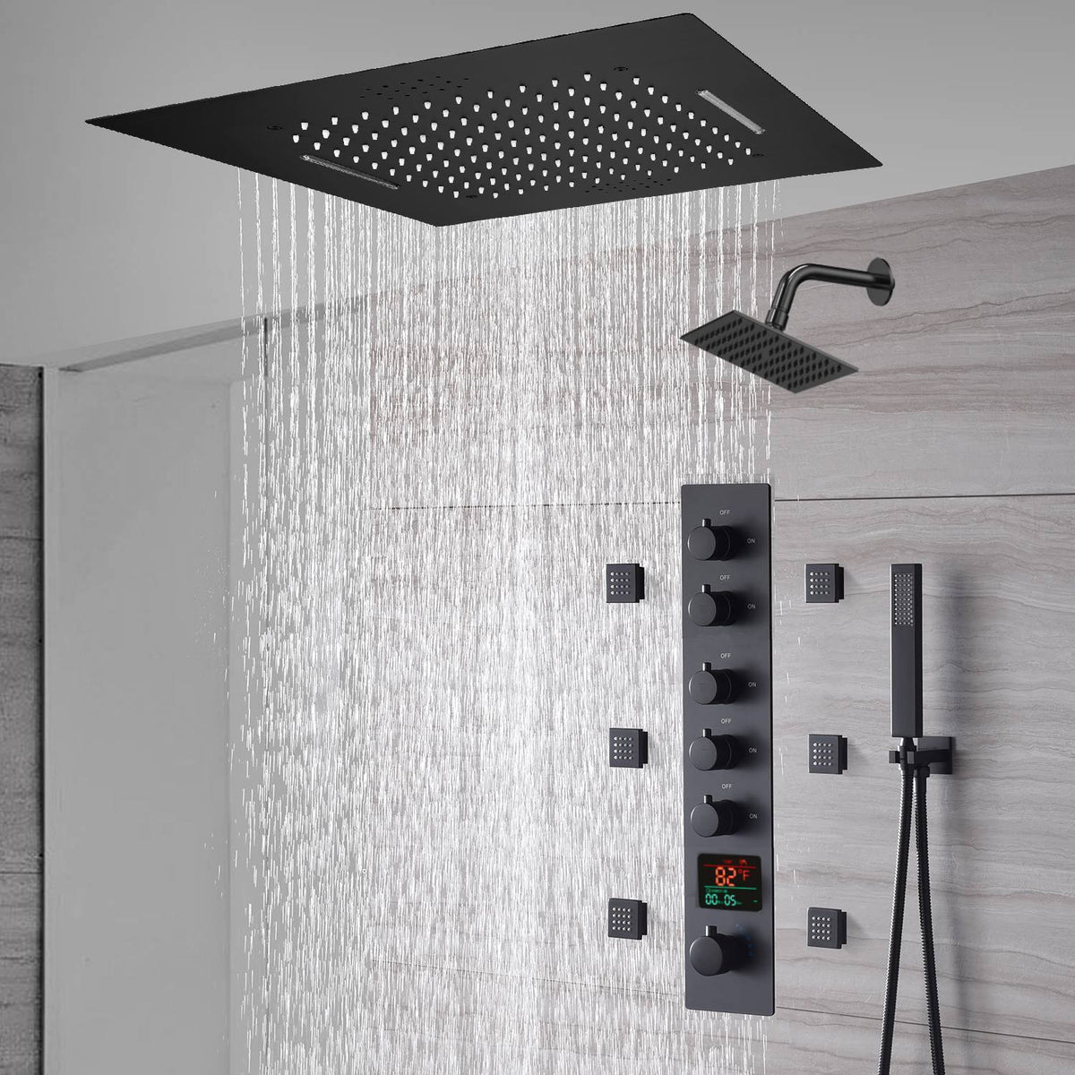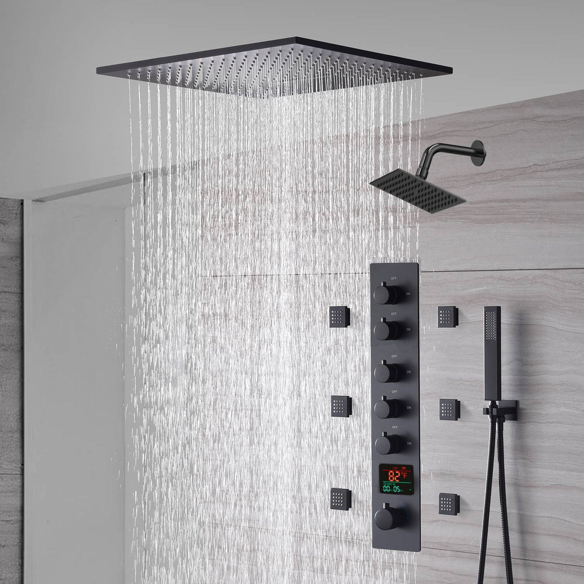 Indulge in the ultimate showering experience with our Multi-Function Full Body Shower Faucet Set in Matte Black. Immerse yourself in the luxurious waterfall shower, rainfall shower, bodyspray, and handheld sprayer. Enjoy the convenience of the digital display, thermostatic valve, and adjustable features. Upgrade your shower space with the durability and elegance of solid brass and stainless steel construction.