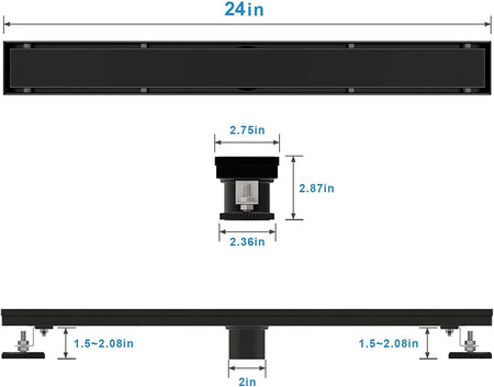 matte black Linear shower drain stainless steel material 24 inch with tile insert 2-in-1 cover with hair strainer and adjustment feet
