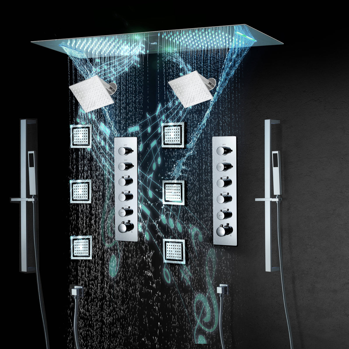 Chrome 35" Bluetooth Music LED Shower System with Waterfall, 5-Way Thermostatic Valve, 6 Body Jets, Dual Regular Head