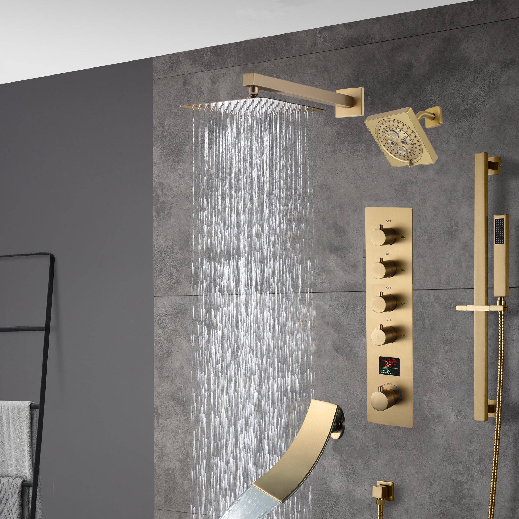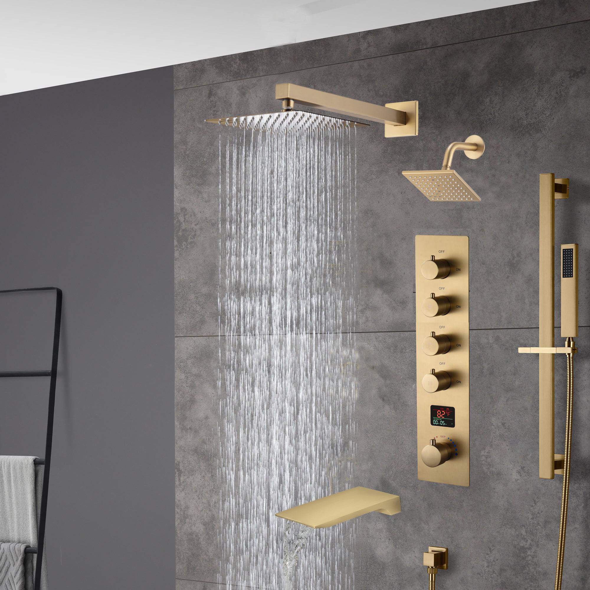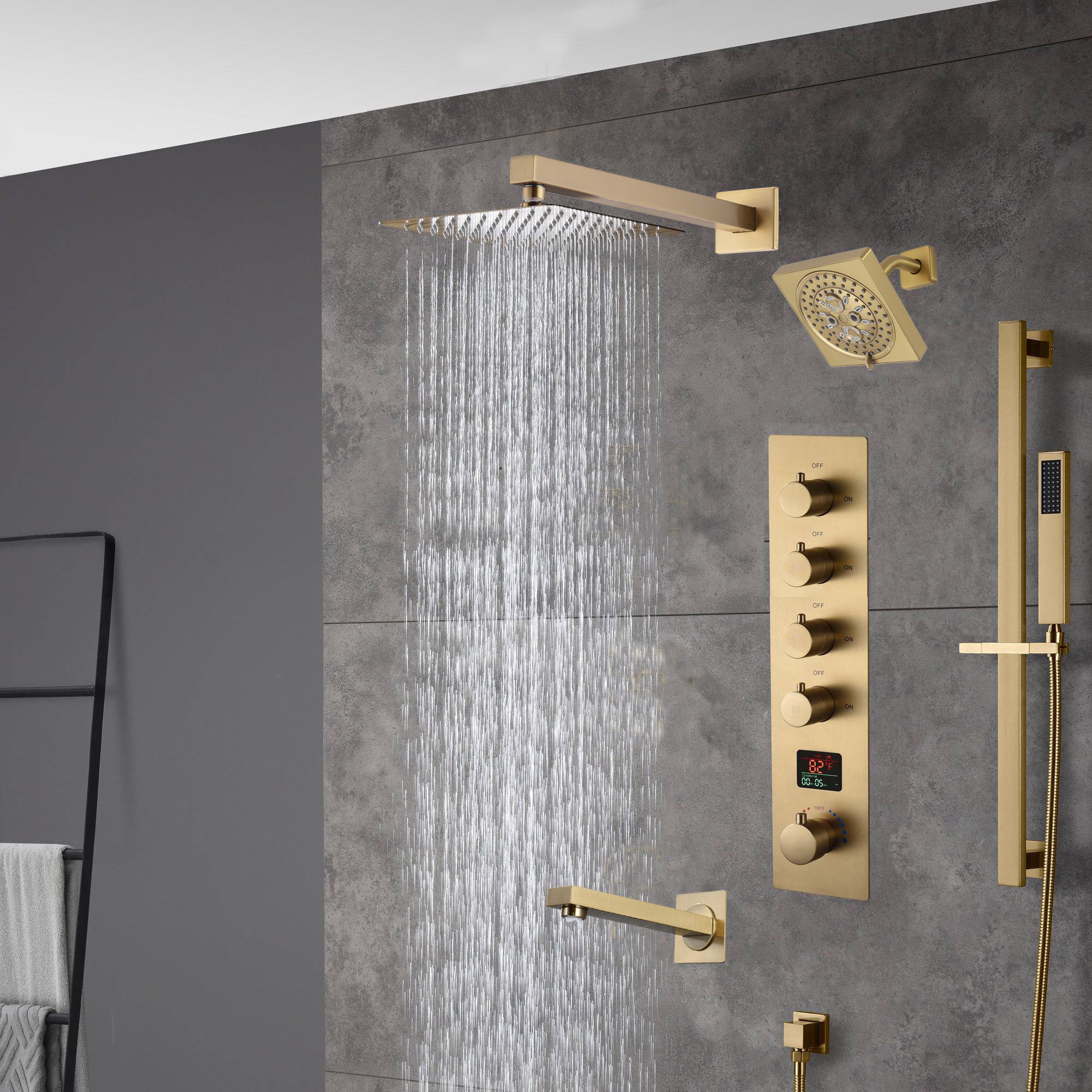 Brushed gold 12 inch or 16 inch rain head 4 way digital display thermostatic shower faucet with Regular head and Tub Spout