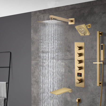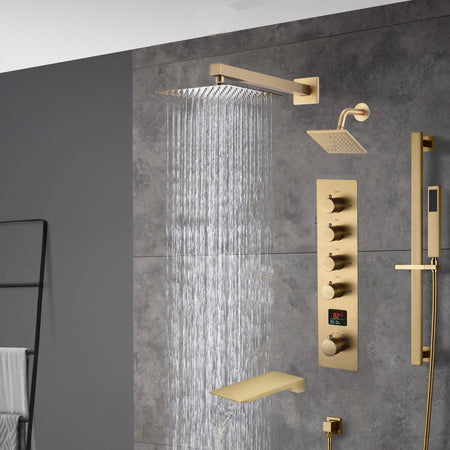This 4-way thermostatic shower system in brushed gold offers a luxurious and customizable shower experience. Its various components, including a rainfall shower head, handheld shower, tub spout, and a thermostatic control valve with digital display, allow for a personalized showering experience. The system's brushed gold finish adds a touch of elegance to any bathroom.