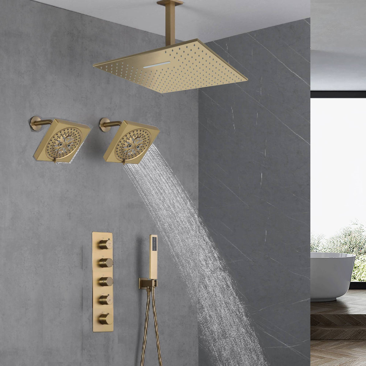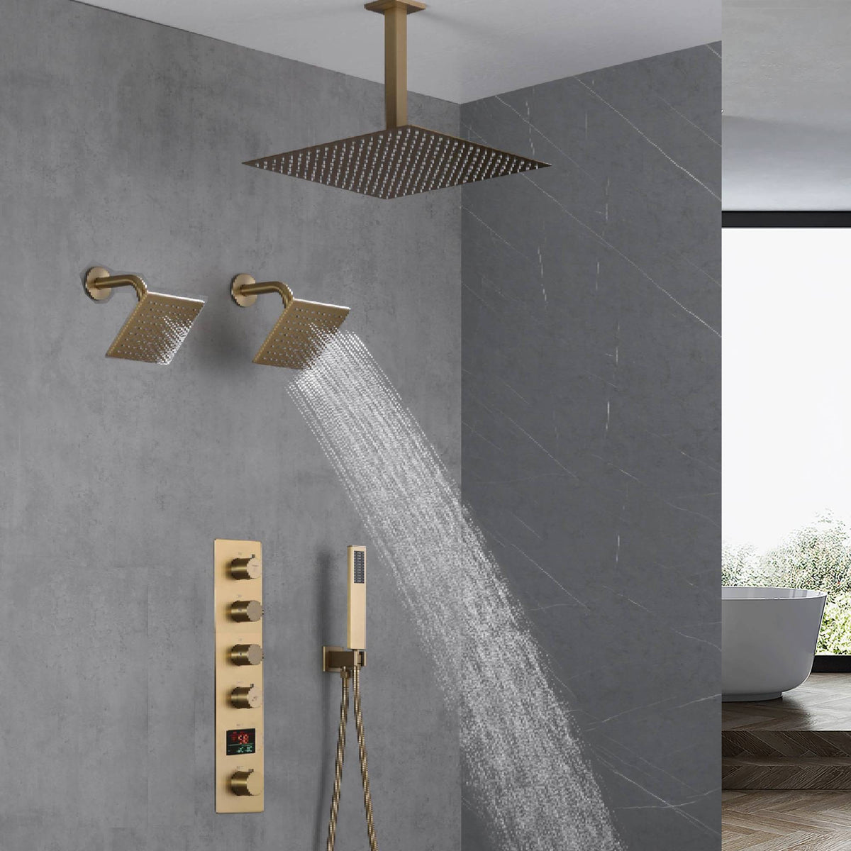 Upgrade your shower with the Brushed Gold 4-Way Thermostatic Shower System, offering luxurious design and customizable features for an unparalleled bathing experience.