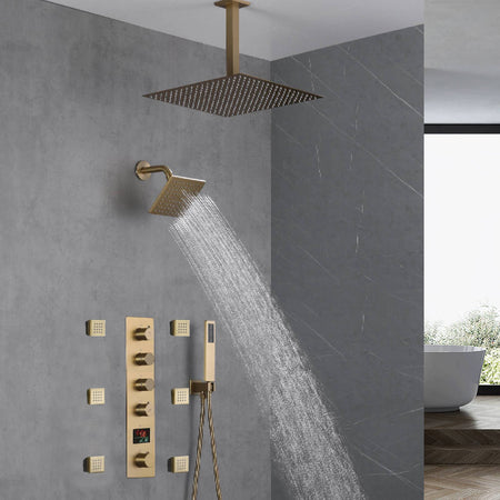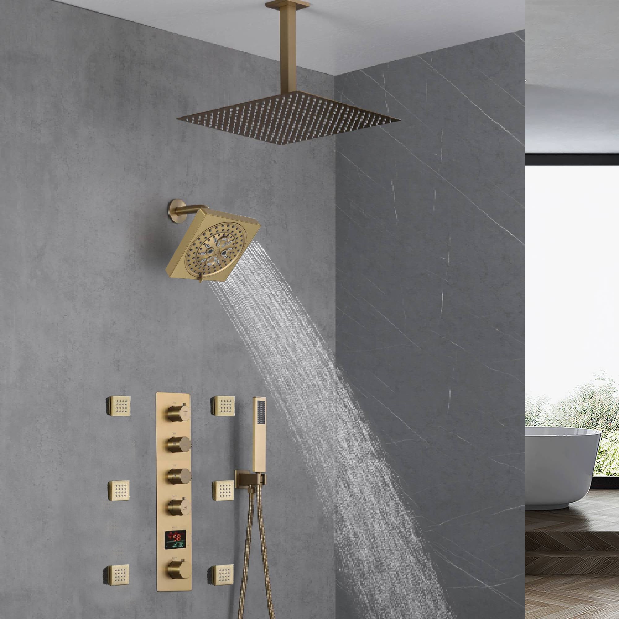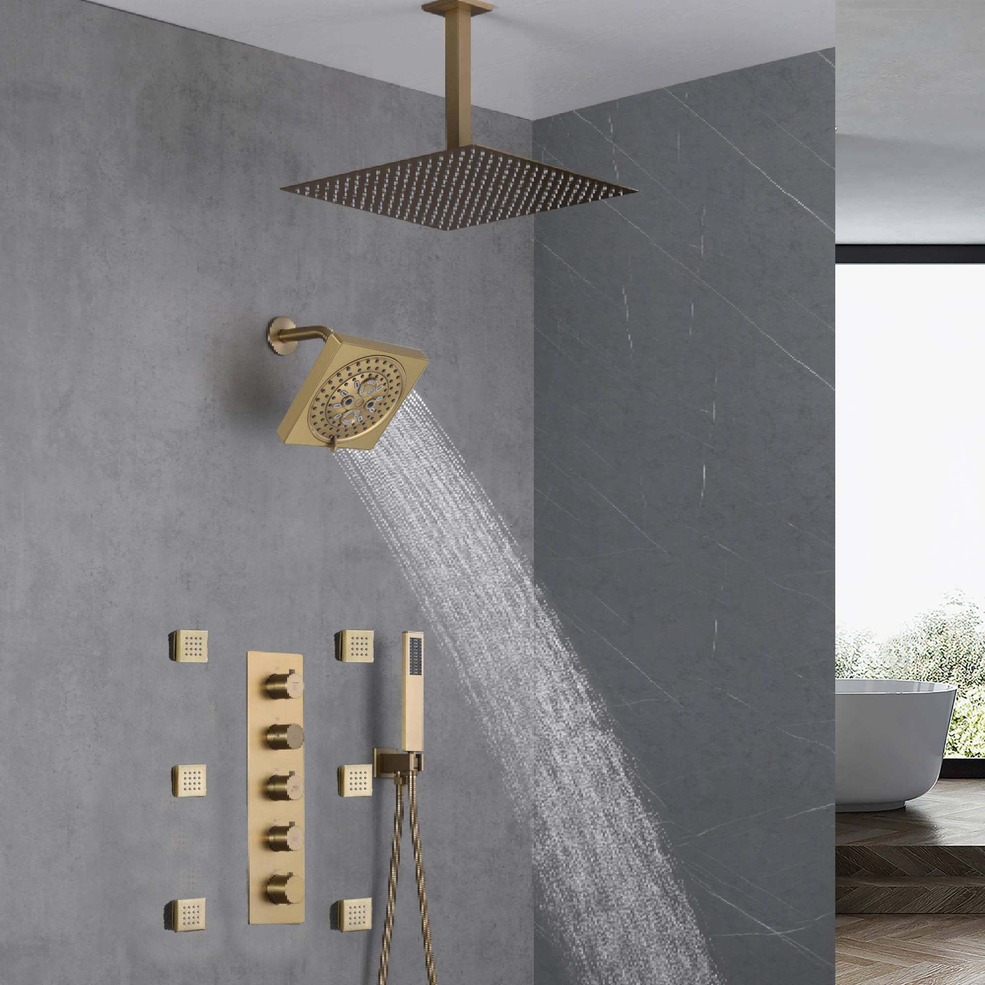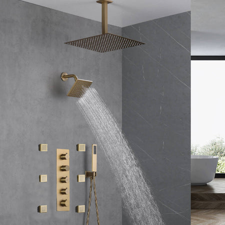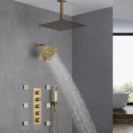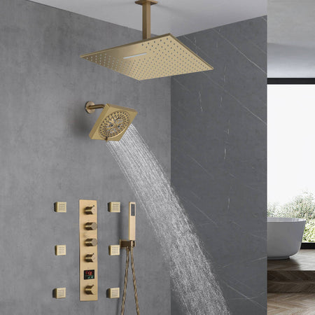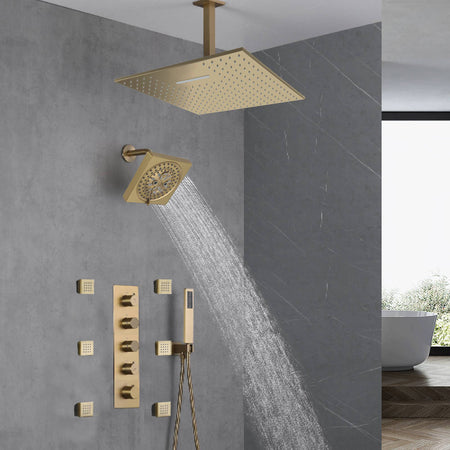 Brushed Gold 16-Inch Rainfall Ceiling Mount Shower Head with 4-Way Thermostatic Faucet, Body Jets, and High-Pressure Wall Mount Head