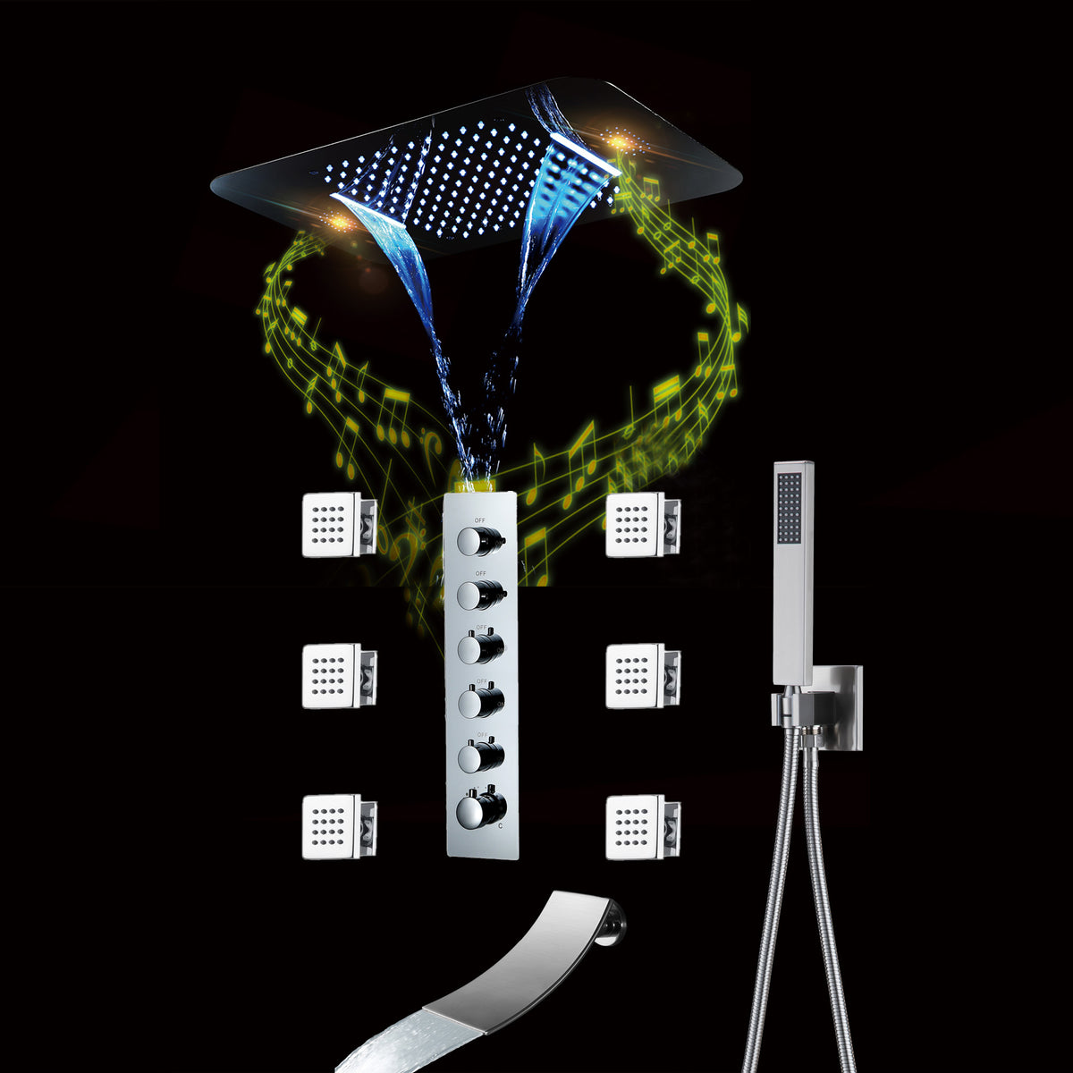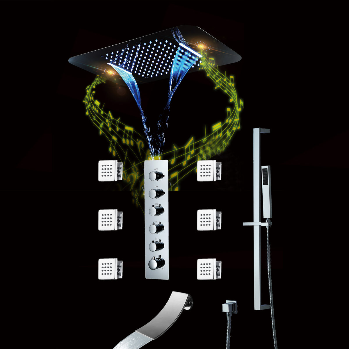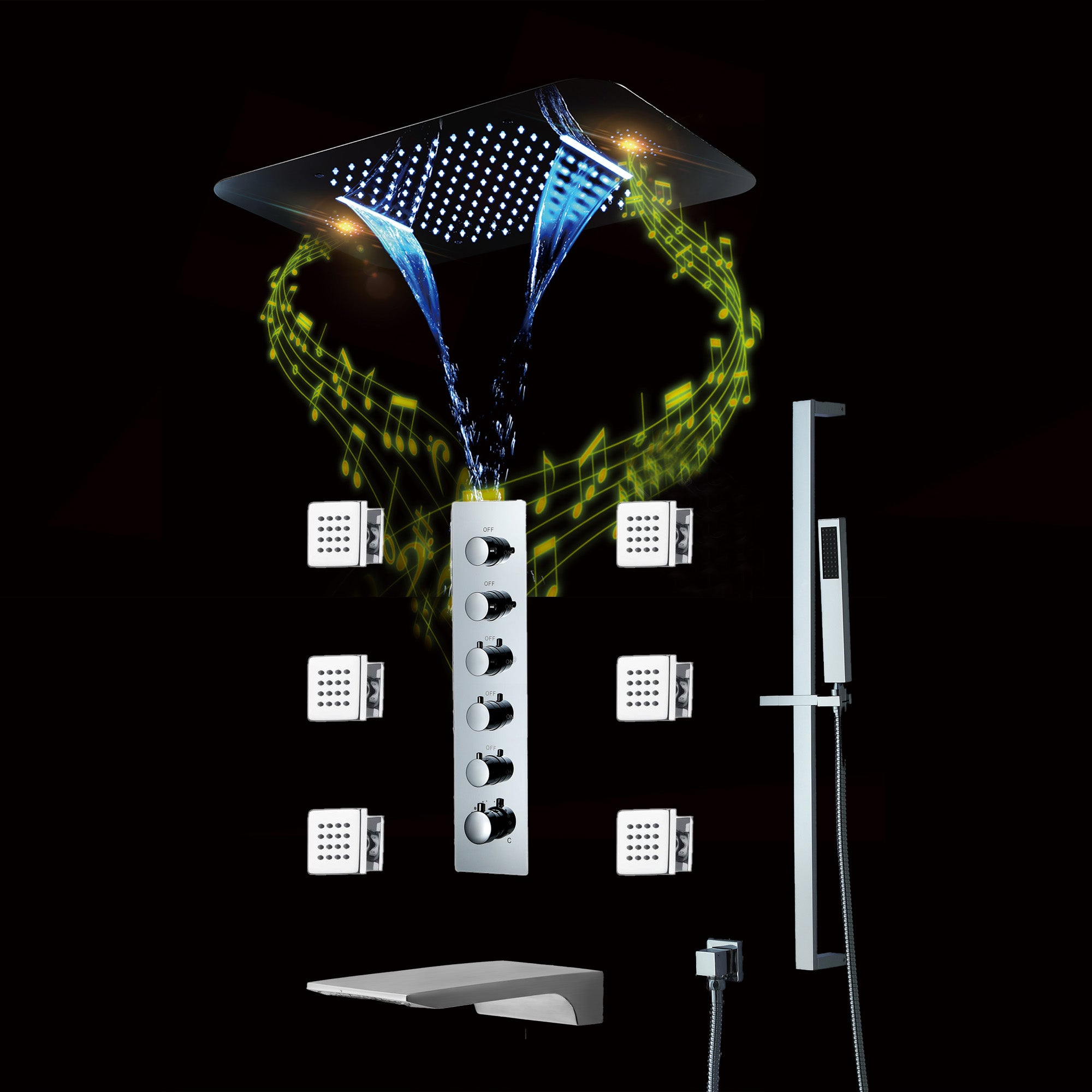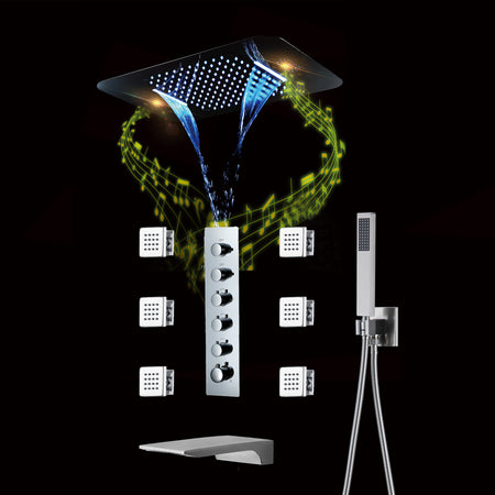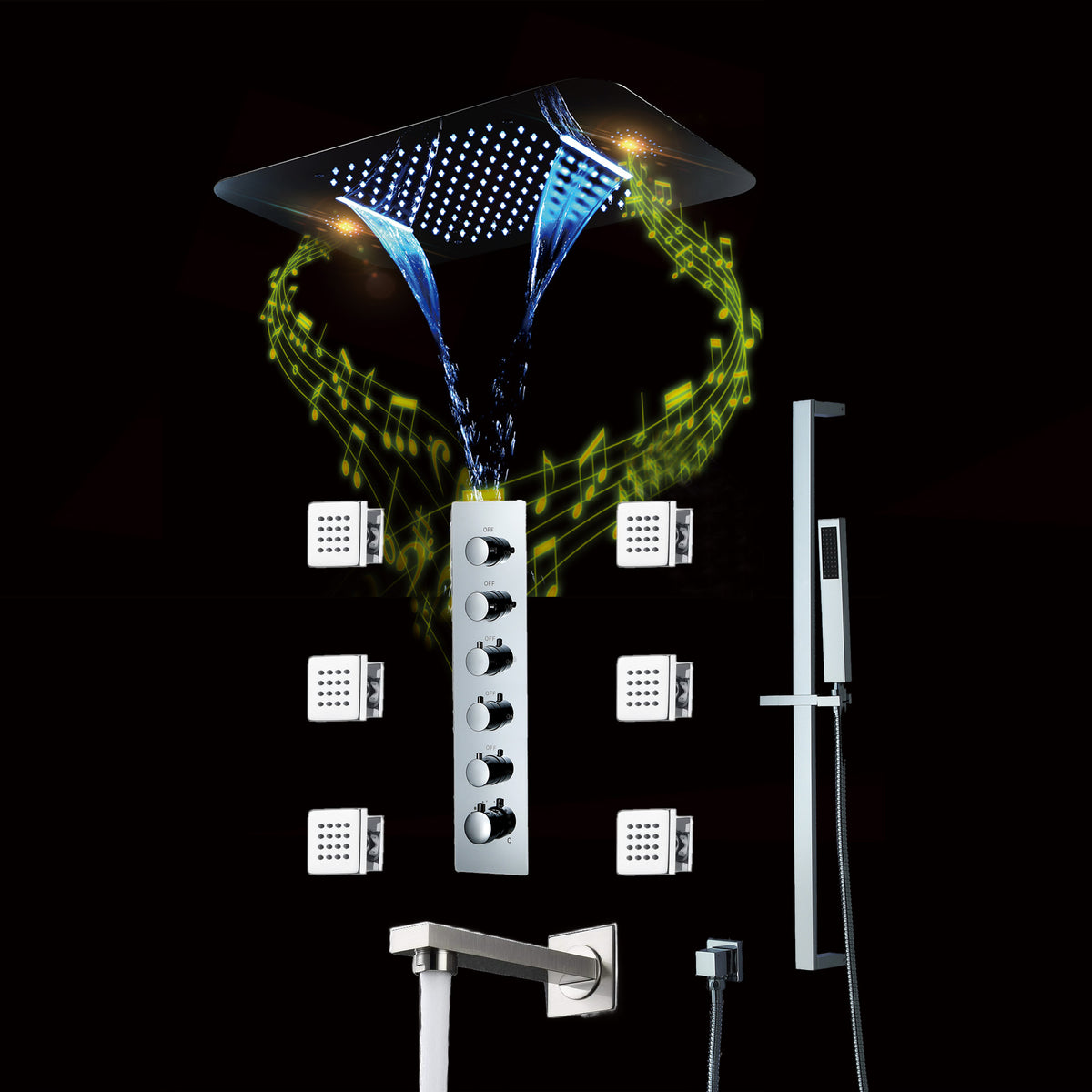 Brushed Gold Or Brushed Nickel Or Matte Black Or Chrome 23x15" LED Music Shower Head with 5-Way Thermostatic Faucet With Tub Spout
