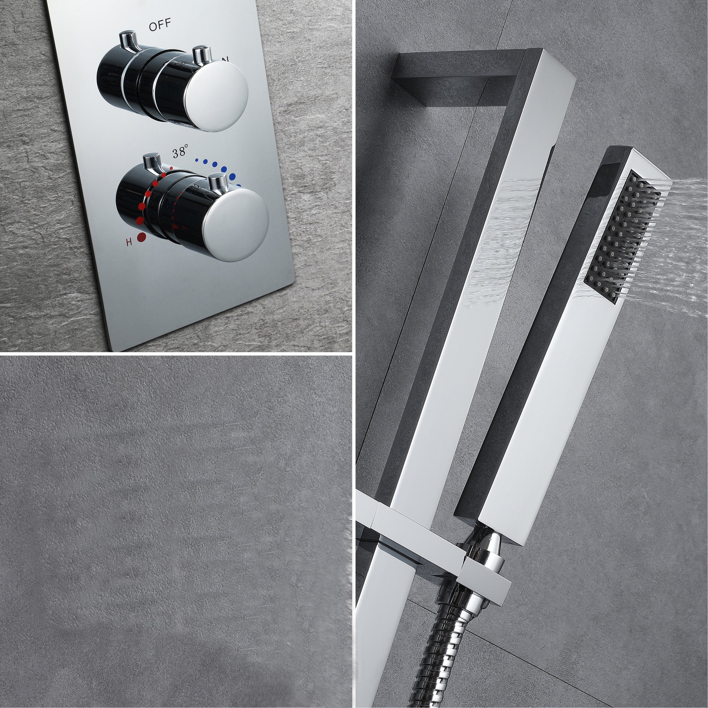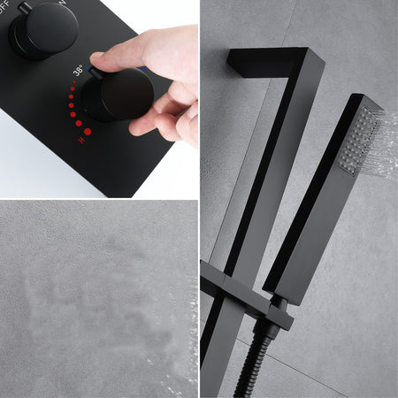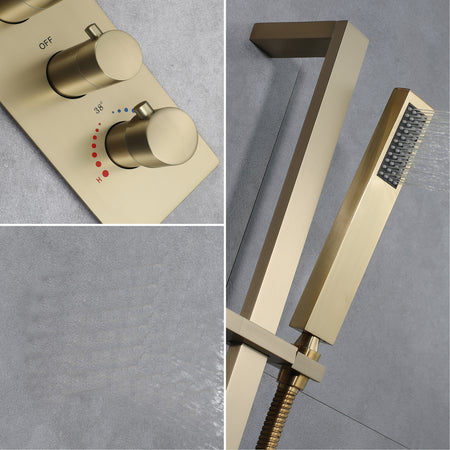 Water temperature and water flow are adjustable manually, allowing you to create your ideal shower conditions. The set also includes a brass handheld shower, a 59-inch shower hose, and six 2x2 inch brass body jets. Each function can operate simultaneously or separately, depending on your preference.