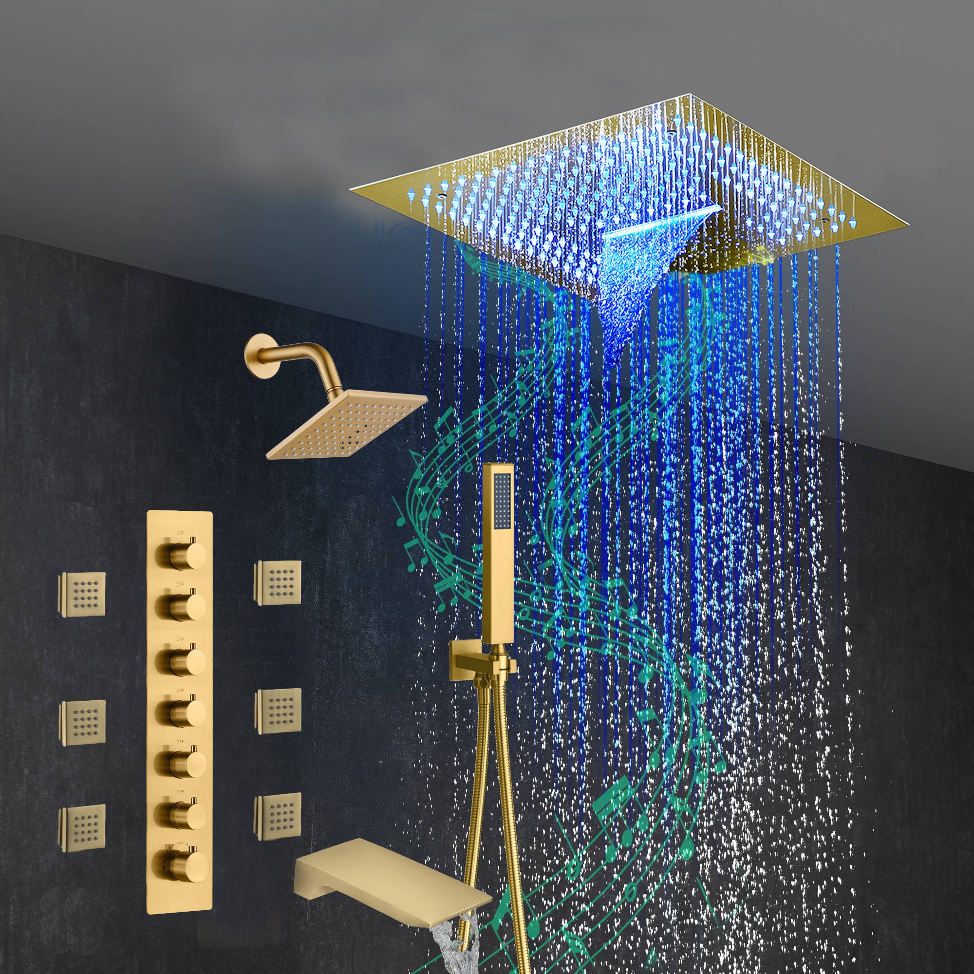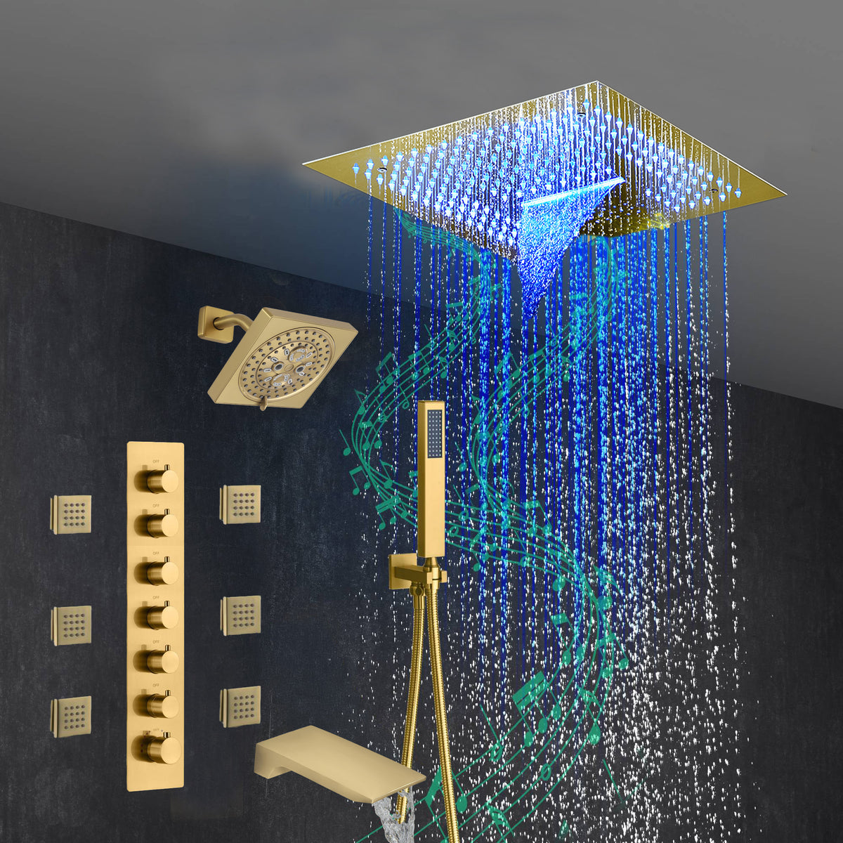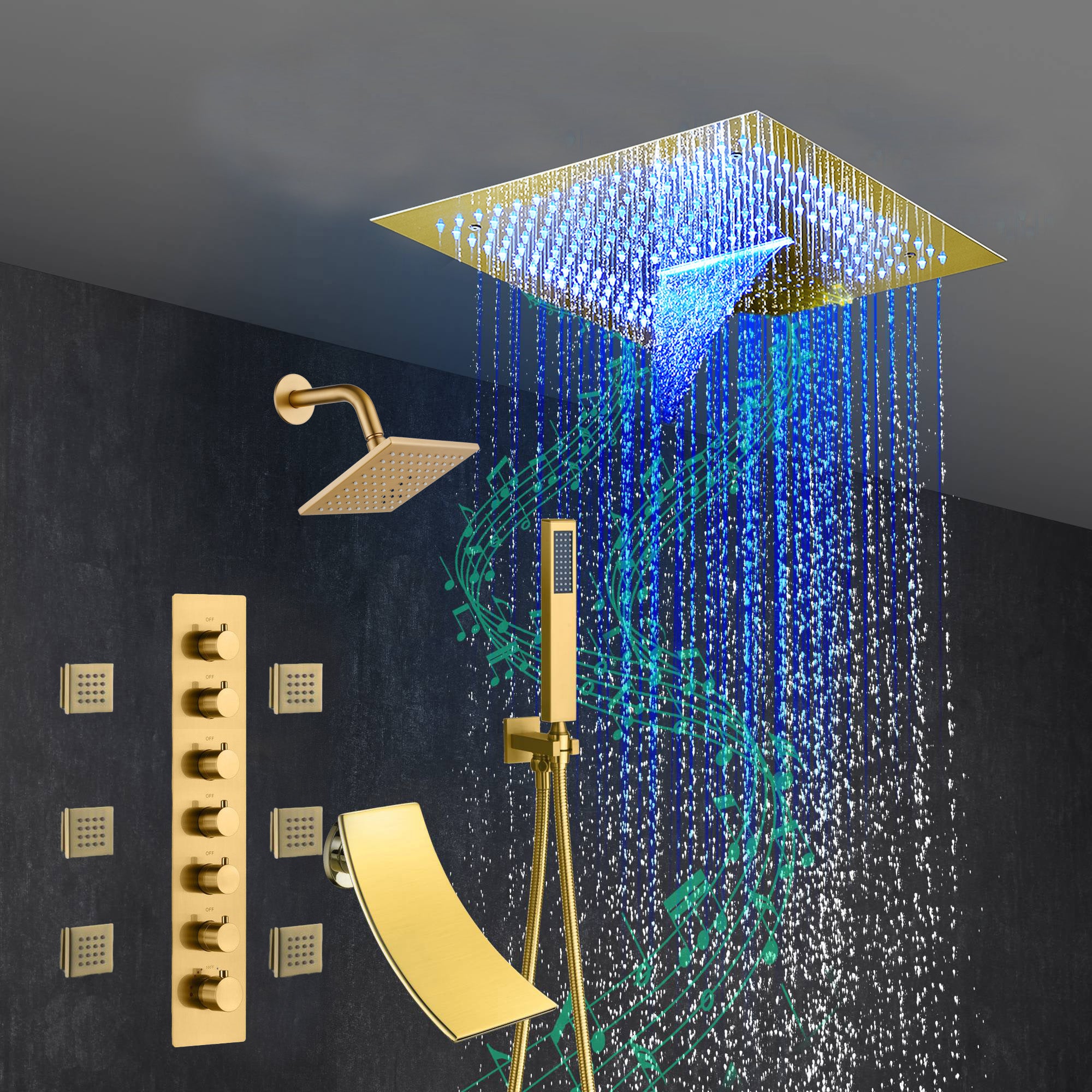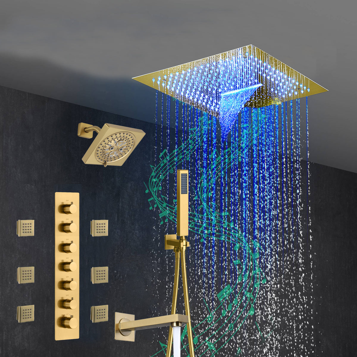 Presenting our state-of-the-art Brushed Gold 6-Way Thermostatic Shower Faucet featuring a Waterfall Tub Spout and a 16-inch 64 LED Lights Bluetooth Music Shower Head. This luxurious shower system combines superior functionality, safety, and cutting-edge technology to offer a shower experience like no other.