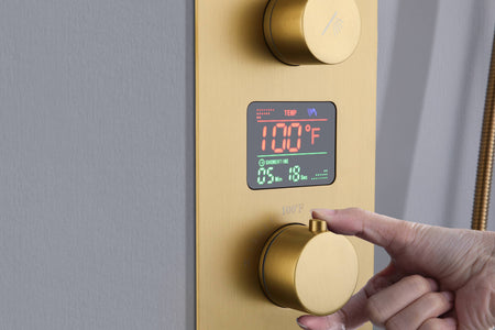 Transform your bathroom into a personal spa with our Brushed Gold 6-Way Thermostatic Shower Faucet. It offers an unrivaled blend of luxury, safety, and technology that redefines the showering experience.