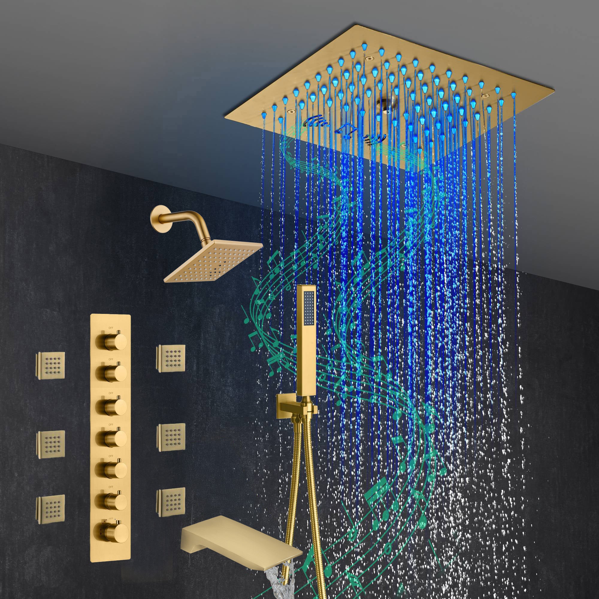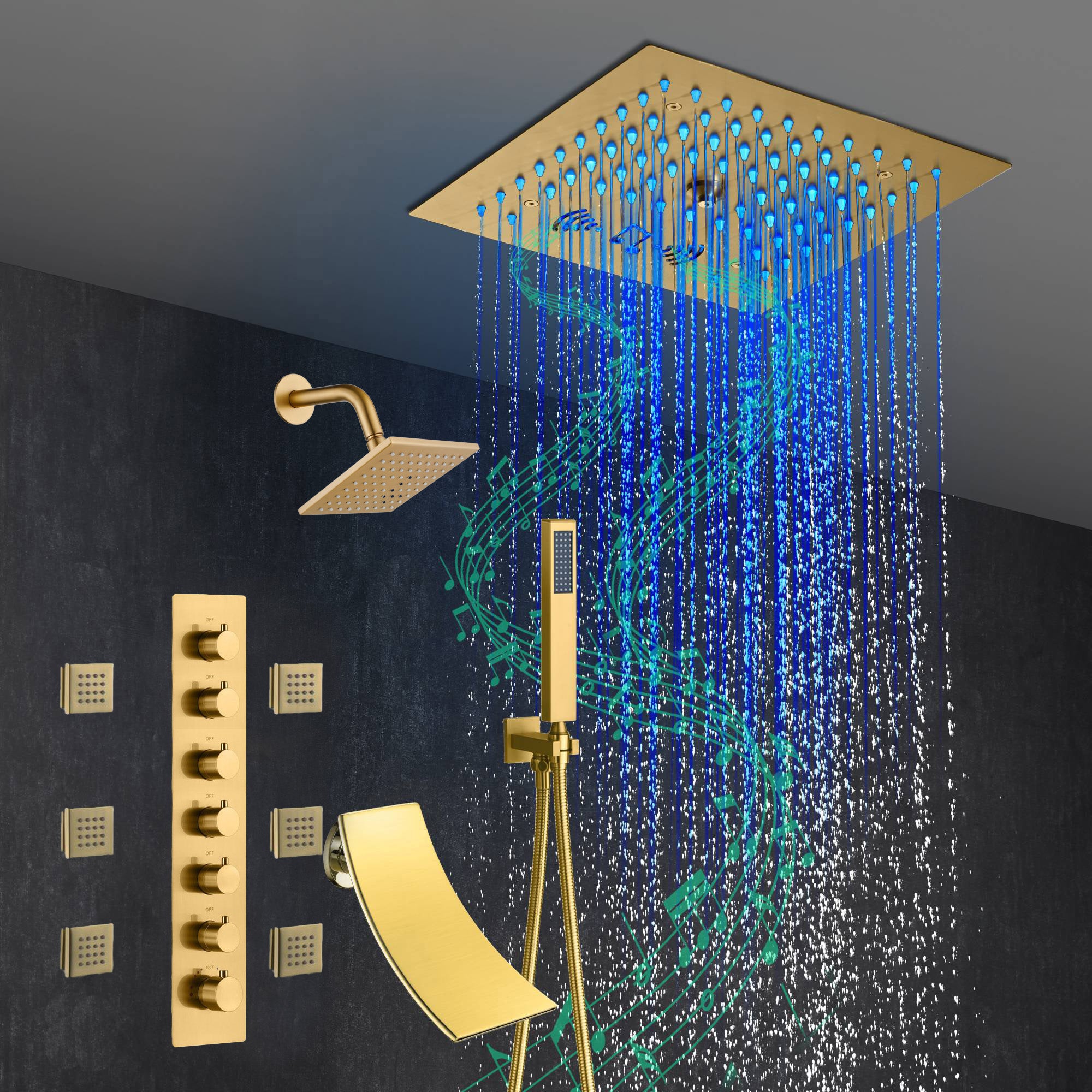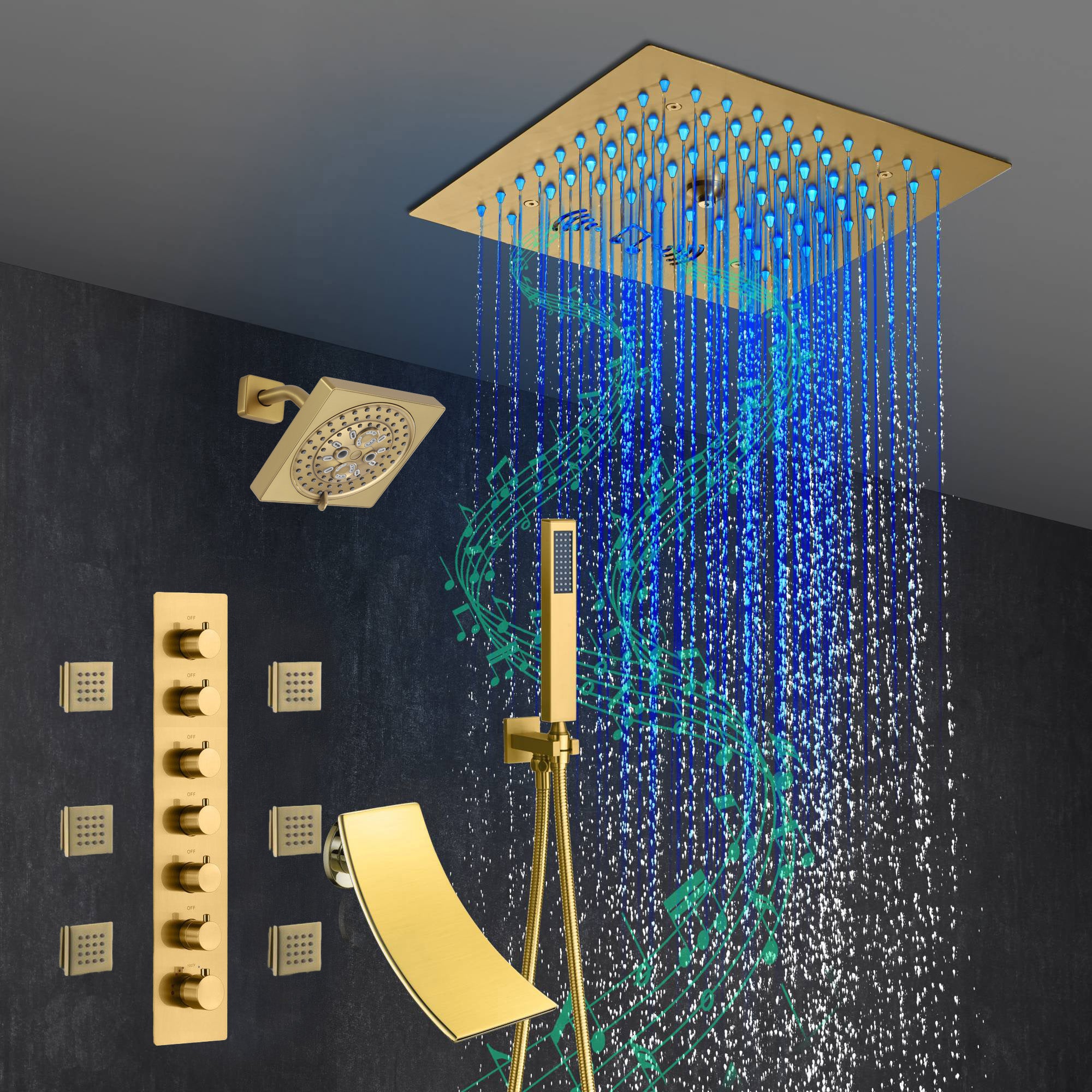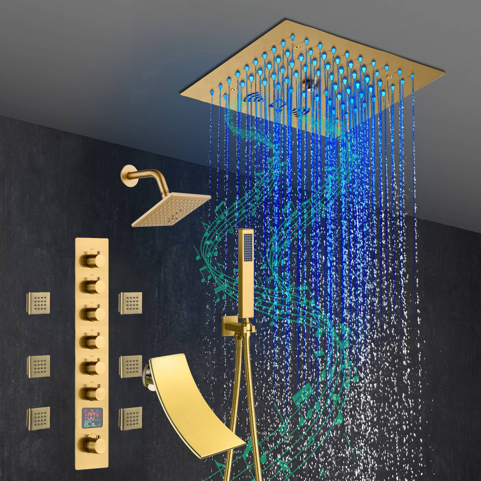 Presenting our state-of-the-art Brushed Gold 6-Way Thermostatic Shower Faucet featuring a Waterfall Tub Spout and a 12-inch 64 LED Lights Bluetooth Music Shower Head. This luxurious shower system combines superior functionality, safety, and cutting-edge technology to offer a shower experience like no other.