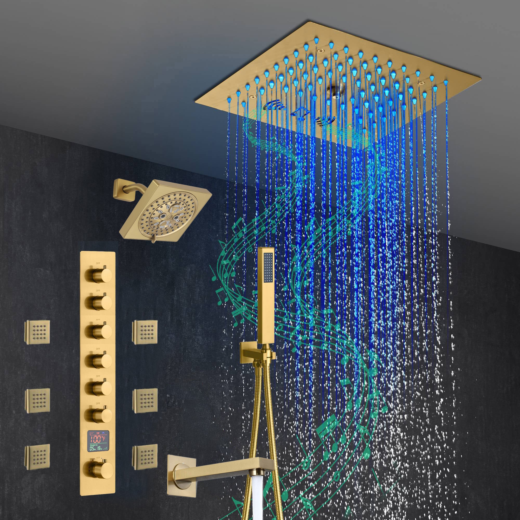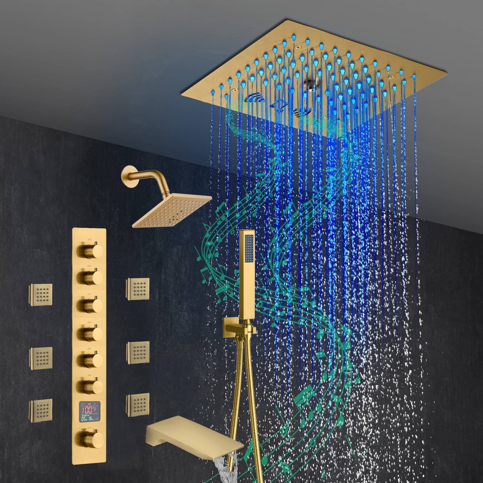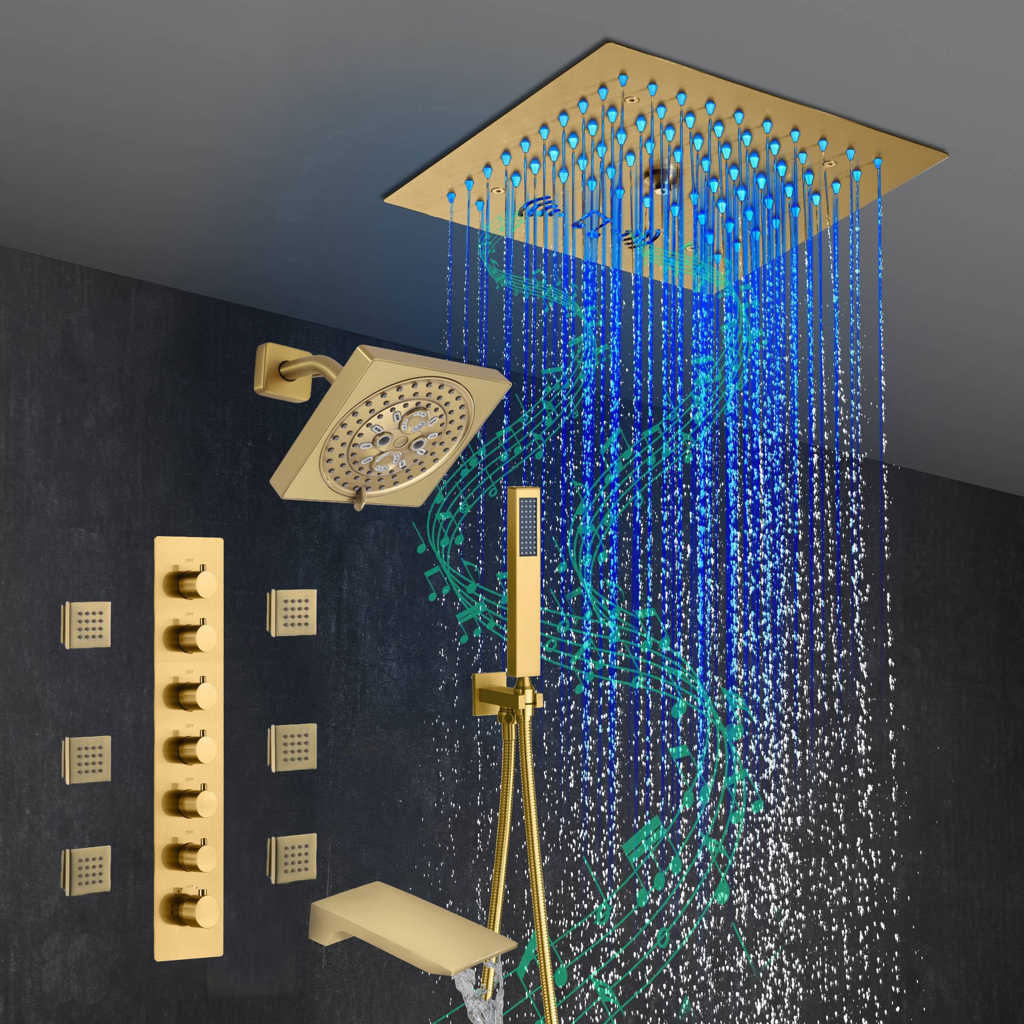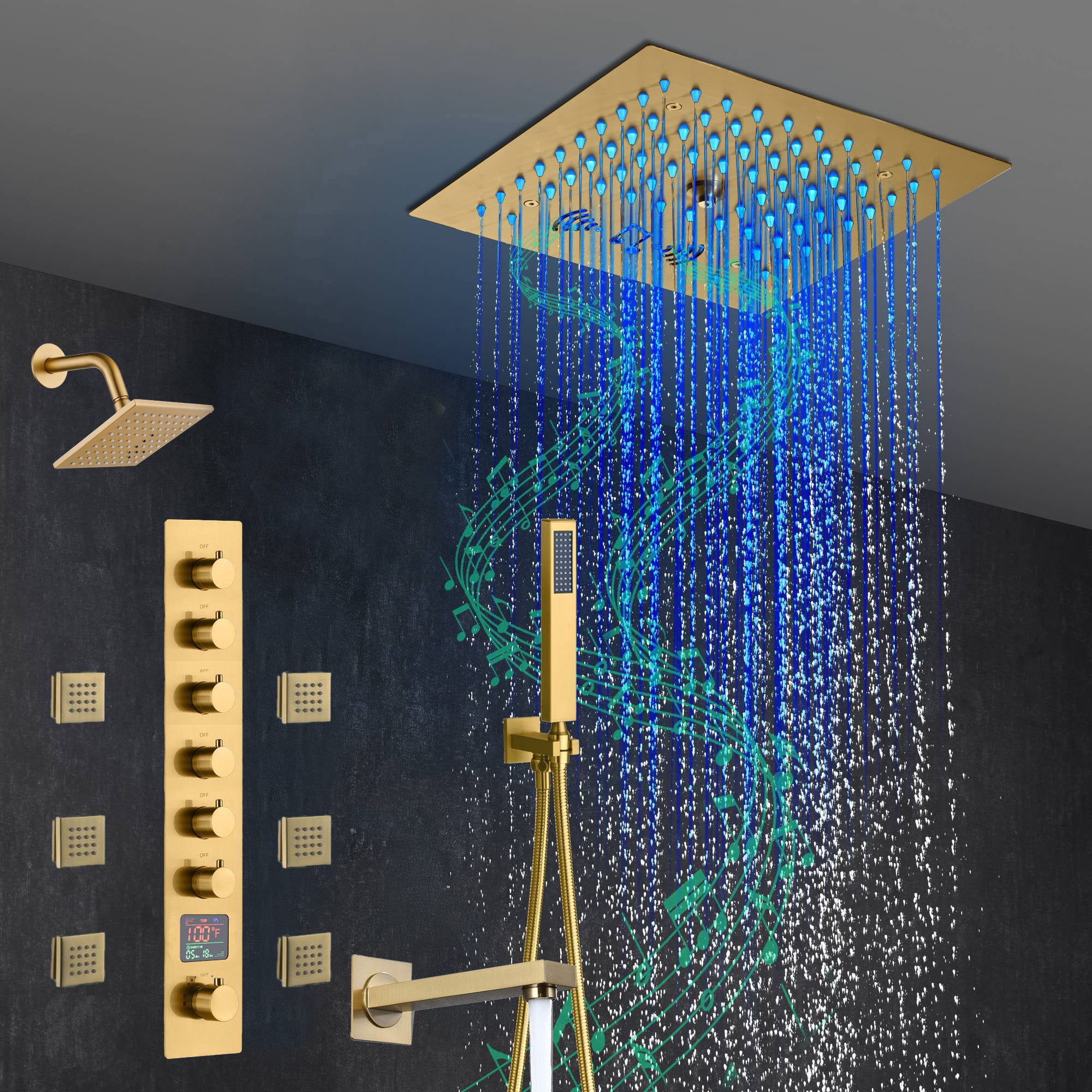 Presenting our state-of-the-art Brushed Gold 6-Way Thermostatic Shower Faucet featuring a Waterfall Tub Spout and a 12-inch 64 LED Lights Bluetooth Music Shower Head. This luxurious shower system combines superior functionality, safety, and cutting-edge technology to offer a shower experience like no other.